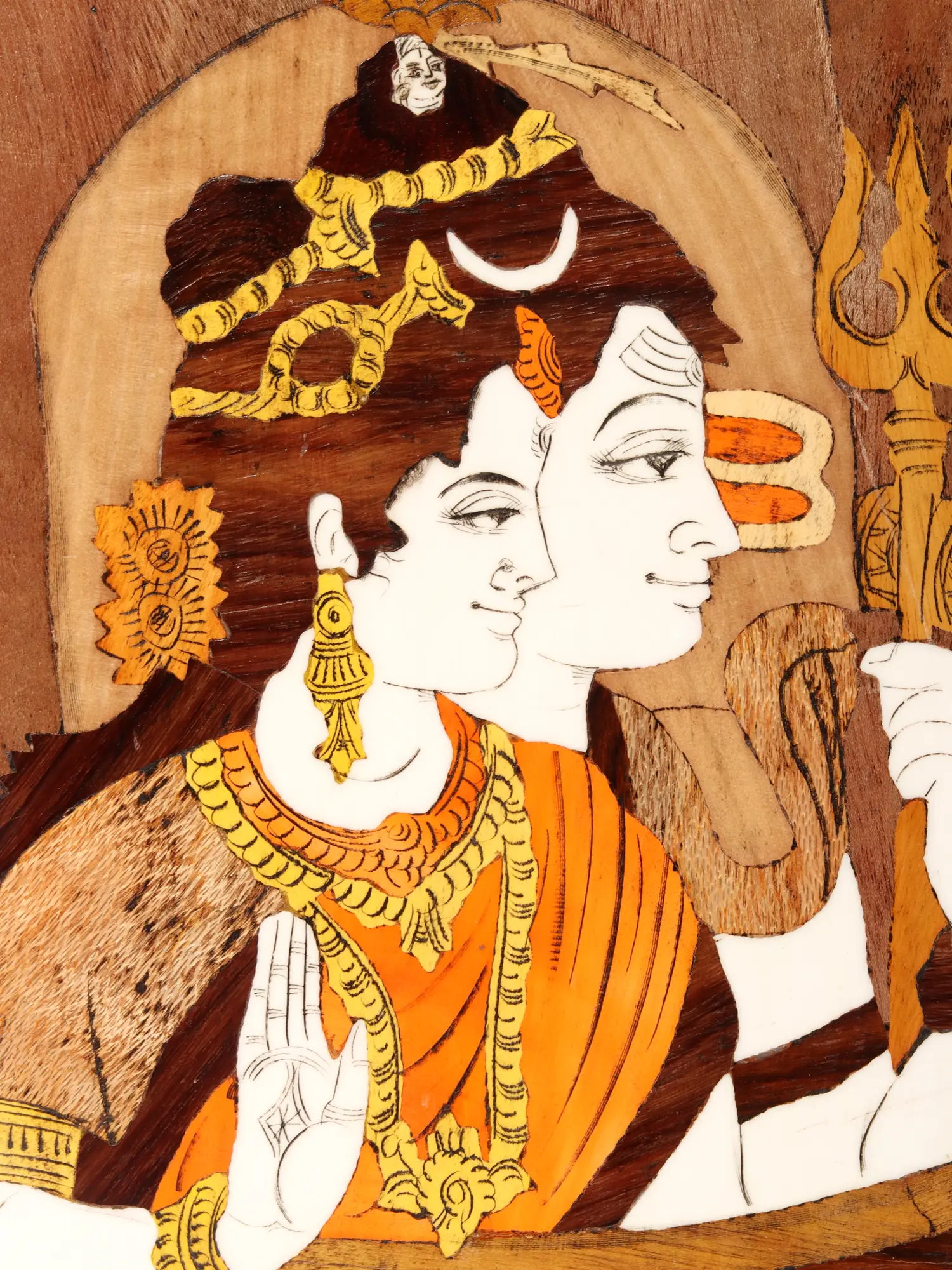 This captivating artwork, rendered in natural colours, depicts Lord Shiva and Goddess Parvati united near the Shivalinga. The natural tones create a sense of reverence and connection to the divine. The artist's use of simple lines and subtle shading allows the focus to be on the harmonious presence of these deities. This piece embodies the philosophy of Ardhanarishwara, the embodiment of the divine masculine and feminine existing as one.