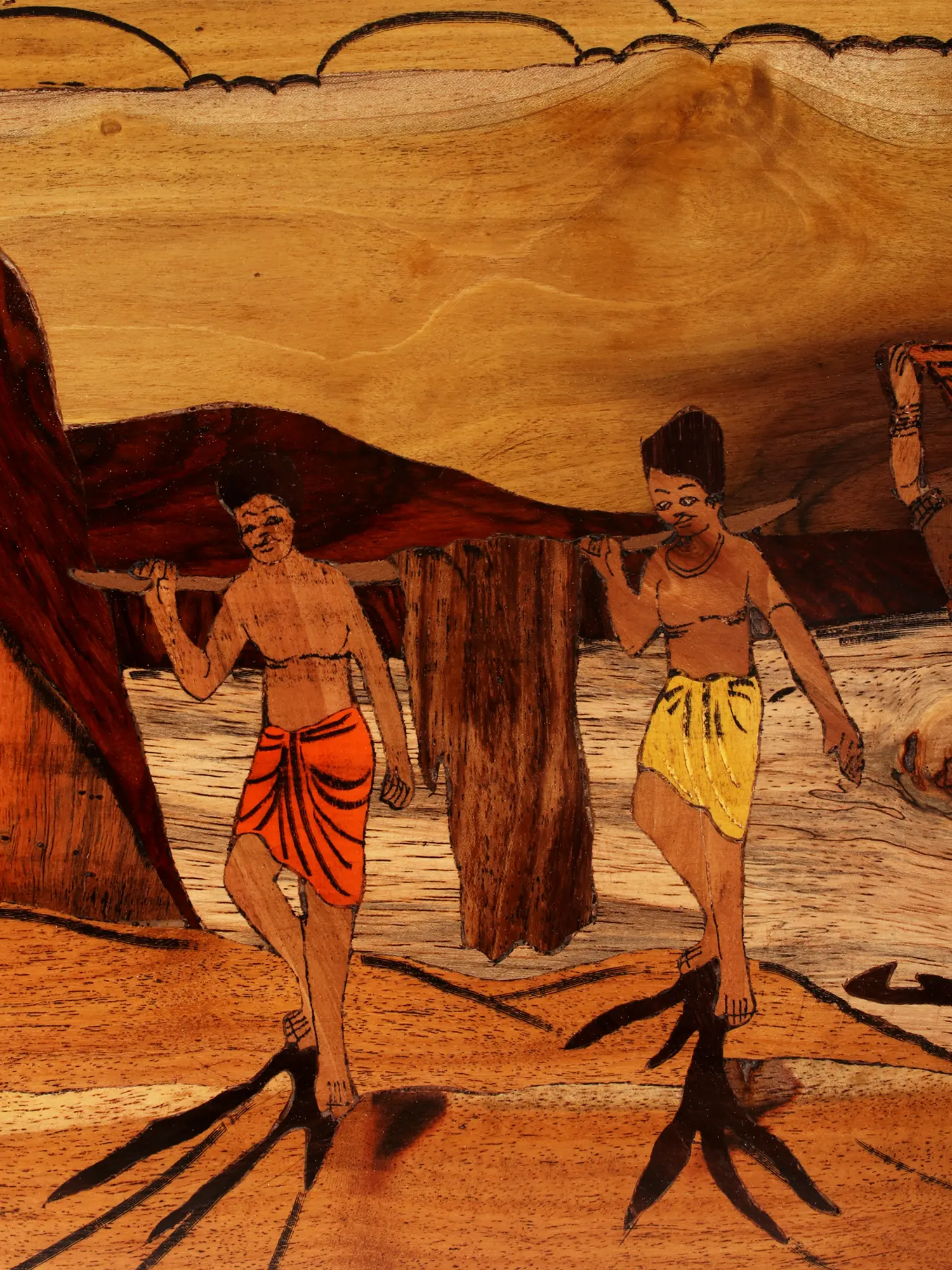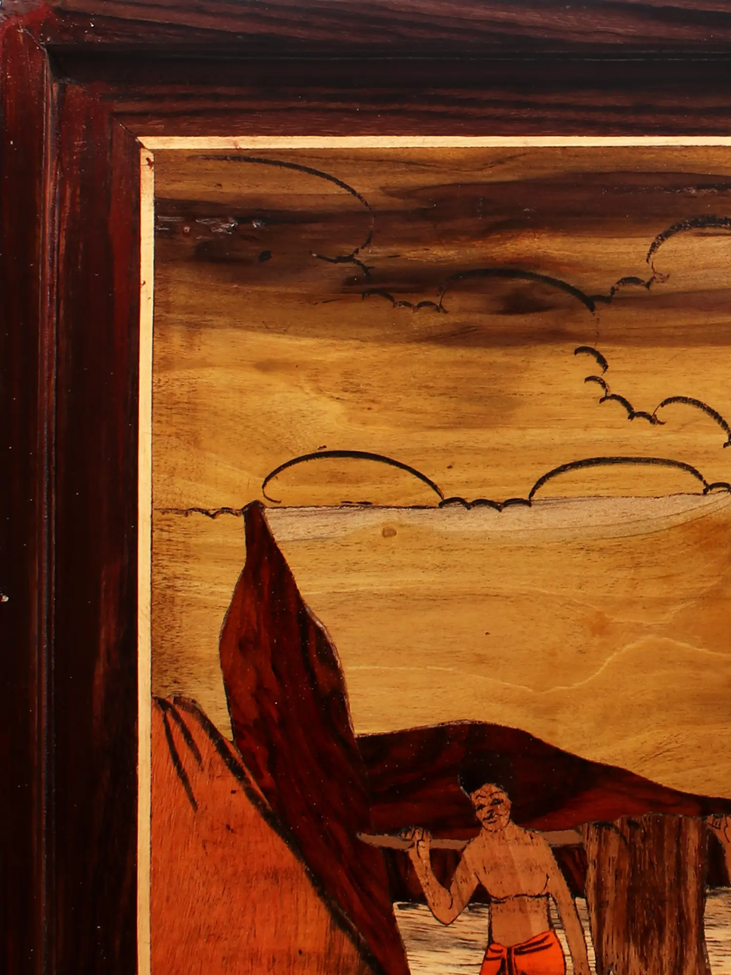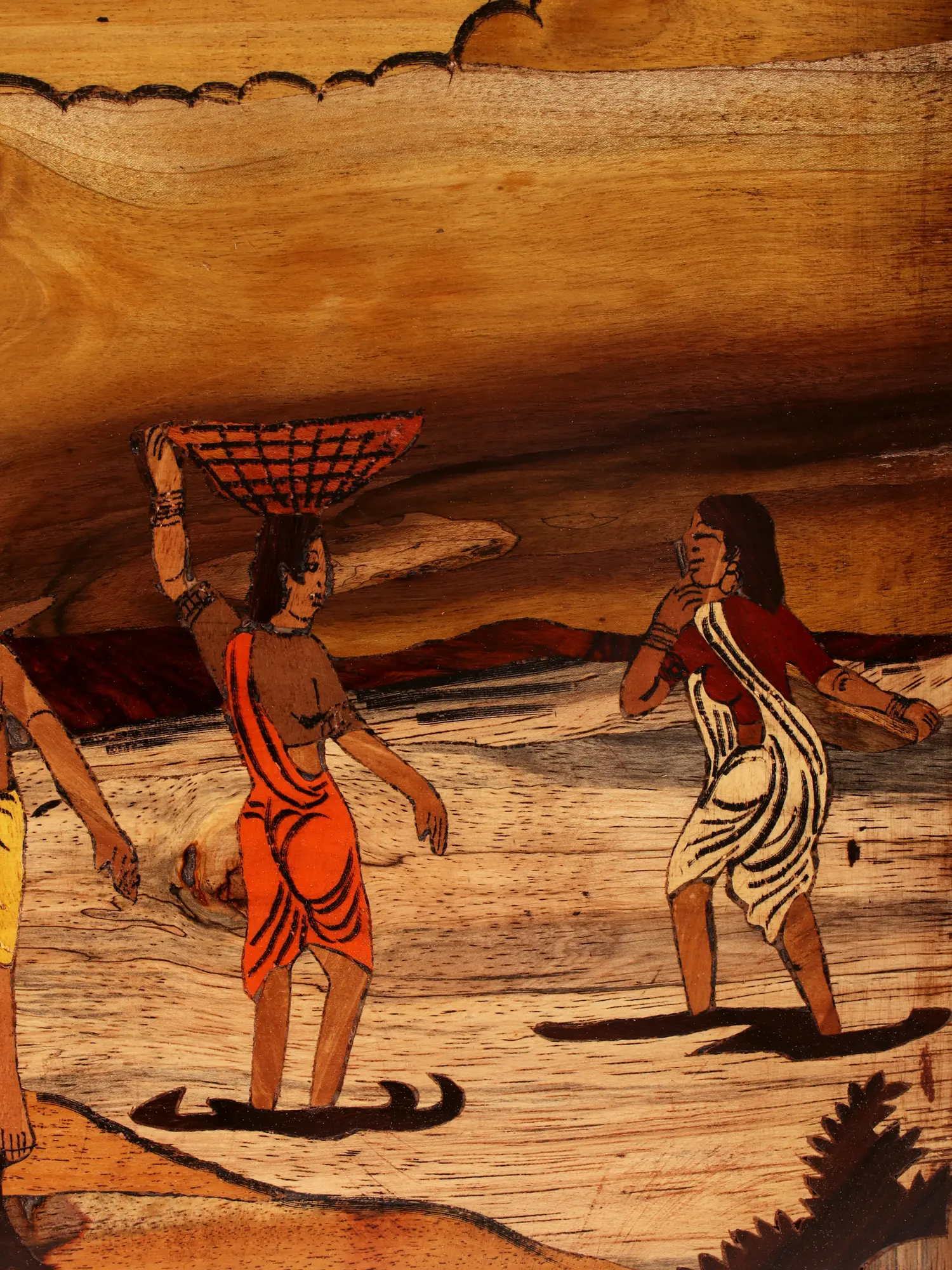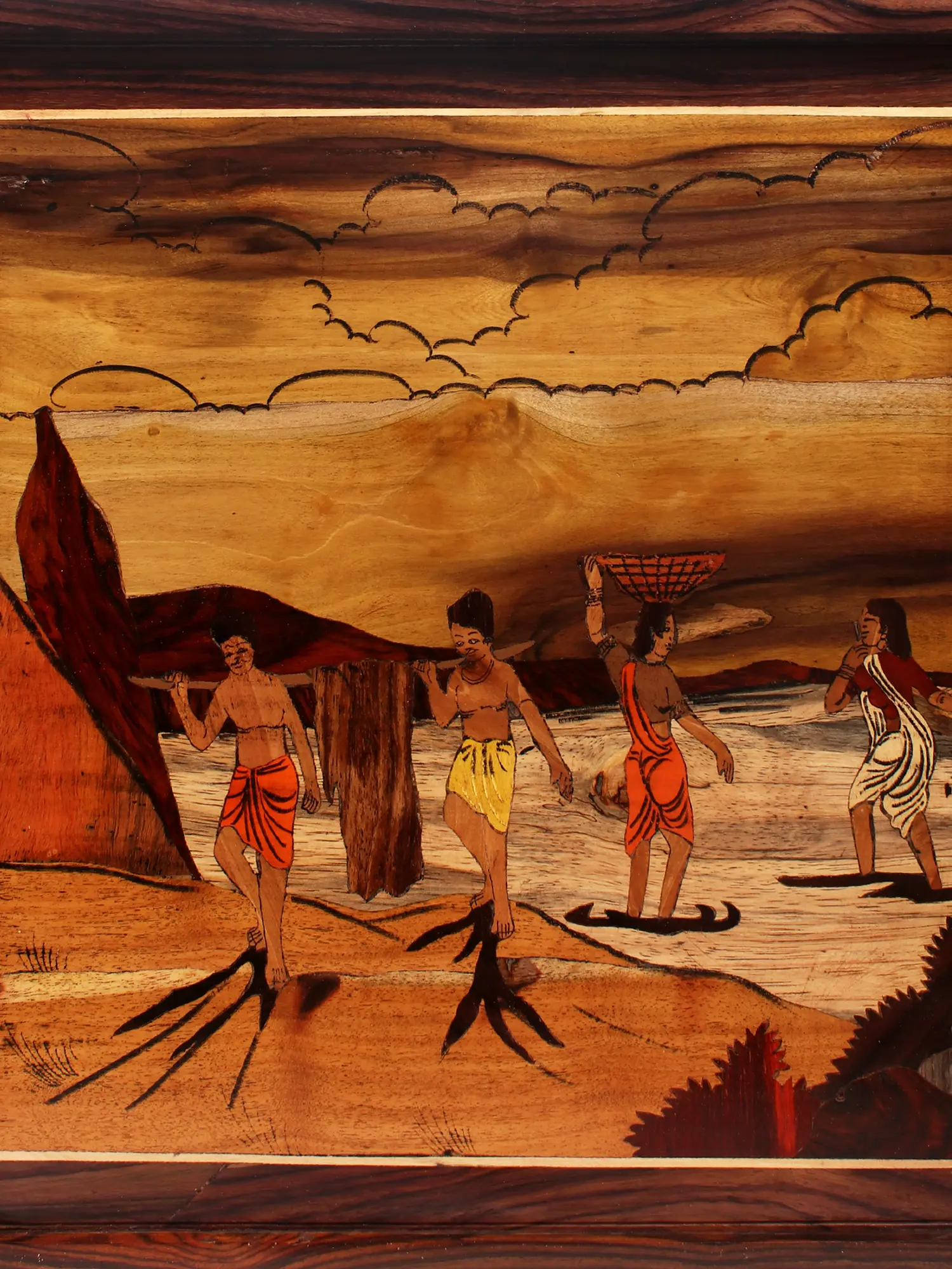 This Rosewood Panel with Inlay Work, portraying fisheries activities with women fishing and men carrying nets, is a visual ode to coastal livelihoods. The vibrant inlay work adds a captivating touch, bringing the scene to life. Beautiful wooden tones and the skillful use of vibrant colors enhance the panel's aesthetic appeal, capturing the vibrancy of fishing communities. The intricate detailing on the panel not only celebrates the craftsmanship but also pays homage to the cultural significance of coastal life, making it a poignant and visually stunning representation of the activities that sustain these communities.