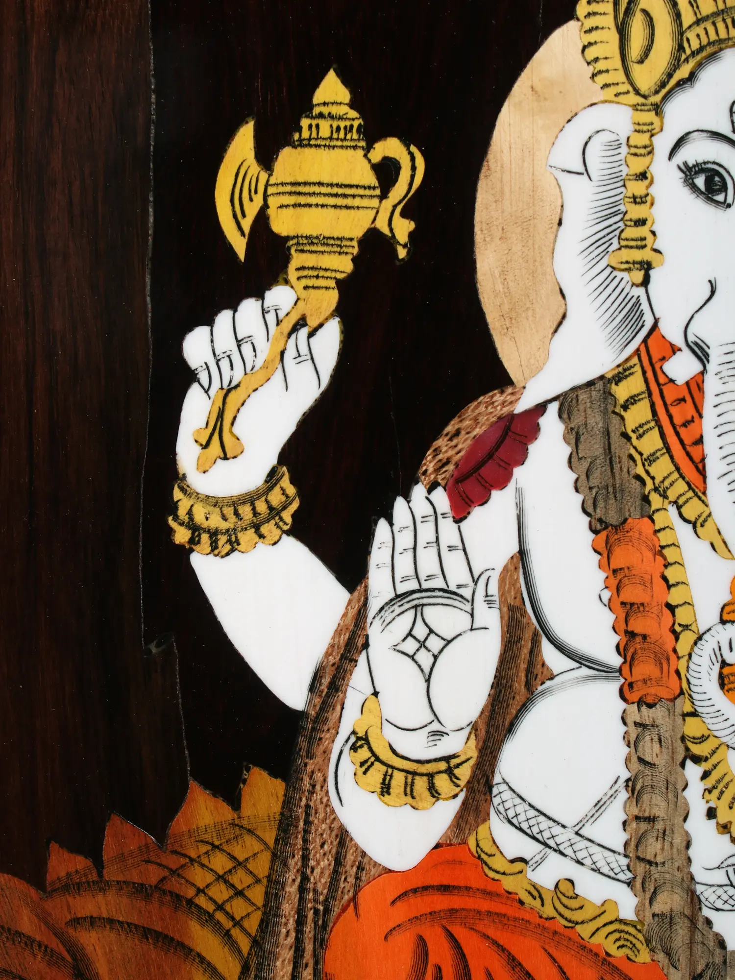 19" Lord Ganesha With Mushaka | Natural Color On Wood Panel With Inlay Work