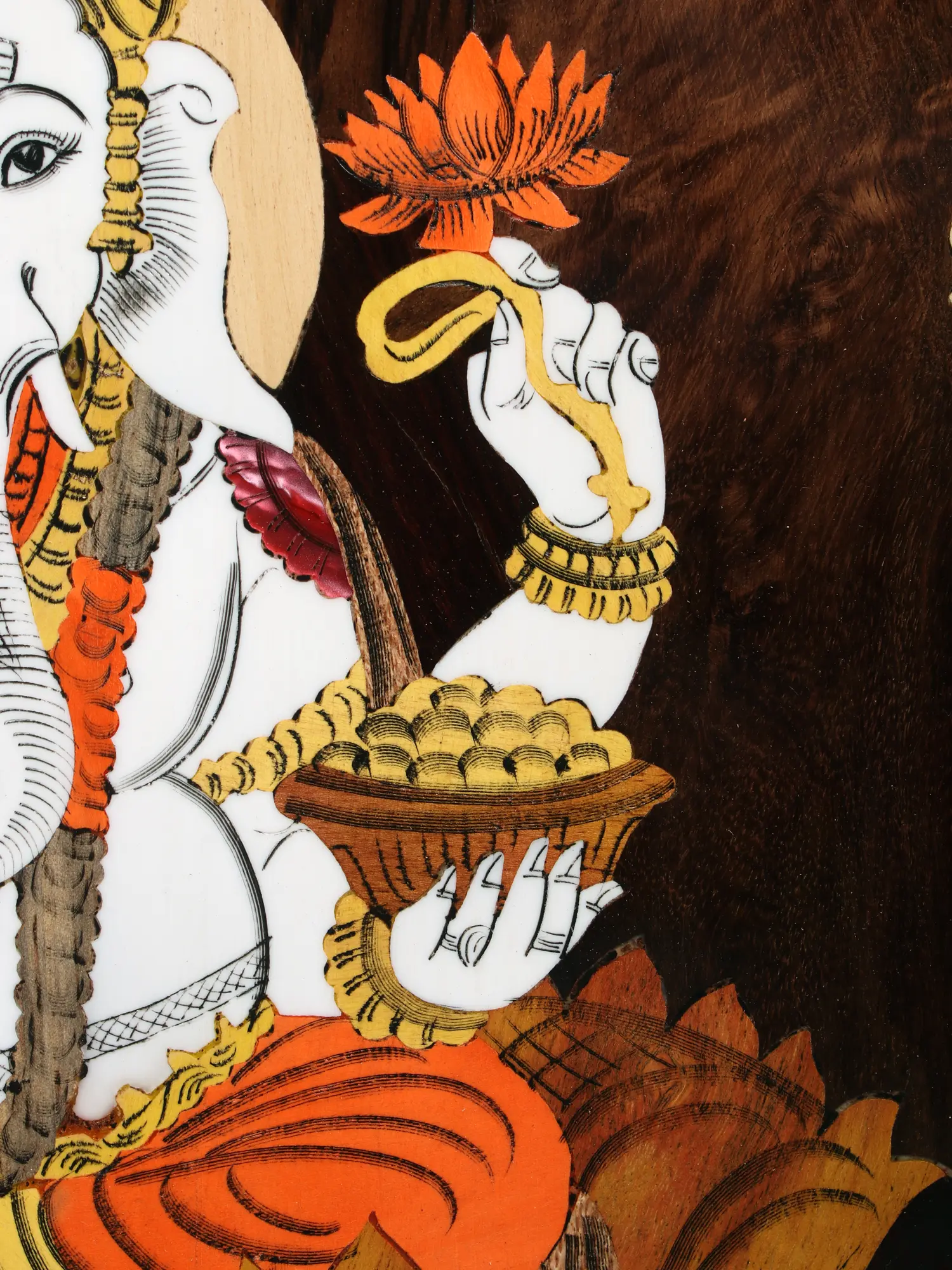 Immerse yourself in the divine presence of Lord Ganesha with this exquisitely crafted wooden panel. The panel presents a captivating depiction of Ganesha, the elephant-headed deity revered as the remover of obstacles, the patron of arts and sciences, and the deva of intellect and wisdom. Ganesha is easily identifiable by his elephant head, a symbol of wisdom and intelligence, which he acquired when Lord Shiva mistakenly beheaded him and later replaced his head with that of an elephant. He is often depicted with a large belly, signifying his ability to digest all of life's joys and sorrows. His large ears symbolize his ability to listen to the prayers of his devotees, while his single tusk signifies his ability to overcome all obstacles. Ganesha is widely worshipped at the beginning of rituals and ceremonies, as he is believed to clear the path for success and prosperity. His name is invoked before undertaking any new venture, seeking his blessings for a smooth and fruitful journey.