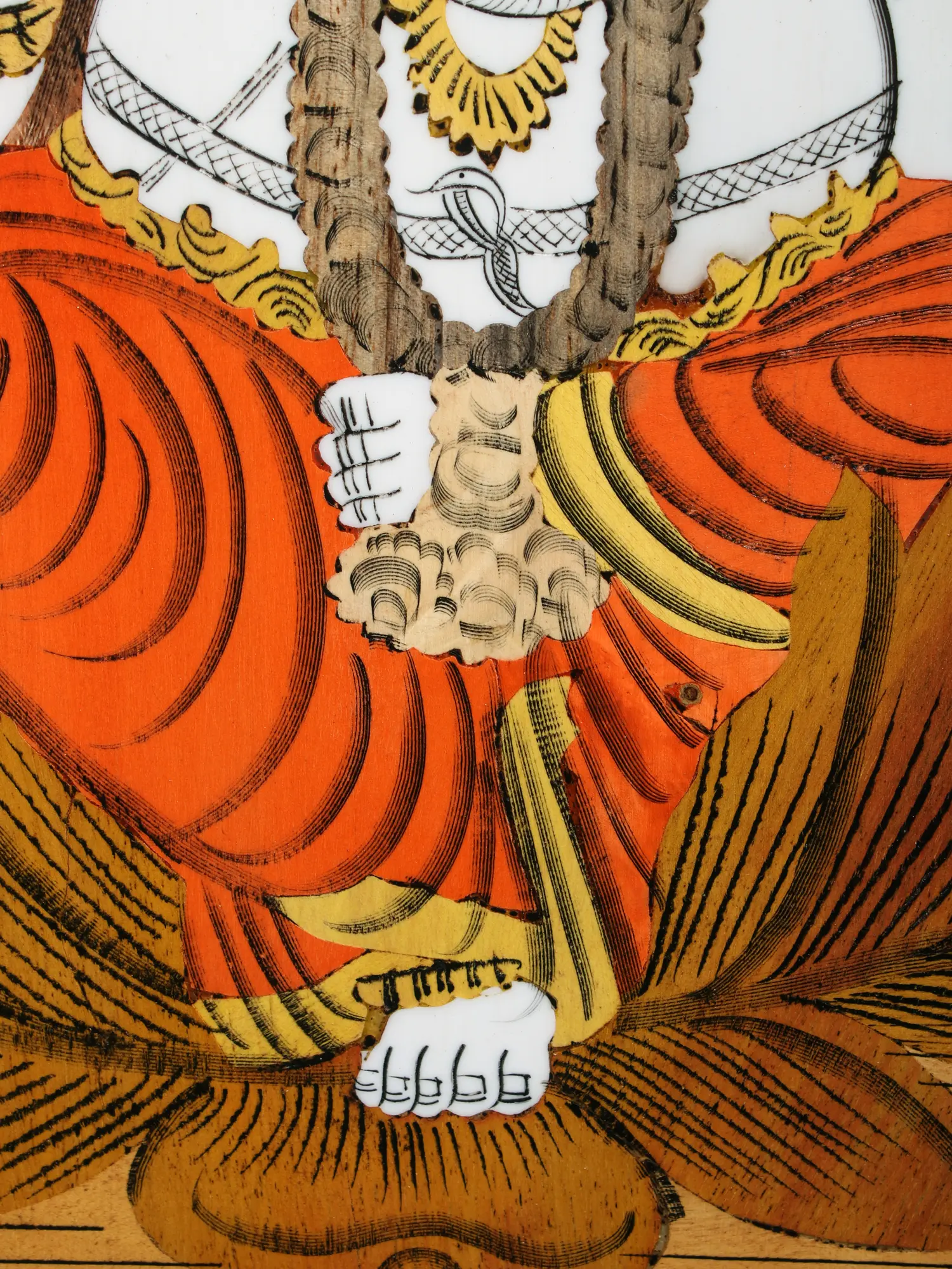 This piece embodies the spirit of Ganesha, a perfect addition to your sacred space, bringing with it the blessings of wisdom, prosperity, and the removal of obstacles. The rich colors and the intricate details will add a touch of elegance and divinity to any room. It is an invitation to contemplate the deeper meanings of life and to connect with the divine presence that resides within us all.