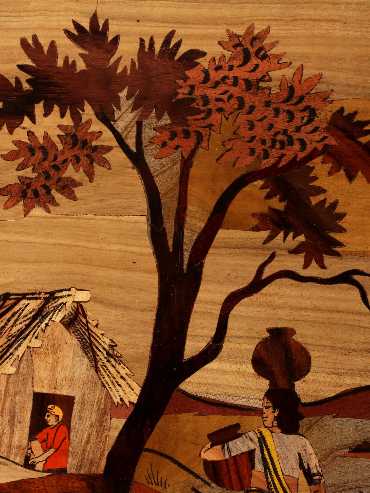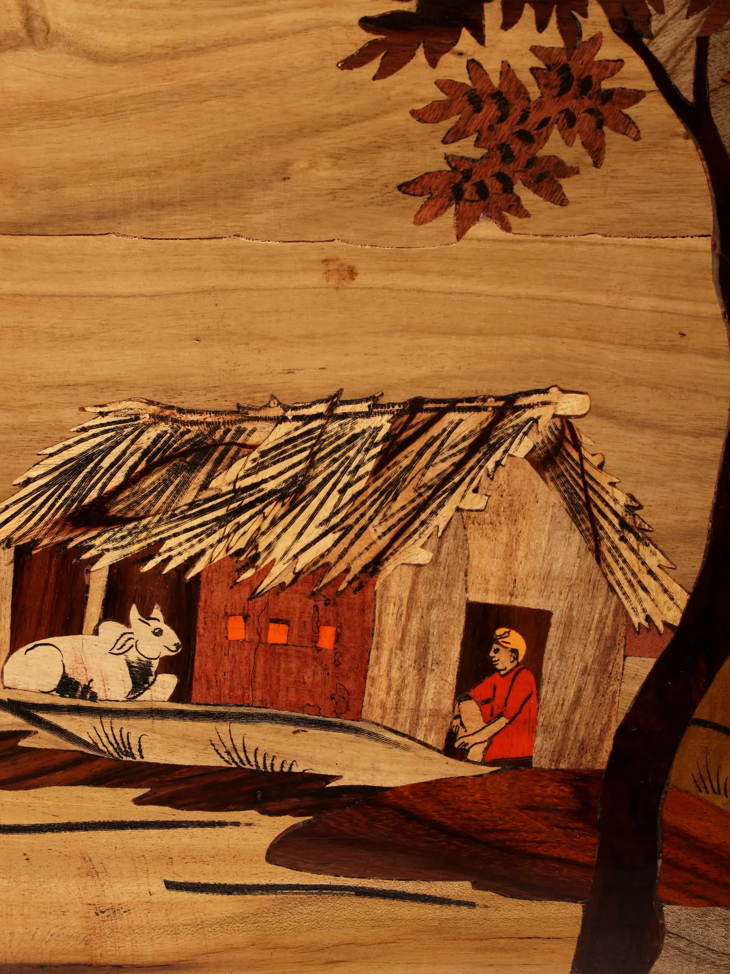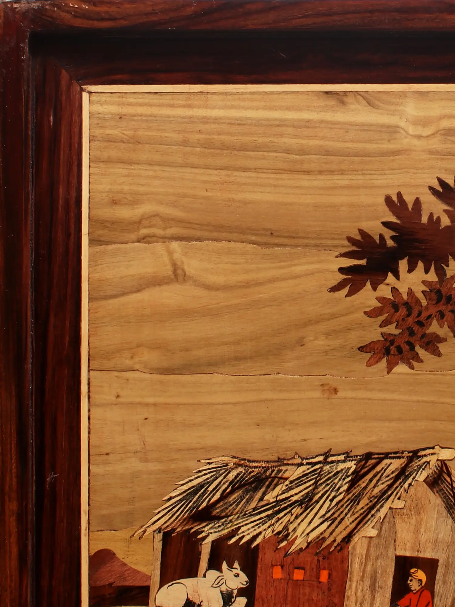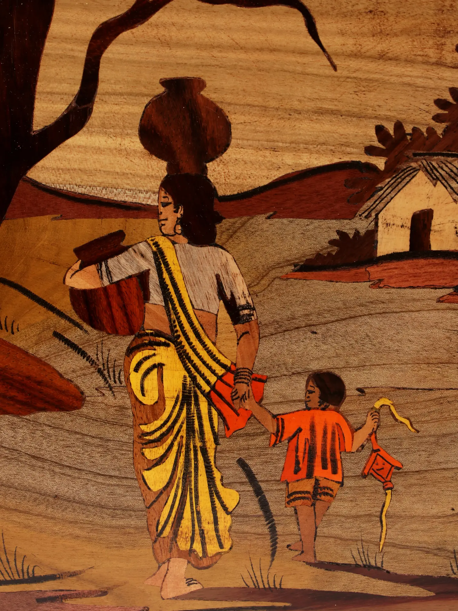 This enchanting moment is immortalized on a Rosewood Panel with Inlay work, capturing the intricacies of the scene. Delicate craftsmanship brings to life the mother's tender touch, the child's innocent joy, and the timeless allure of the village, making it an everlasting ode to simplicity and love.