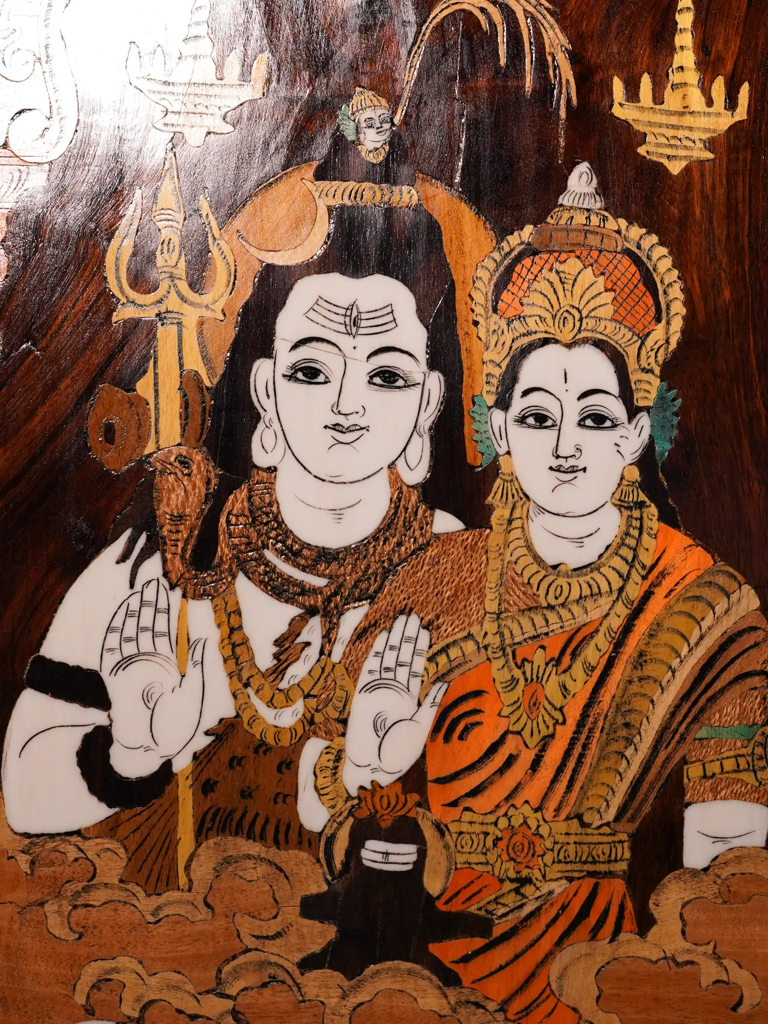 Crafted with natural colors on a wood panel using the traditional Mysore inlay technique, this piece exemplifies the richness of Indian artistry. Mysore inlay work is renowned for its intricate detailing and the harmonious blend of materials. The natural wood grain serves as a beautiful canvas, enhancing the artwork's visual appeal. The meticulous inlay work elevates the piece, lending it a unique texture and depth. Each carefully placed element contributes to the overall elegance and refinement, making it a true collector's item and a precious heirloom. The colors used are carefully chosen to bring out the essence of the divine couple, infusing the panel with a warm and inviting aura. The attention to detail in depicting their attire, adornments, and facial expressions reflects the artisan's profound respect for the deities and their desire to capture their divine qualities in a tangible form. This artwork, in its form and execution, offers a window into the rich cultural heritage of India and its devotion to artistry and spirituality.