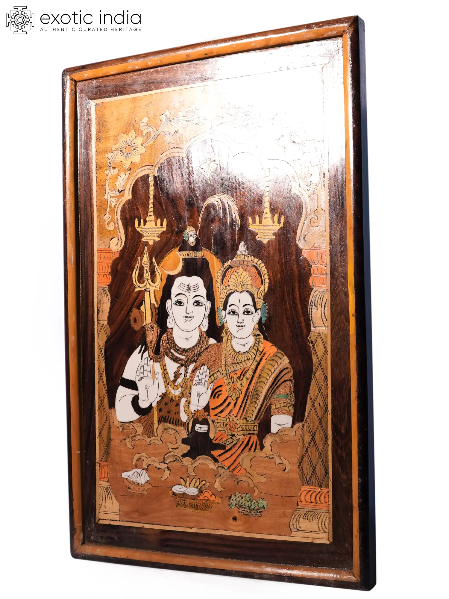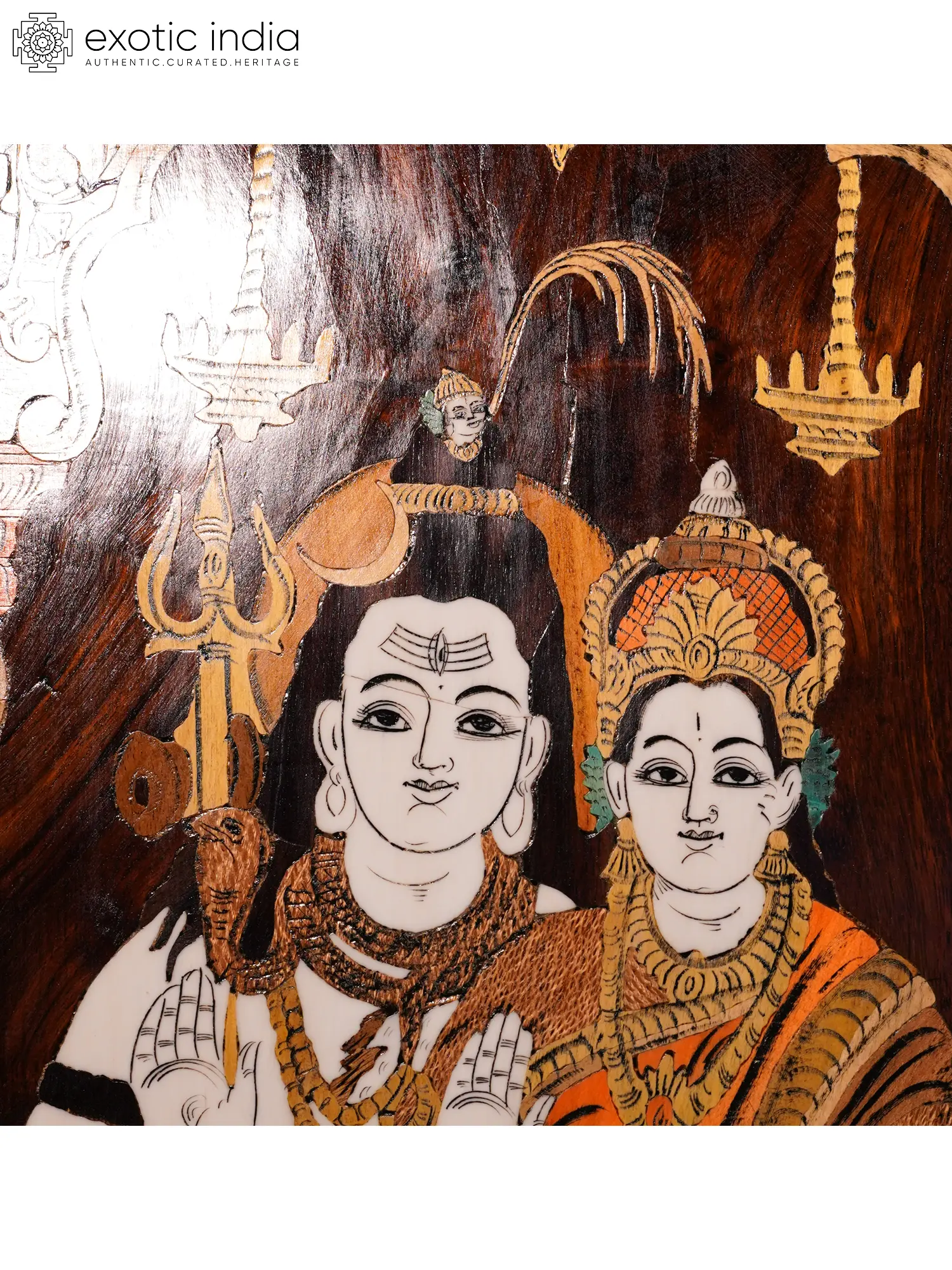 21" Attractive Couple Of Lord Shiva And Goddess Parvati | Natural Color On Wood Panel With Inlay Work