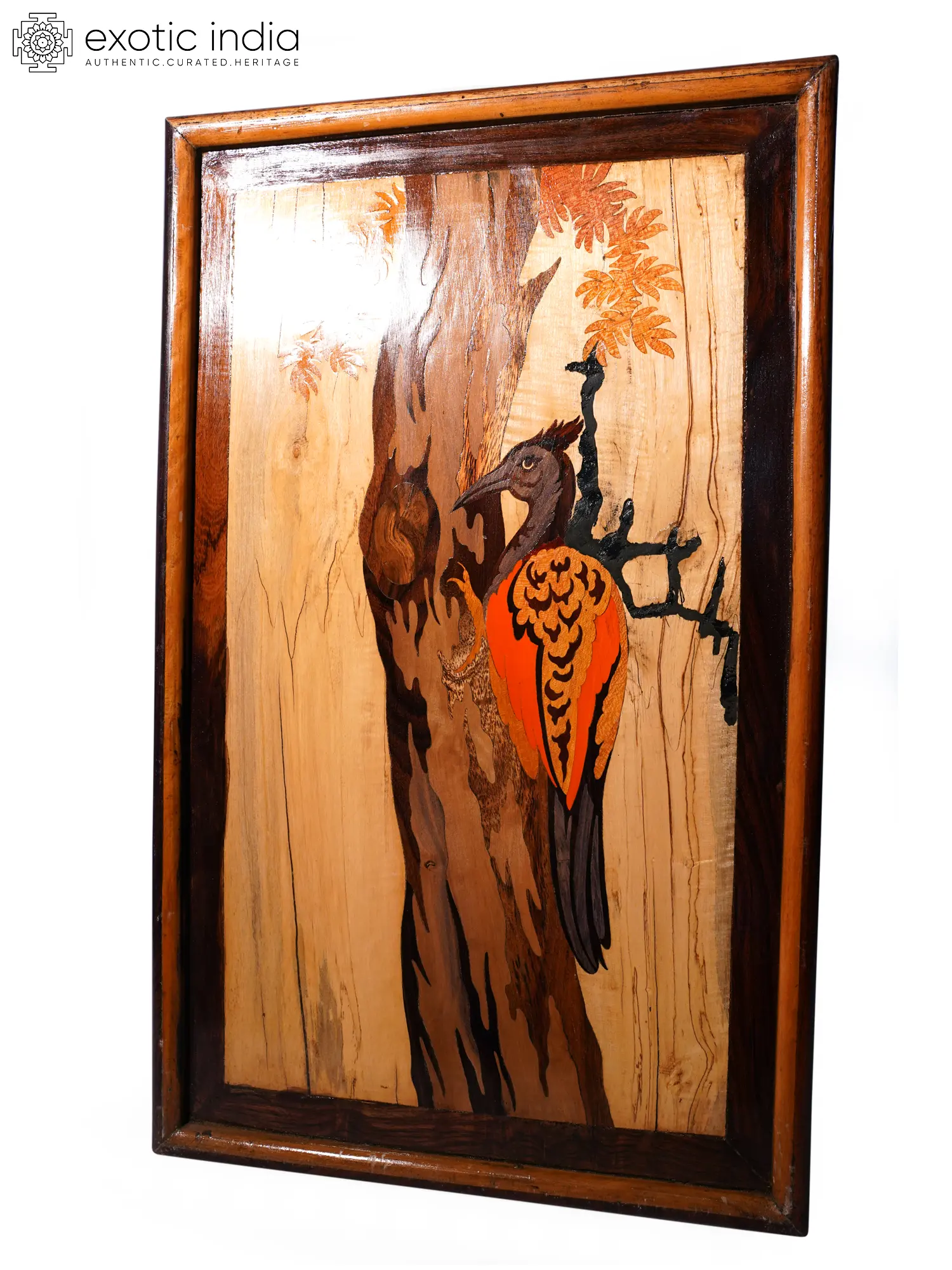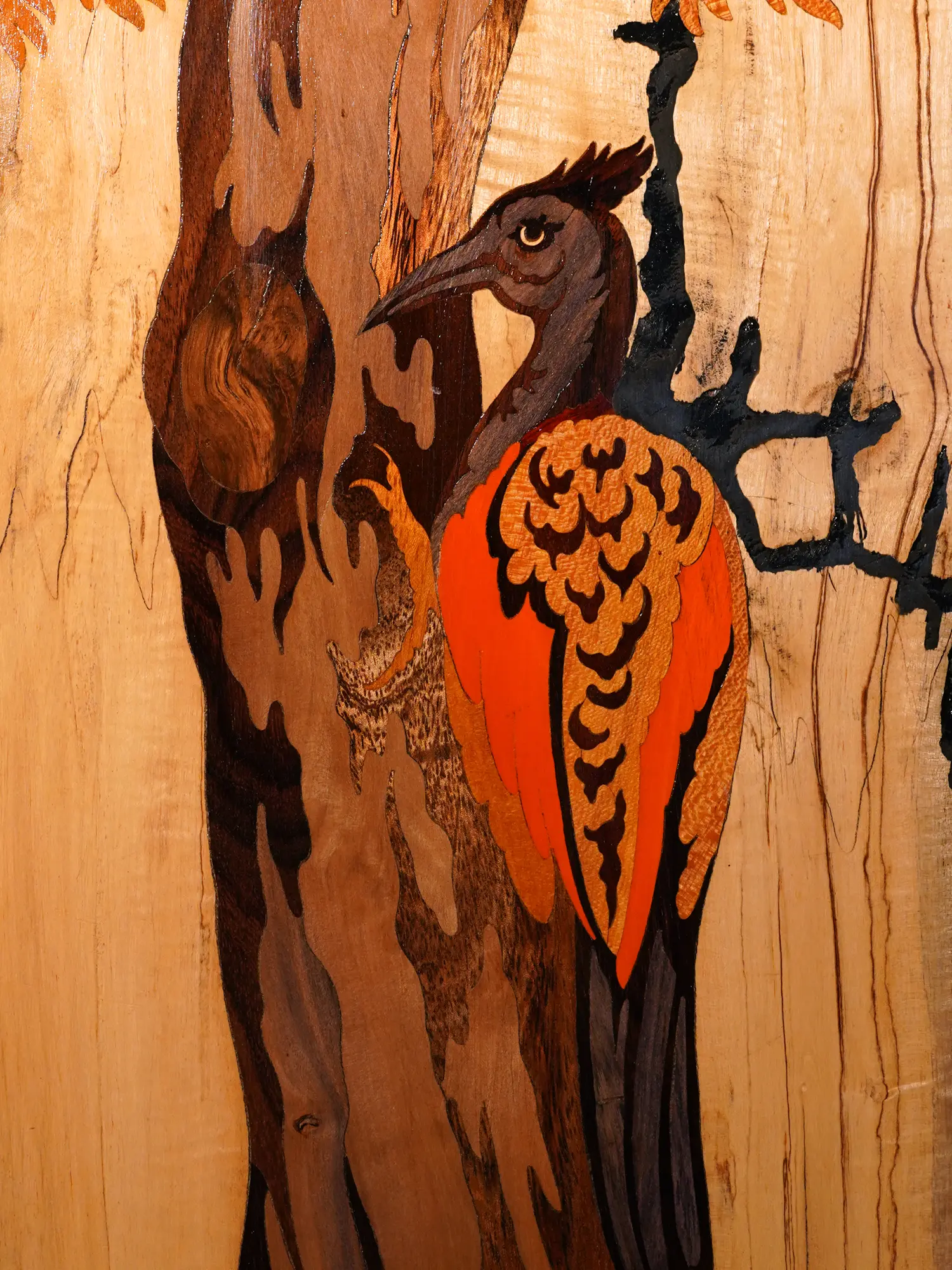 21" Woodpecker On Tree | Natural Color On Wood Panel With Inlay Work