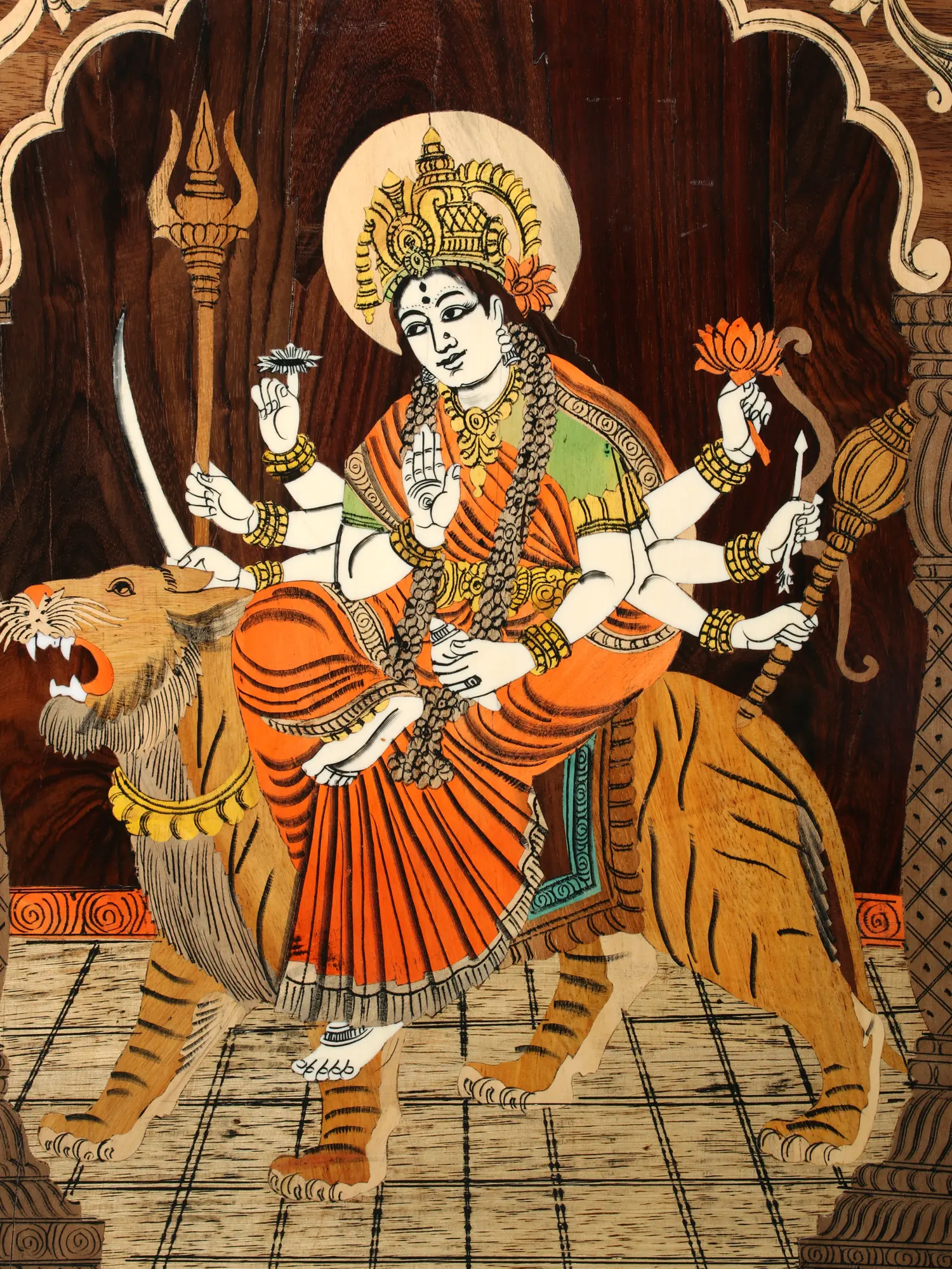 24" Ashtabhuja Goddess Durga | Natural Color On Inlay Wood Painting