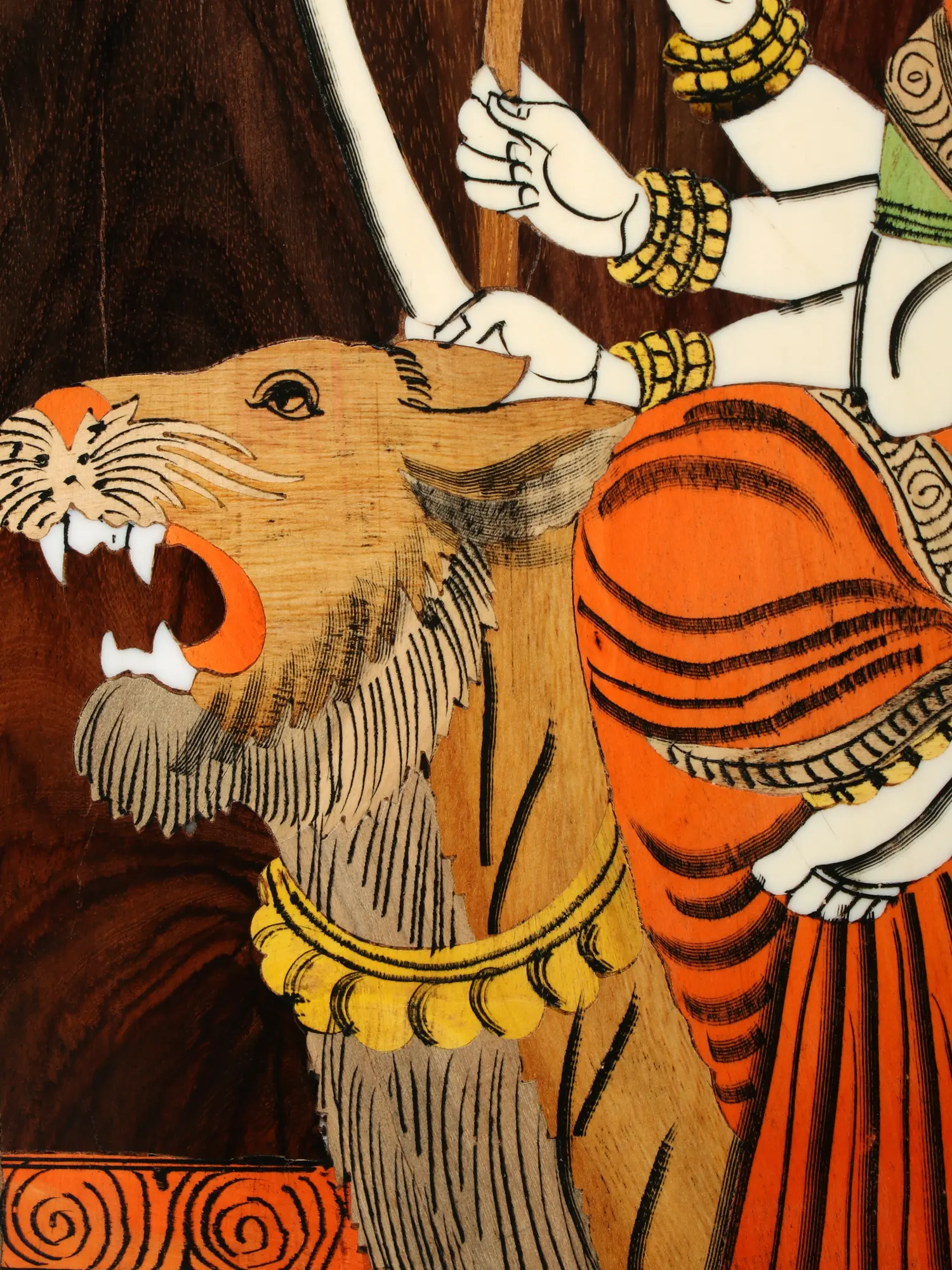 This depiction draws deeply from Hindu mythology, where Goddess Durga embodies cosmic power, motherhood, and the destruction of malevolent forces. Her association with the tiger signifies courage, strength, and the fierce protection she offers her devotees. The artwork’s style often reflects the rich heritage of Indian miniature painting traditions, adapted here into the enduring medium of wood inlay. You'll discover a profound connection to centuries of spiritual and artistic expression.