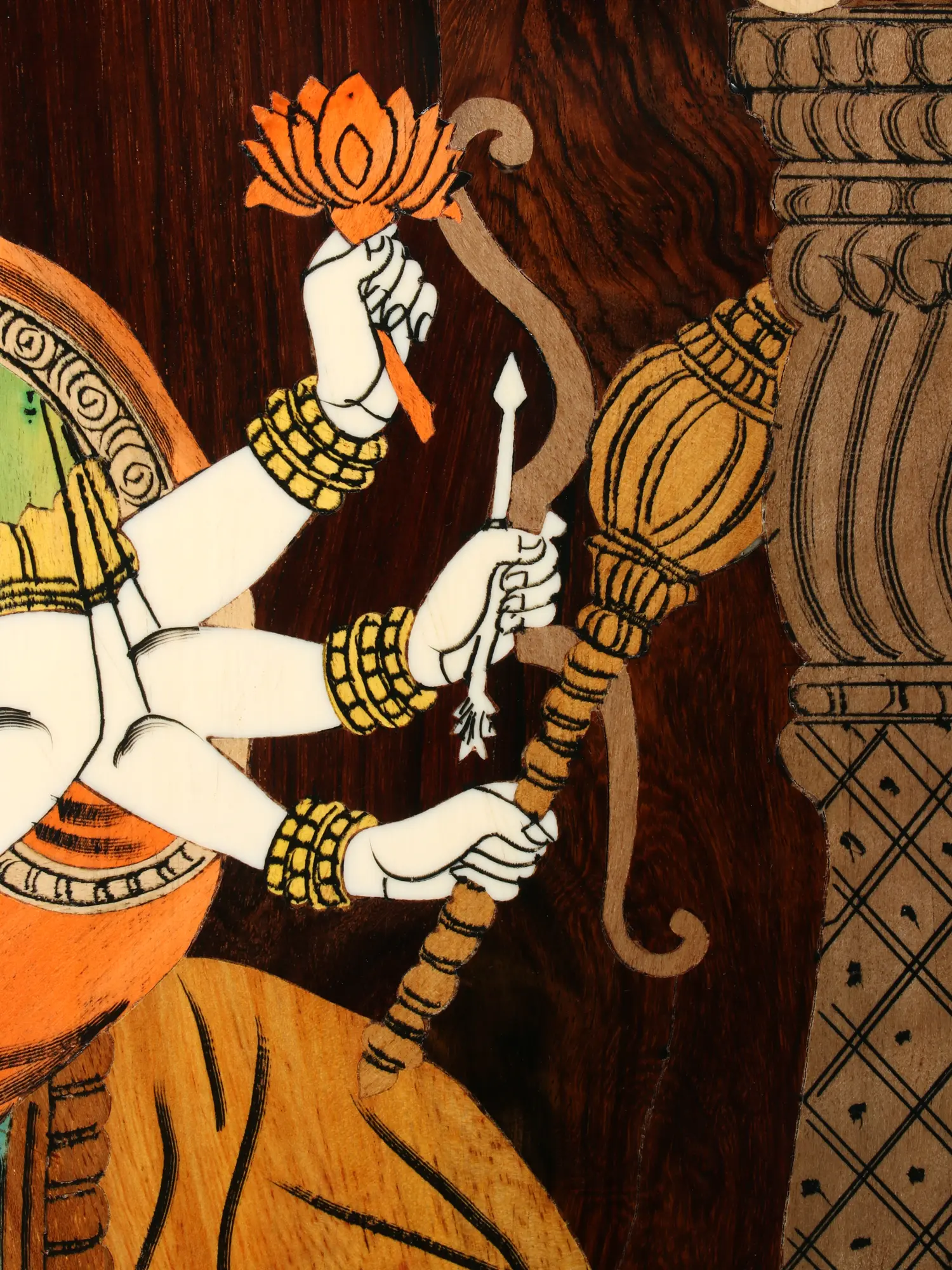 Encounter the awe-inspiring presence of the divine mother, a powerful protector and vanquisher of evil. This exquisite wooden inlay painting captures the essence of her triumphant spirit, making it a captivating focal point for any discerning collector. You'll be drawn into its narrative, appreciating the artistry and devotion poured into every detail.