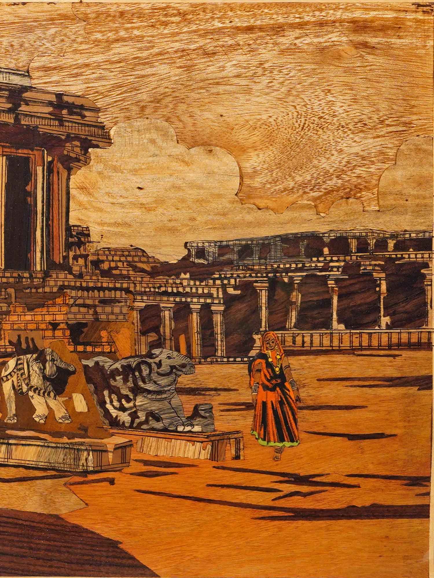 This exquisite rosewood panel unveils a timeless scene from Hampi, a UNESCO World Heritage site in Karnataka, India. The artwork captures the grandeur of the Hampi temples, echoing the splendor of the Vijayanagara Empire that once thrived here. Crafted with meticulous inlay work, the panel showcases the intricate details of the iconic stone chariot, a symbol of Hampi's architectural brilliance. Imagine the stories whispered through these ancient stones, the echoes of royal processions, and the fervent prayers that once filled the air. This piece isn't just a depiction; it's a portal to a bygone era, a tangible connection to the rich tapestry of Indian history.