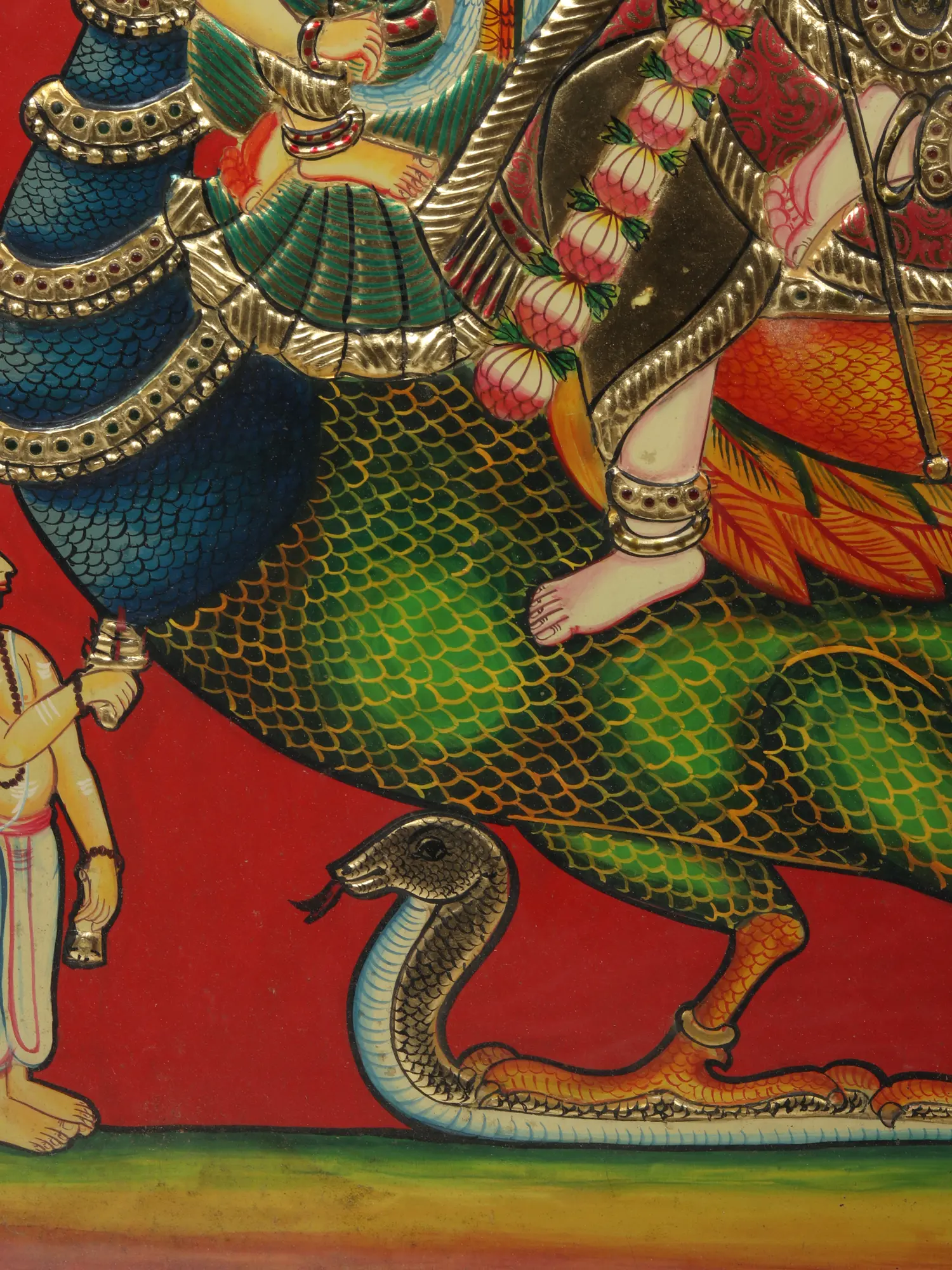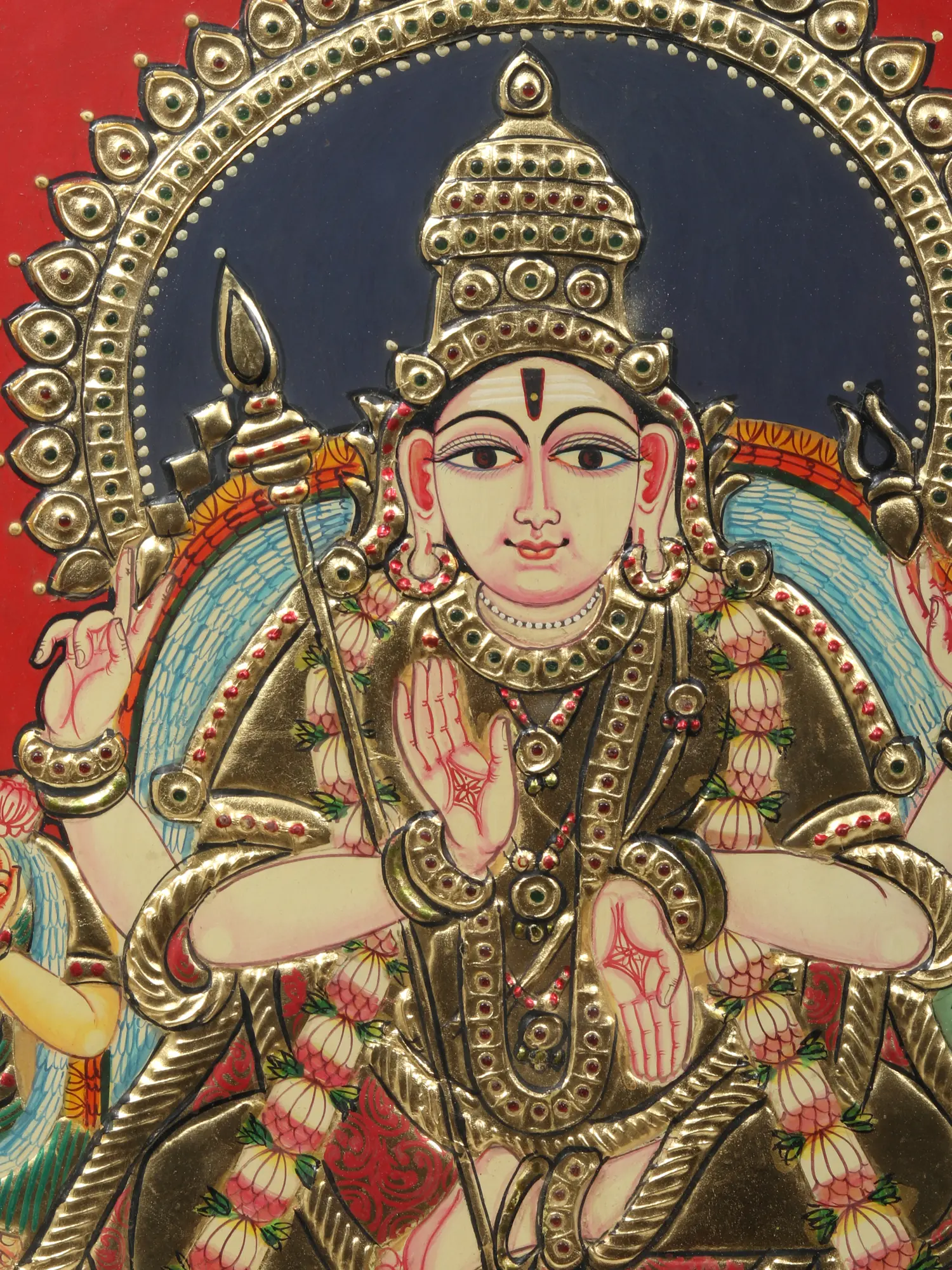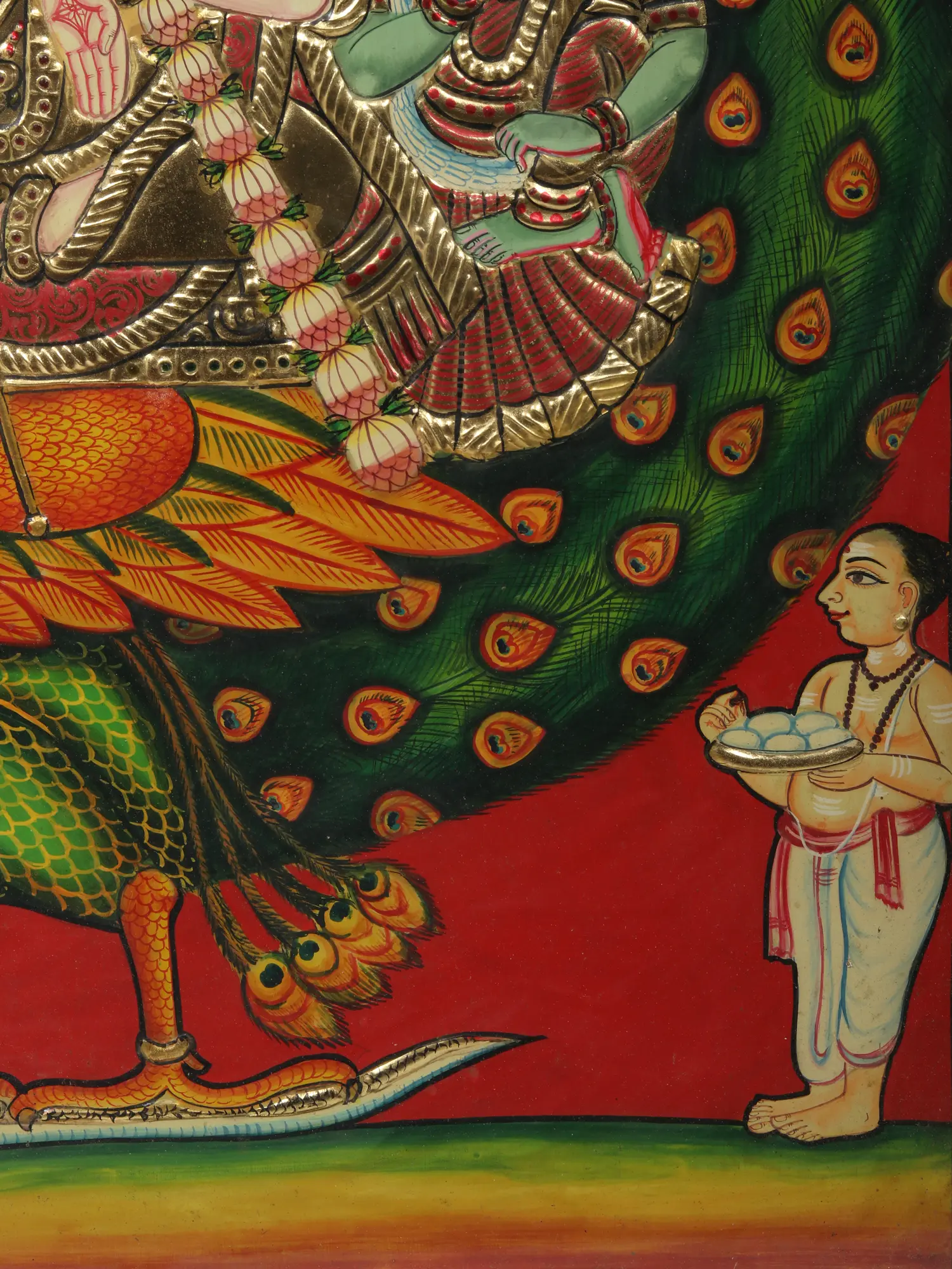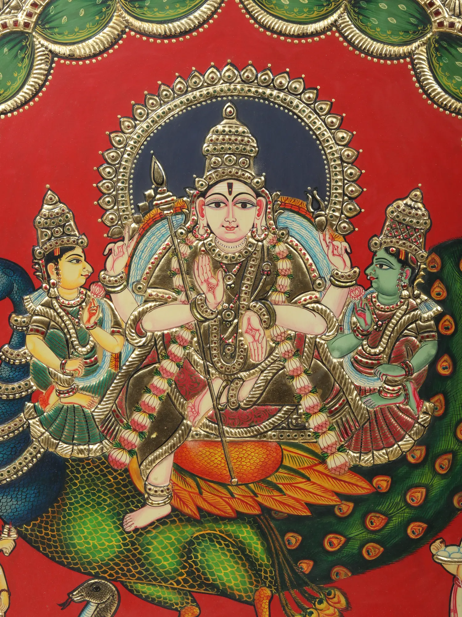 Lord Murugan Standing with Deivanai and Valli | Handmade Tanjore Painting | Traditional Colors with 24 Karat Gold | With Frame