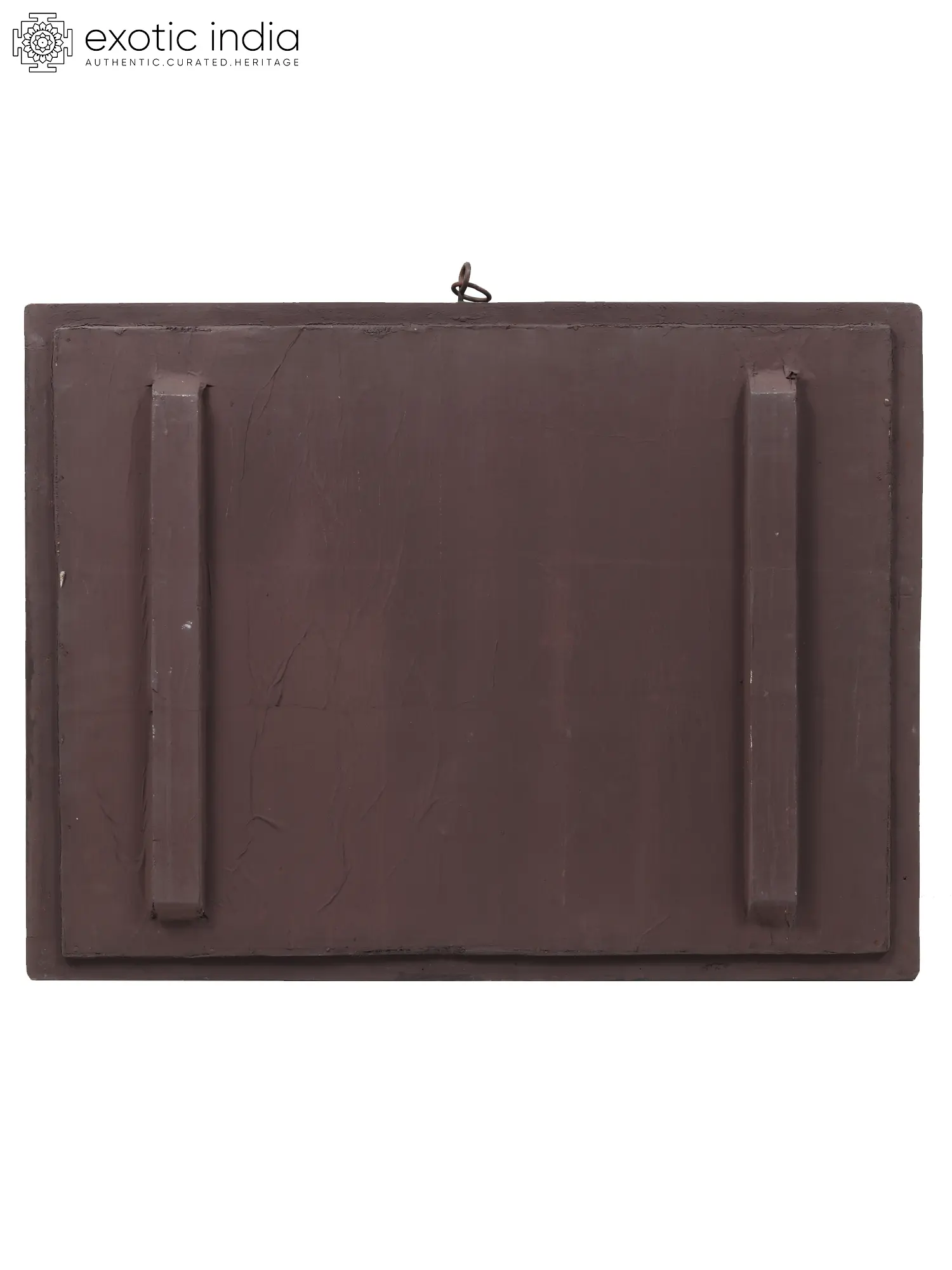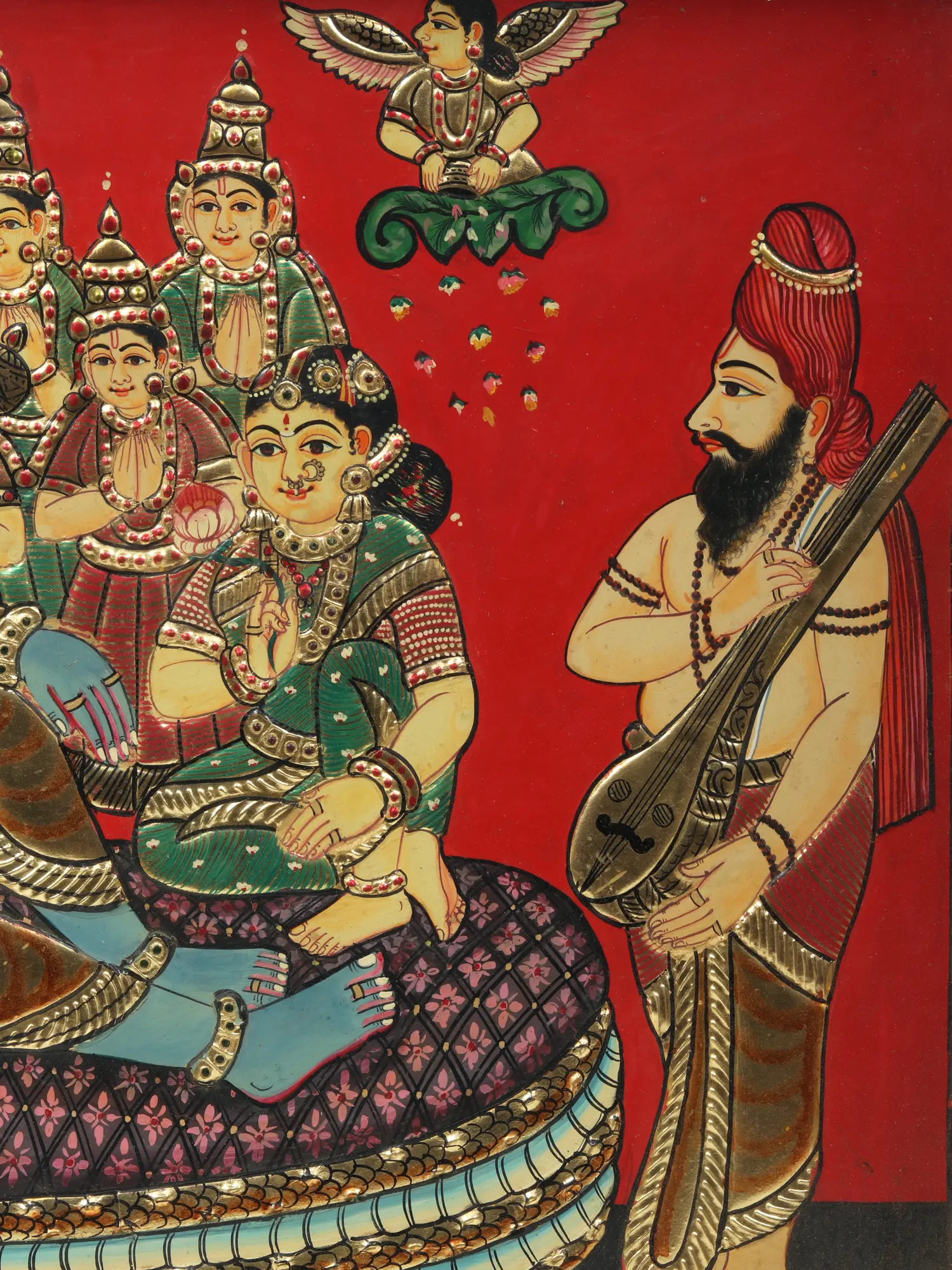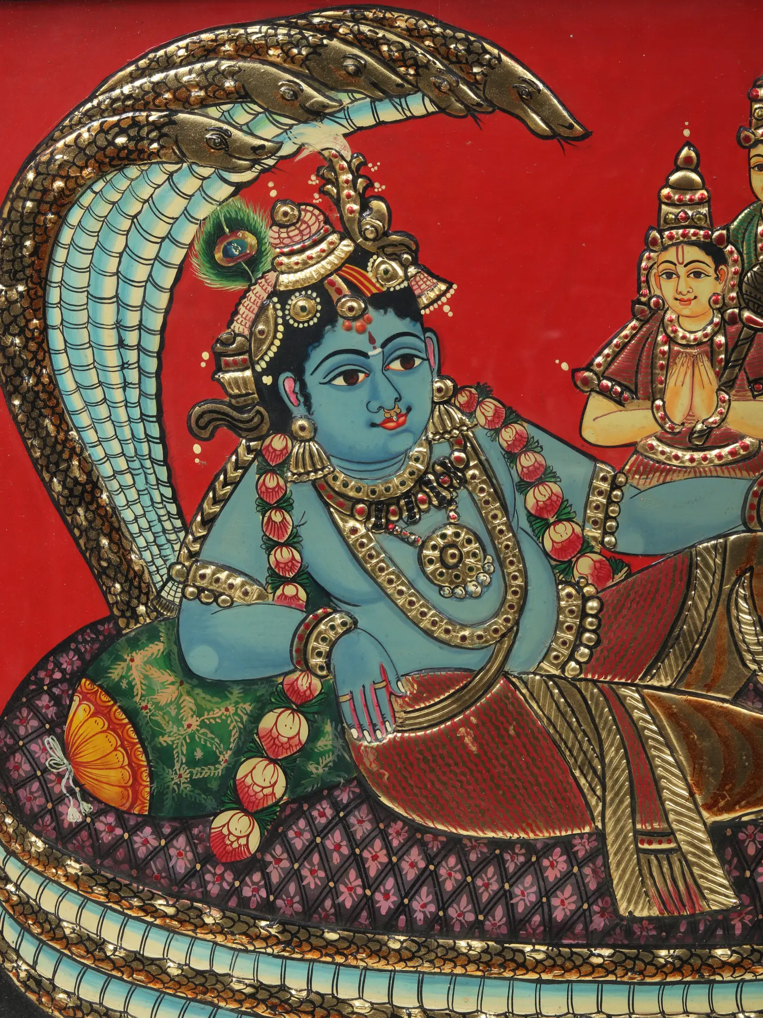 The blue-skinned Krishna glows beautifully against the deep red backdrop, adorned by intricate ornaments and a garland of flowers. He reclines on a bolster placed on the bed of Shesha’s coils, shaded by his five hoods. Accompanying Krishna is goddess Lakshmi, attired in auspicious green and holding a lotus flower. Behind her is a retinue of gods and goddesses, with their hands in Namaskar, the gesture of paying obeisance, and on her side is Narada, strumming his Veena in praise of Krishna. A heavenly being appears on the right section of the painting, showering flowers on the all-powerful Narayana.
