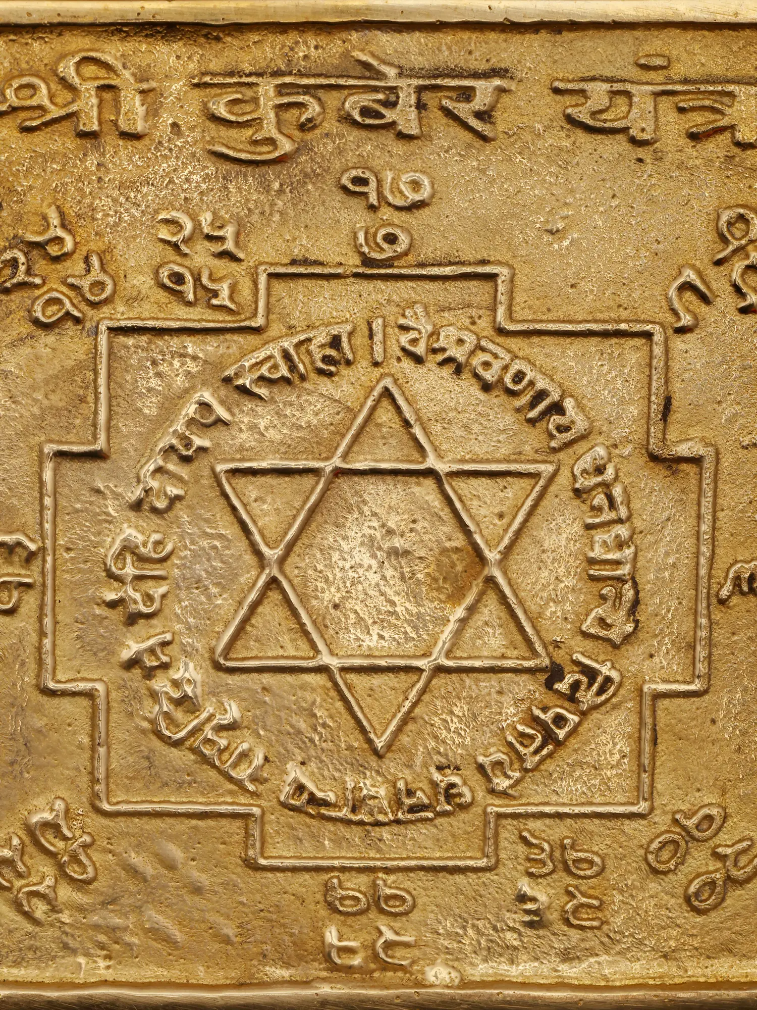 Measuring a substantial 3.2 inches in height and width with a subtle 0.2-inch depth, this yantra is a masterpiece of sacred geometry. The central six-pointed star, known as a hexagram, is a potent symbol of cosmic harmony, surrounded by a complex arrangement of concentric squares and lotus petals. Within these sacred boundaries, Sanskrit mantras and numerical seed syllables are precisely inscribed, each carrying its own vibrational significance.