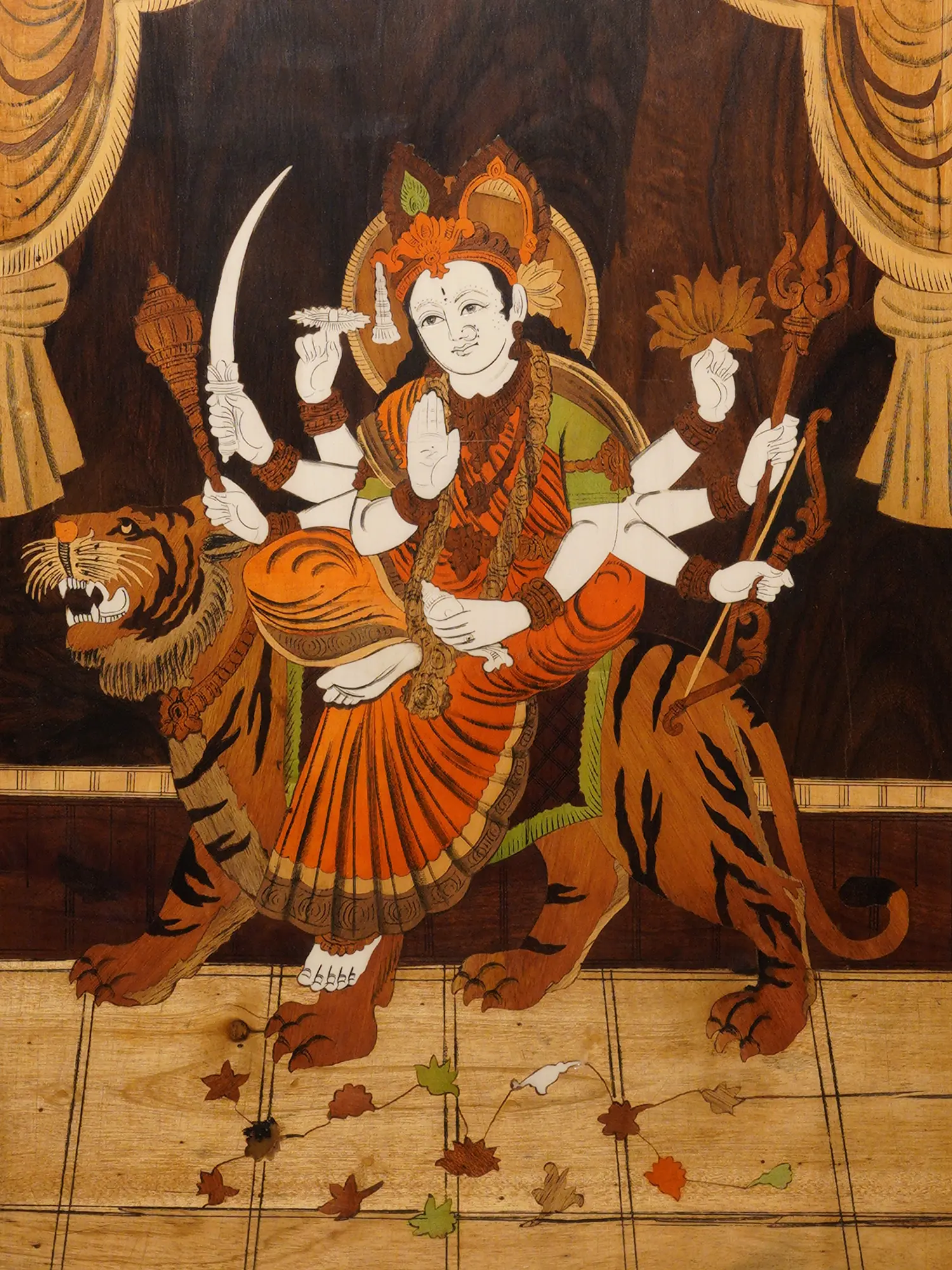 This exquisite rosewood panel is more than just a decorative piece; it's a window into a rich tapestry of Hindu mythology, skillfully rendered through the intricate art of Mysore wooden inlay. The central figure is Goddess Durga, a fierce yet compassionate deity, revered as the embodiment of Shakti, the divine feminine energy. In this representation, Durga is depicted as Ashtabhujadharini, she who wields eight arms, each holding a symbolic weapon or object. These are not mere implements of destruction, but potent symbols of her power to overcome evil, protect her devotees, and maintain cosmic order. From the gleaming curve of the sword to the serene lotus, each detail speaks of her multifaceted nature – a warrior, a mother, and the supreme source of creation.