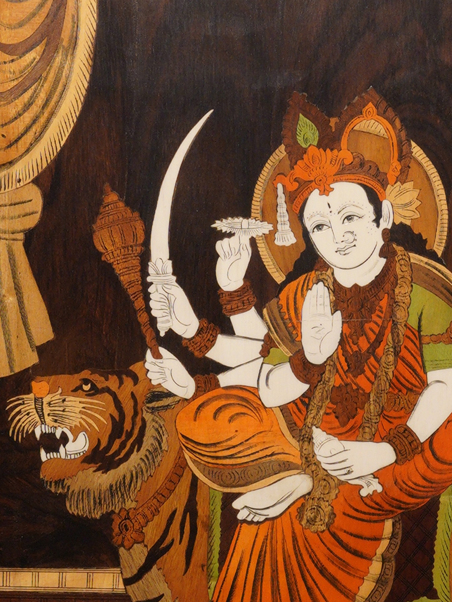Durga's legends are as vibrant as the hues of the wood that bring her to life in this panel. One of the most well-known tales recounts her battle against the buffalo demon, Mahishasura. The gods, unable to defeat this powerful asura, invoked Durga, who emerged from their collective energies, fully armed and radiant. For nine days and nights, she waged war, finally slaying the demon and restoring balance to the universe. This victory is celebrated annually during the festival of Durga Puja, a time of joyous devotion and remembrance of her triumph over darkness. The choice of rosewood, with its warm tones and rich grain, lends a sense of timelessness and enduring strength to the artwork. The painstaking process of Mysore wooden inlay involves meticulously cutting and fitting small pieces of different woods to create a cohesive image, where each shade and texture contribute to the overall effect. The skill and dedication required for this craft are a testament to the reverence with which the artisans approach their work, transforming simple materials into something truly divine.