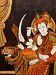 Gaze upon Durga gracefully seated on her mount, the majestic tiger, a symbol of untamed power and unwavering determination. The tiger, typically wild and ferocious, is subdued under her command, representing her mastery over base instincts and the chaotic forces of nature. The curtain in the background suggests a temple setting, hinting at the sacred space that Durga occupies in the hearts of her devotees. The delicate leaves scattered across the floor evoke a sense of peace and renewal, underscoring her role as the giver of life and the protector of all beings. Displaying this panel in your home is not only an appreciation of fine art, but also an invitation to invoke the blessings of Goddess Durga, filling your space with her protective energy and the promise of triumph over adversity.