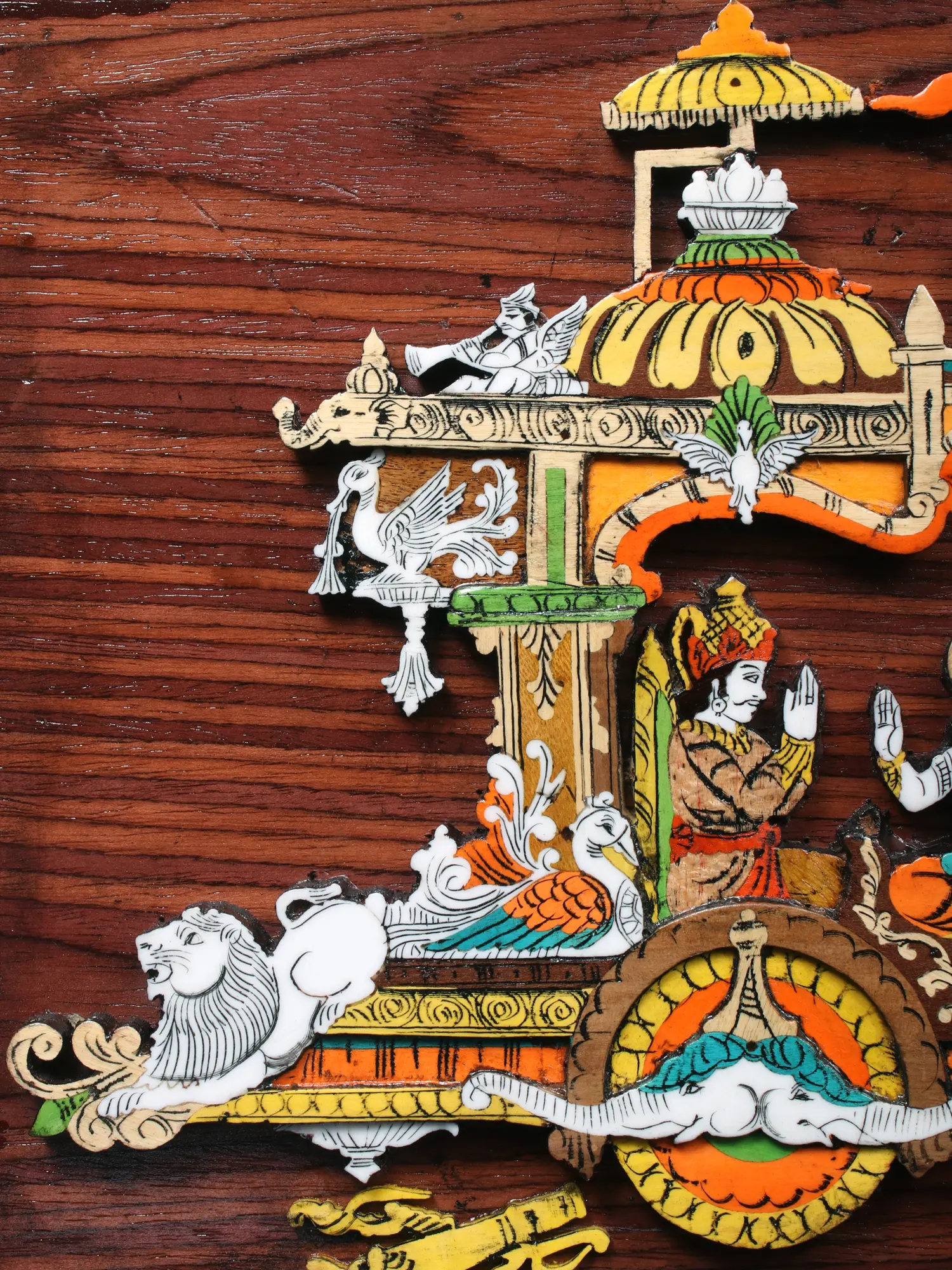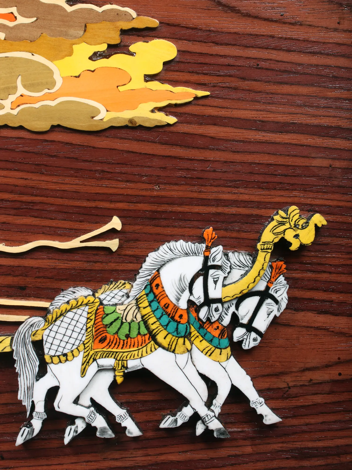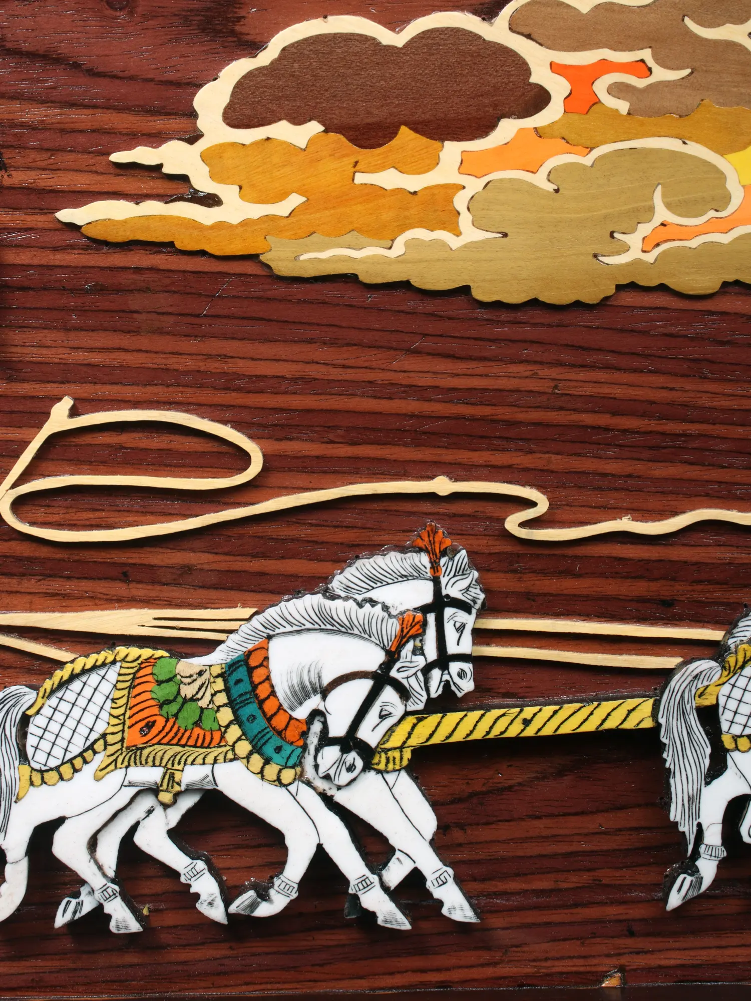 The surface of this piece, measuring an impressive 30.5 inches in width and 16.5 inches in height, serves as a canvas for a dramatic scene. The natural wood grain provides a warm, organic backdrop that perfectly complements the vibrant, hand-applied colors. Observe the delicate inlay work, which adds tactile and visual richness, enhancing the three-dimensional quality of the chariot and its noble occupants.