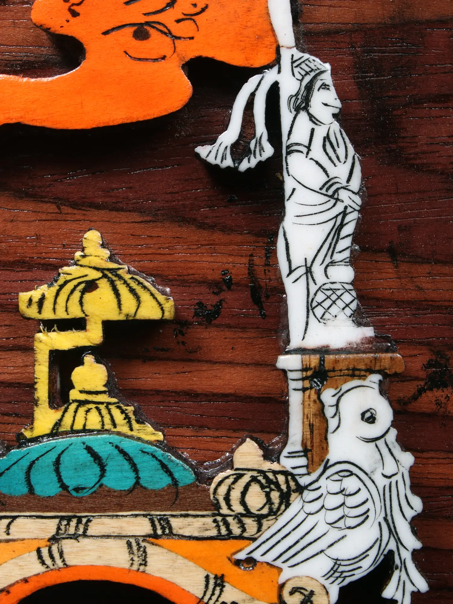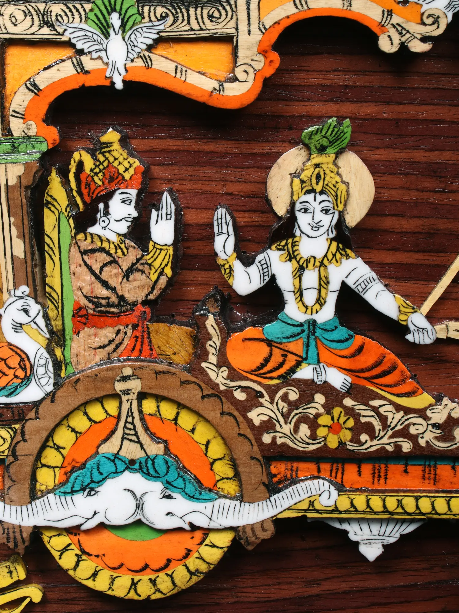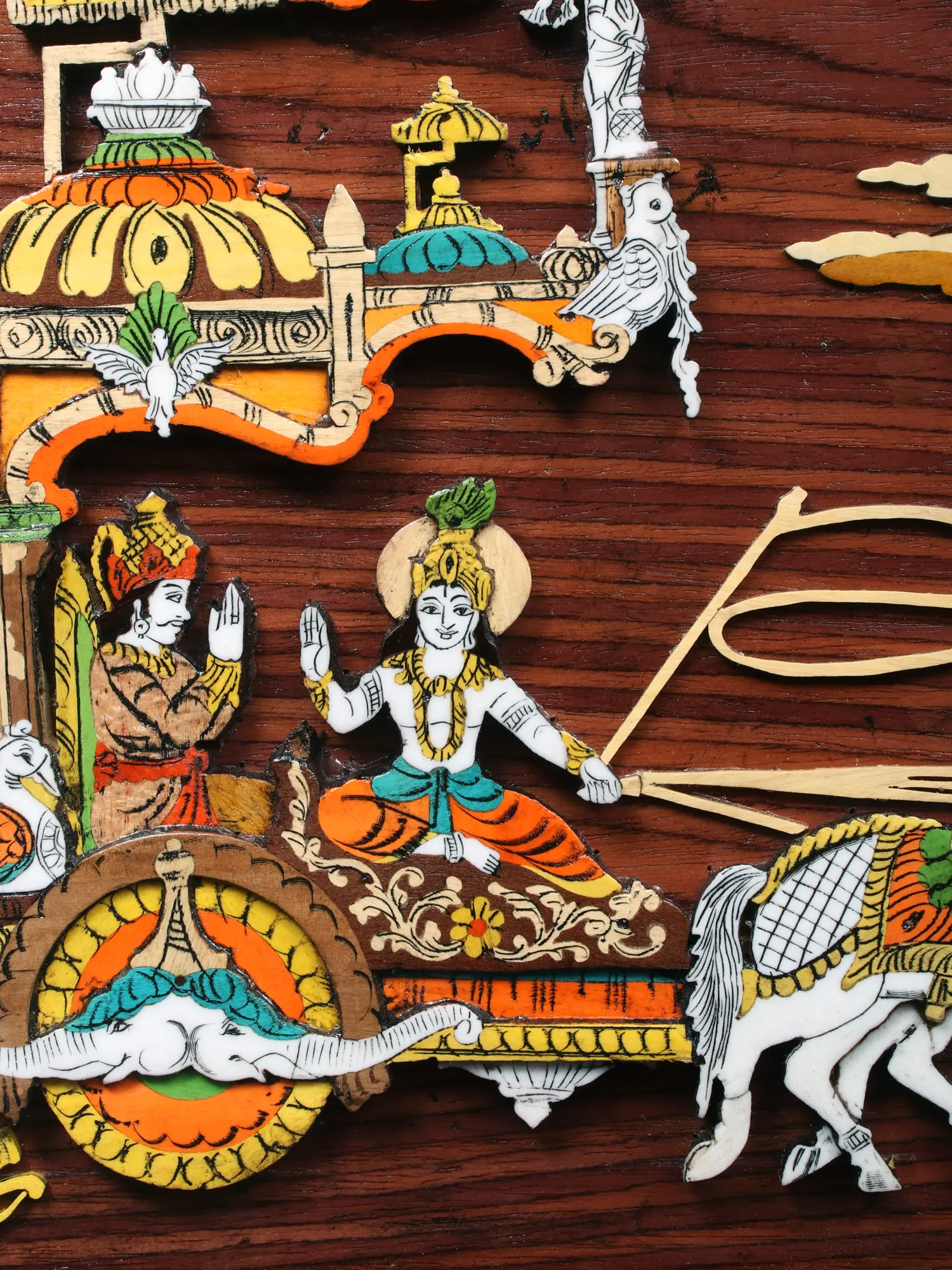 The surface of this piece, measuring an impressive 30.5 inches in width and 16.5 inches in height, serves as a canvas for a dramatic scene. The natural wood grain provides a warm, organic backdrop that perfectly complements the vibrant, hand-applied colors. Observe the delicate inlay work, which adds tactile and visual richness, enhancing the three-dimensional quality of the chariot and its noble occupants.