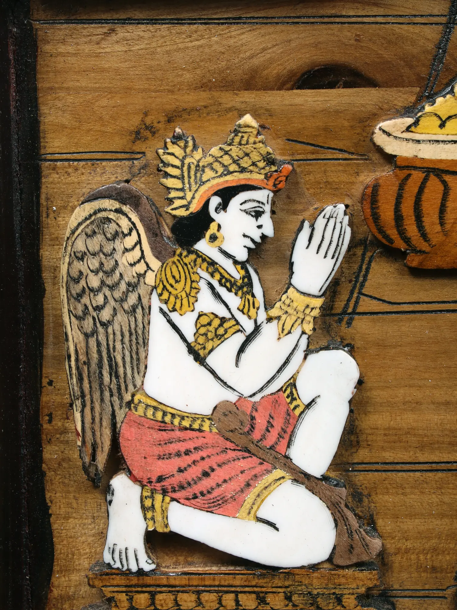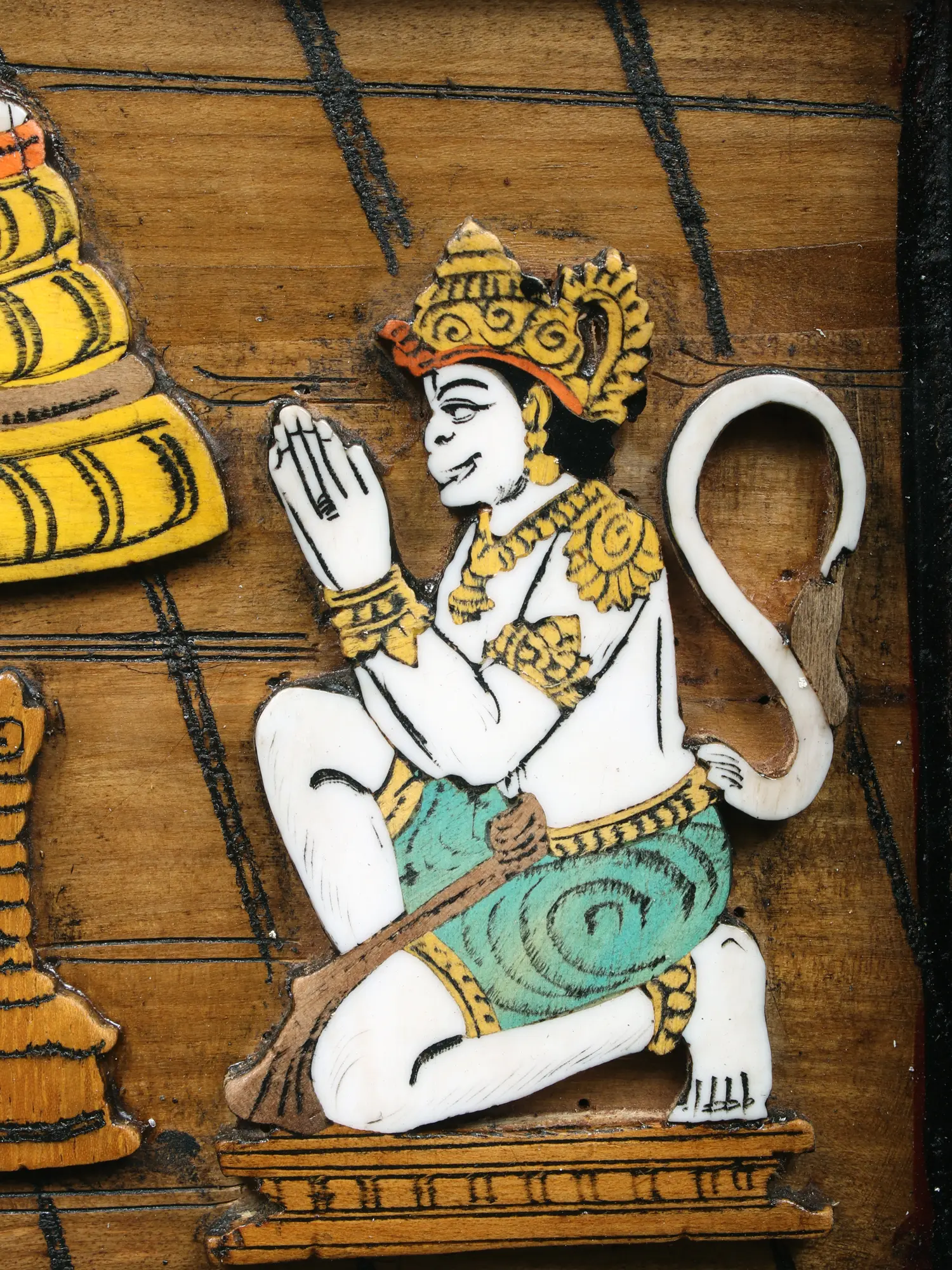 Each piece is a testament to the enduring legacy of traditional Indian craftsmanship, meticulously brought to life through a multi-layered process. Skilled artisans have employed natural colors and intricate inlay work, carving and assembling these elements onto a rich wooden canvas. The depth and dimensionality achieved through this unique 3D wood painting technique imbue the divine form with a lifelike presence, showcasing the dedication poured into its creation.