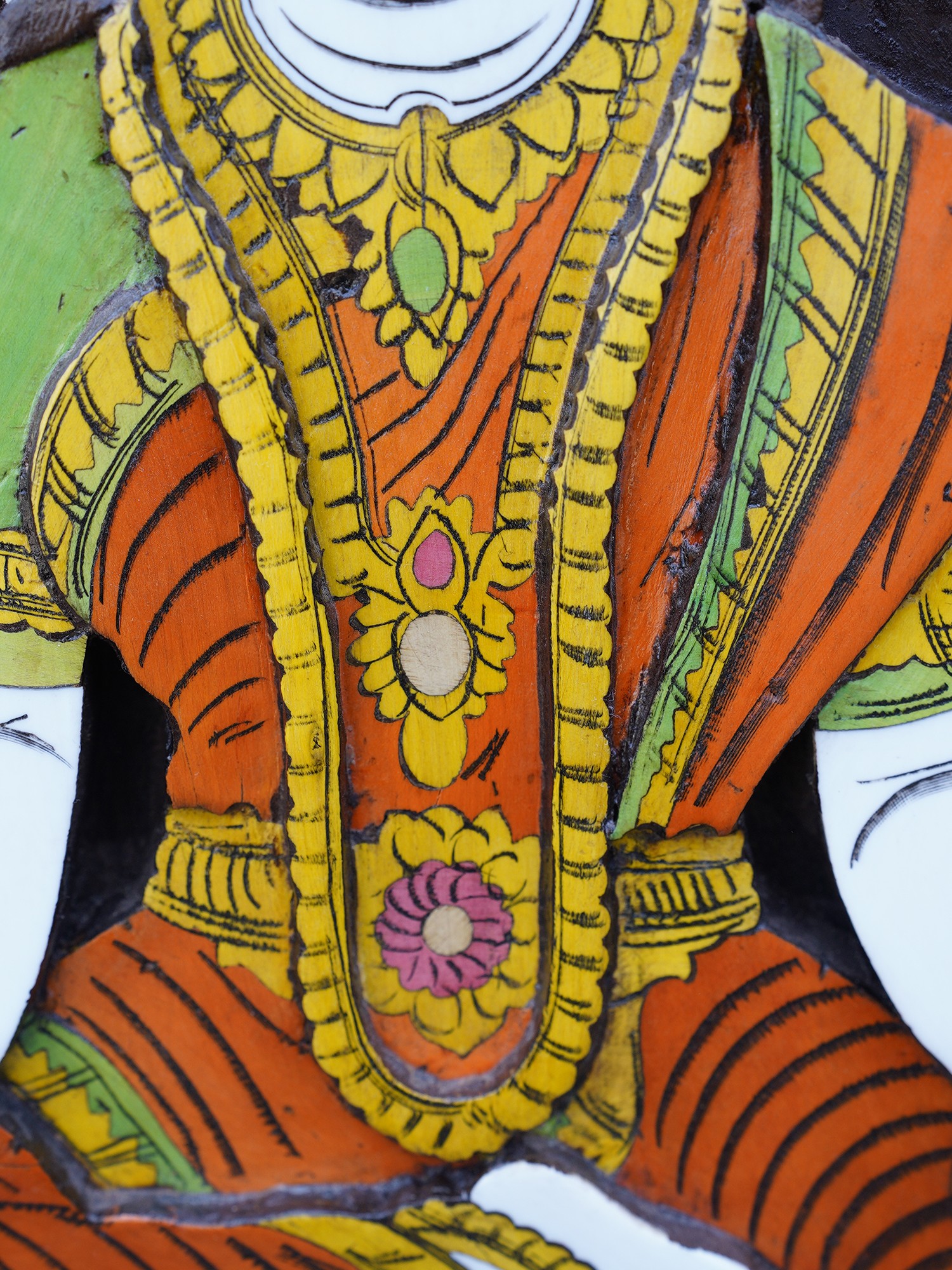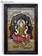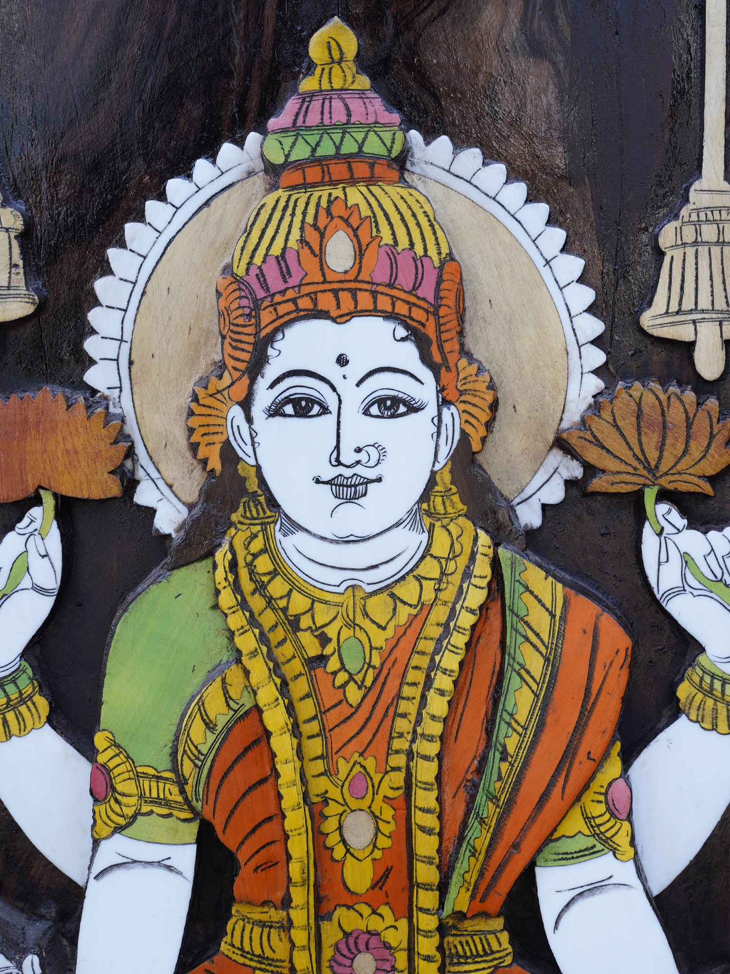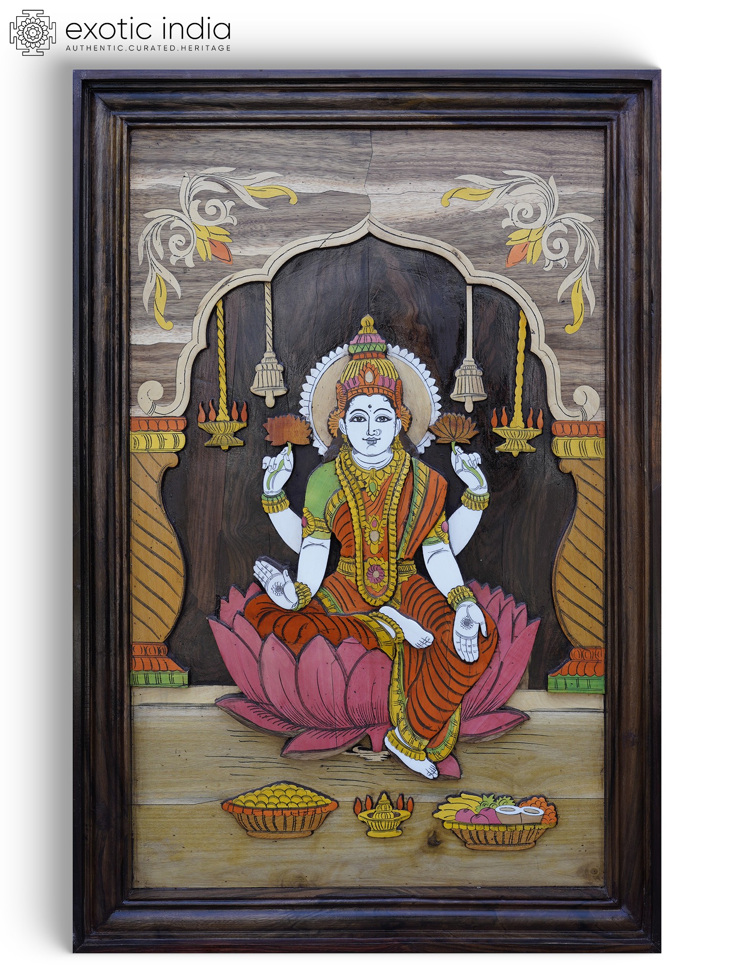36" Chaturbhuja Goddess Lakshmi | Natural Color On Wood Panel With Inlay Work