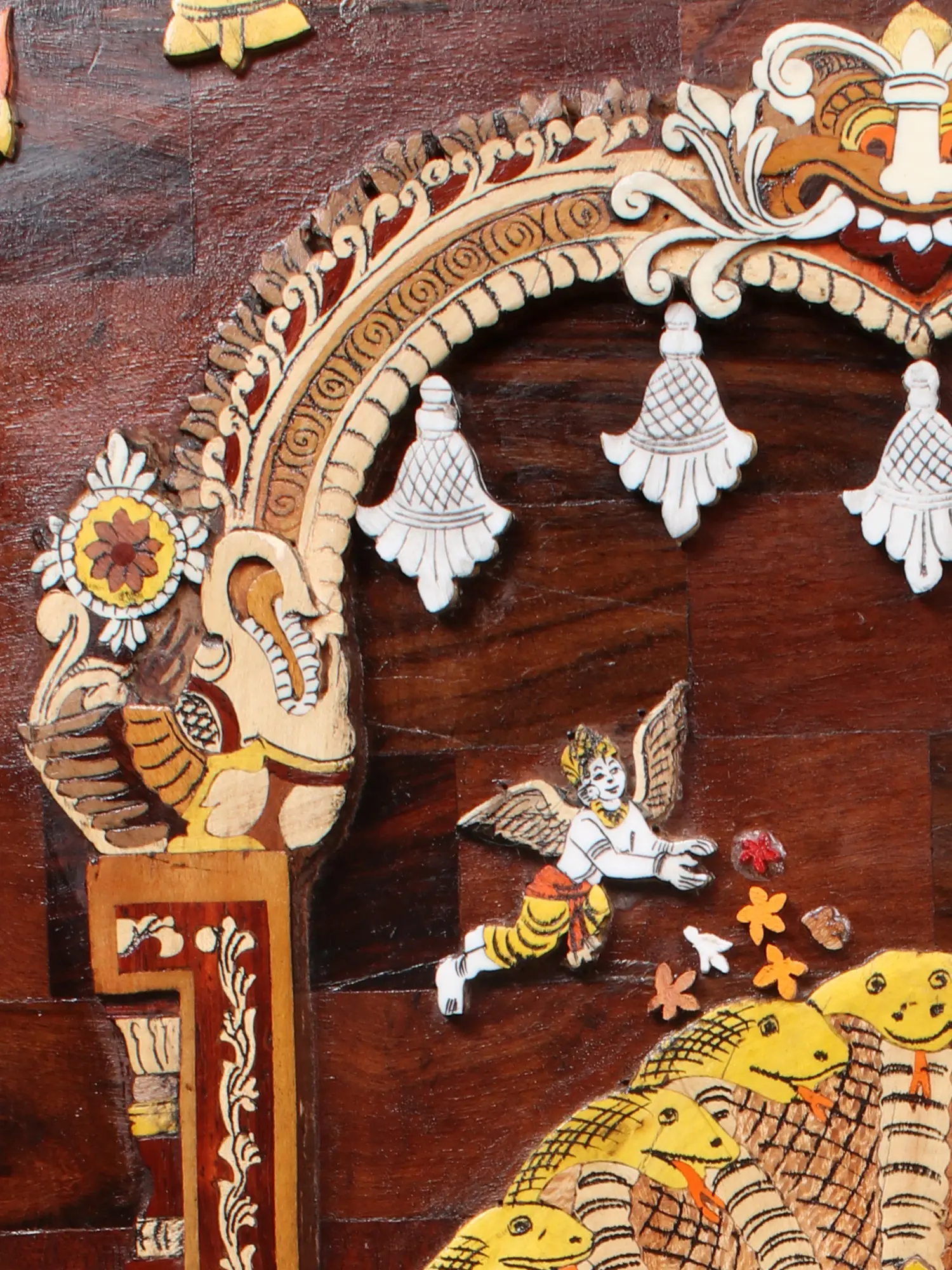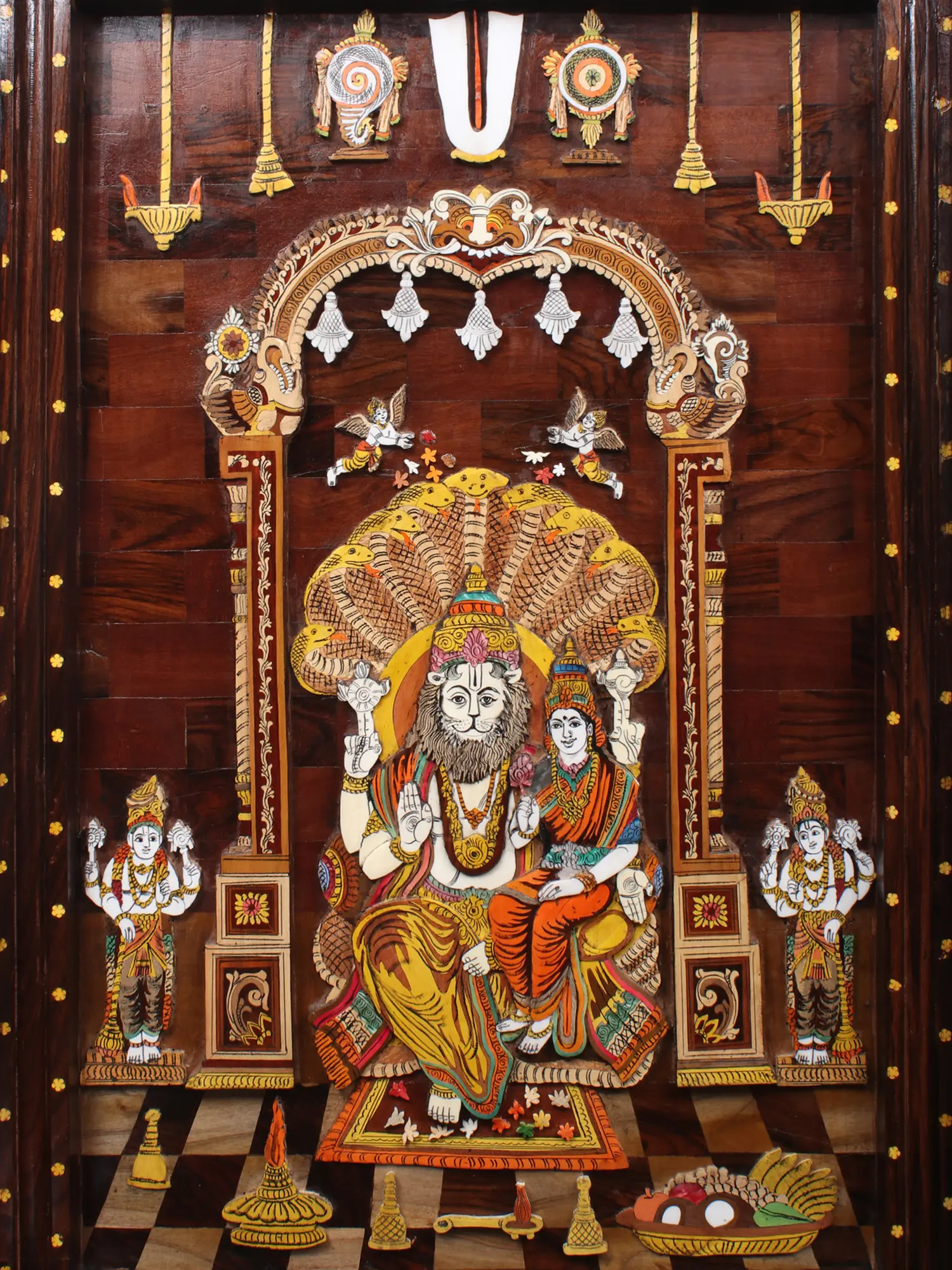 The striking depiction features a powerful lion-faced deity, Narasimha, in a protective embrace with the serene Goddess Lakshmi. Their forms are rendered with remarkable precision, adorned in vibrant, natural colors that pop against the rich wooden backdrop. The elaborate headdress of the Naga, or cosmic serpent, provides a majestic canopy, symbolizing cosmic protection and power. Surrounding the central figures, intricate carvings and delicate inlay work depict divine accoutrements and celestial attendants, all meticulously placed to create a harmonious and visually arresting composition that measures a significant 36 inches in height and 24 inches in width, with a substantial 2.25-inch depth that enhances its commanding presence.