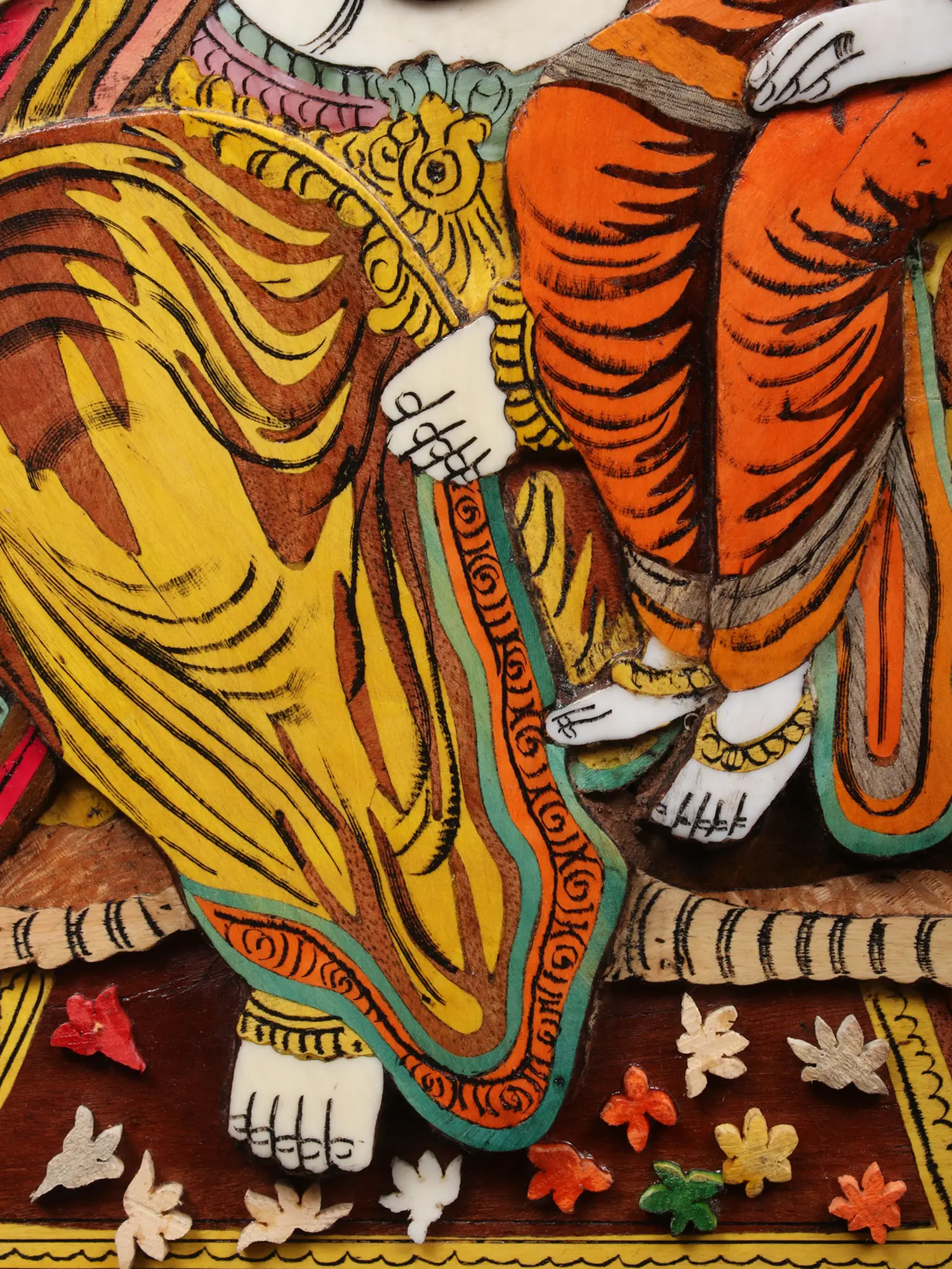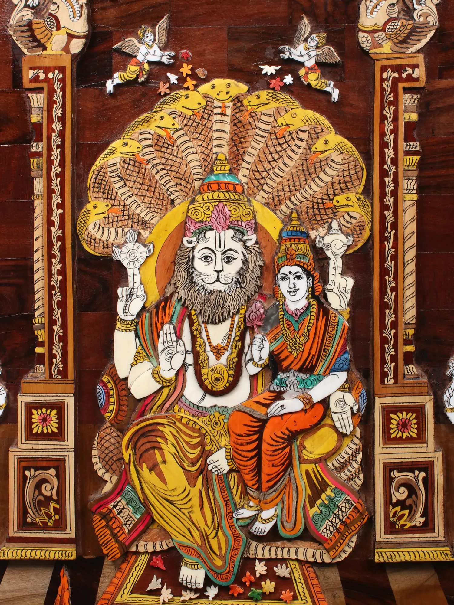 36" Lord Narsimha With Goddess Lakshmi | Natural Color On 3D Wood Painting With Inlay Work