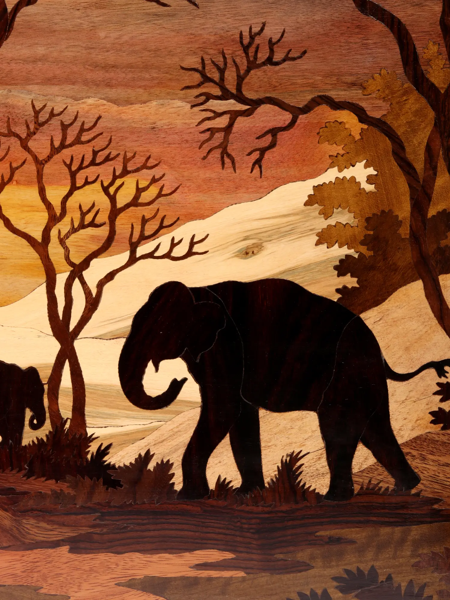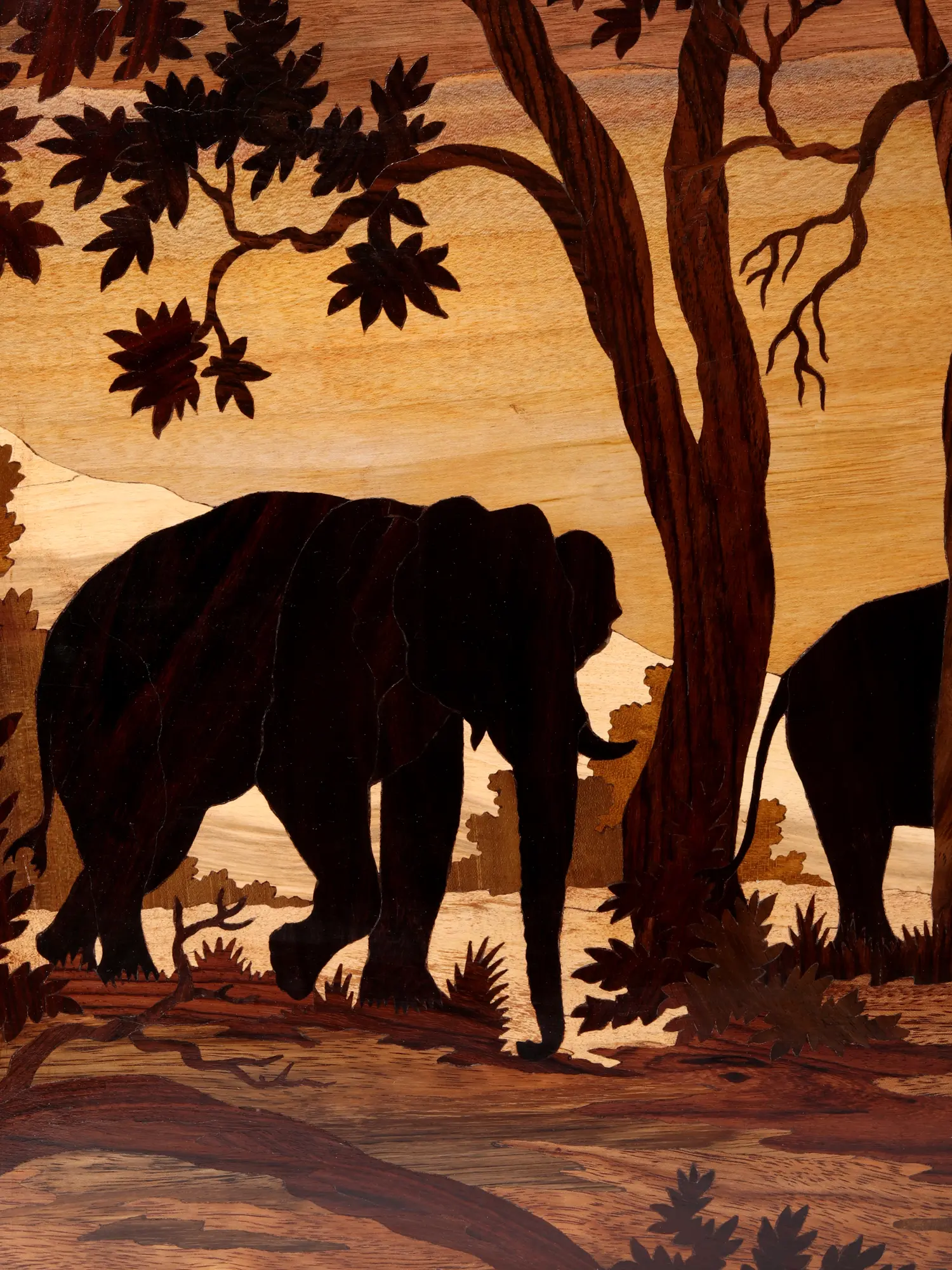 This piece is a testament to the intricate craft of wood inlay, where skilled artisans meticulously shape and set different wood veneers. Each element, from the silhouetted elephants to the delicate tracery of the trees and the subtle gradient of the sky, is formed from carefully selected natural wood colors. This painstaking technique ensures a seamless, organic beauty that defines artisanal luxury.