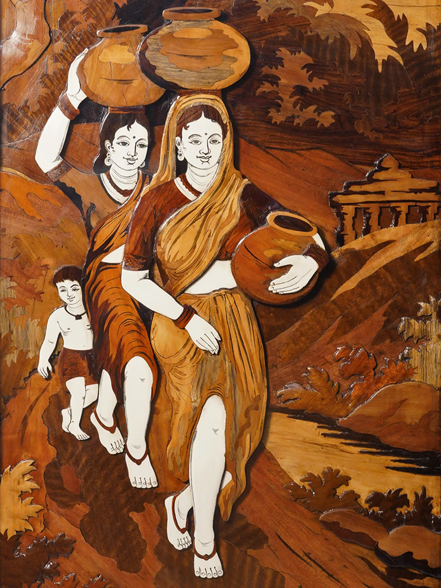 18" Standing Lady With Water Pot | Rosewood Panel With Inlay Work