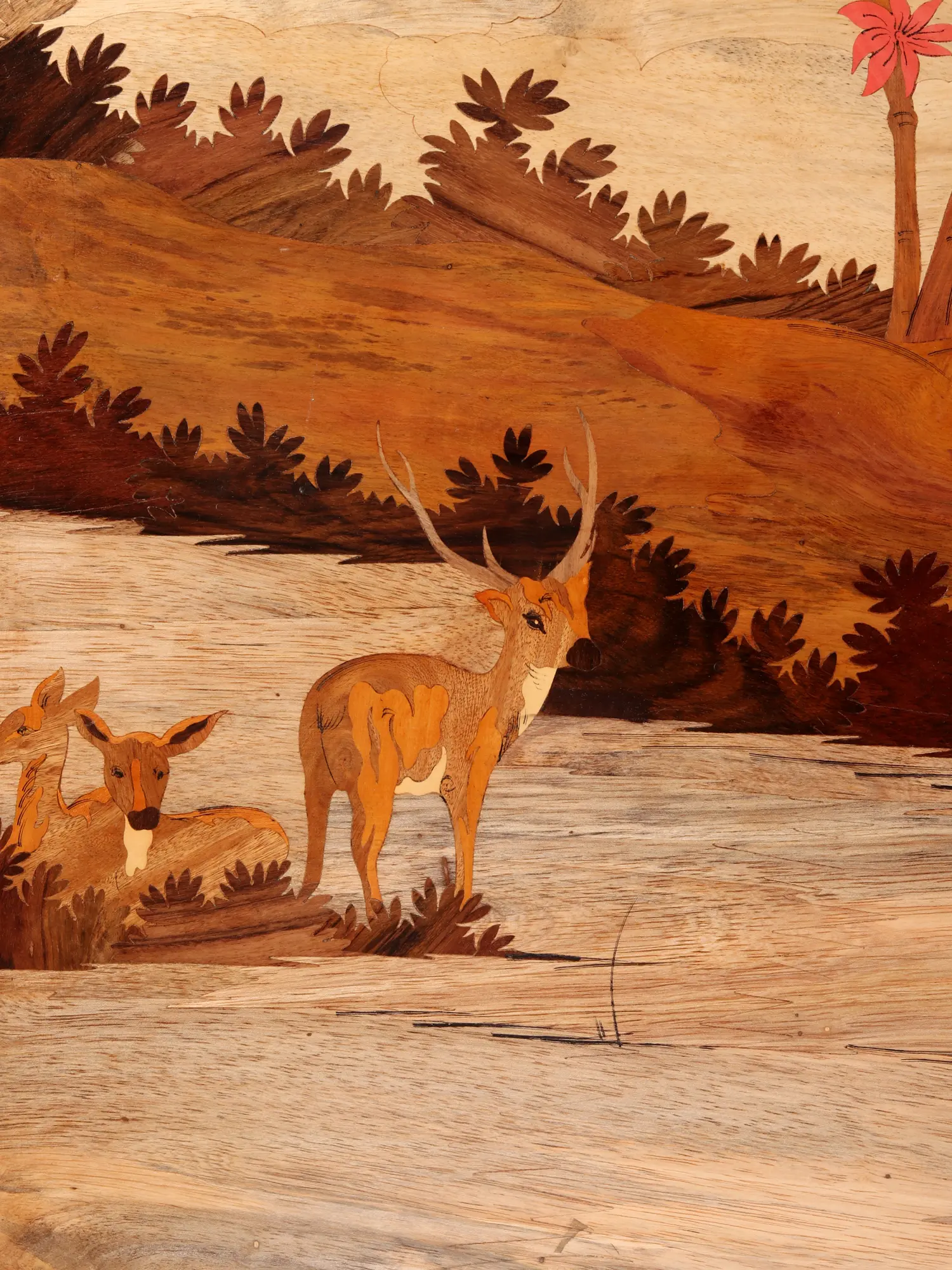 Wood inlay is a historically significant art form from the 18th century. It arrived in India through Srirangaptnam in Mysore from Persia but has become an inevitable part of the Indian heritage. Tipu Sultan and the Wodeyars/Wadiyars are credited with the growth of this 400-year-old art form in Mysore and its neighboring areas. Wood inlay work is usually done on a Mysore rosewood base, and other woods are used, like mango, kadam, jackfruit, rubber, doodhi, etc. Pieces of wood are adorned with beautiful motifs and patterns made from various materials. From wall hangings and paintings to jewelry boxes and furniture, many items are made using the Mysore wood inlay technique. An outline is etched on a piece of rosewood with a sharp tool. Then, the area inside the outline is hollowed out, and materials like lacquer, enamel, contrasting wood, and sometimes even gold and silver are placed inside it. A sandpaper is used to give a smooth finish to the surface.