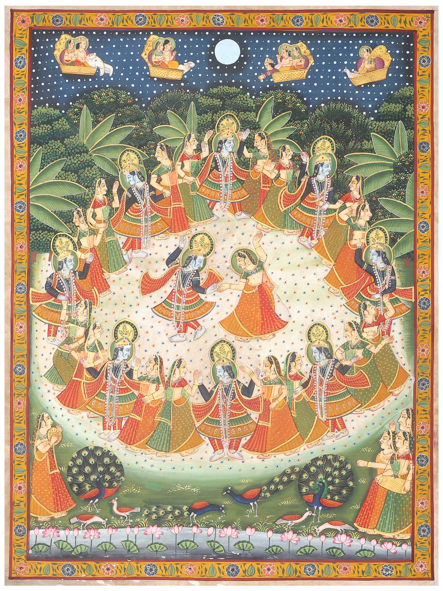 Immerse yourself in the divine ecstasy of the Raas Leela, a celebrated celestial dance performed by Lord Krishna and the Gopis (cowherd maidens) of Vrindavan. This magnificent Pichwai painting, rendered with natural colors on cloth, captures the very essence of this joyous, devotional spectacle. The scene unfolds under a starlit sky, with a luminous full moon as the silent witness, casting an ethereal glow over the verdant landscape. ––––––––––