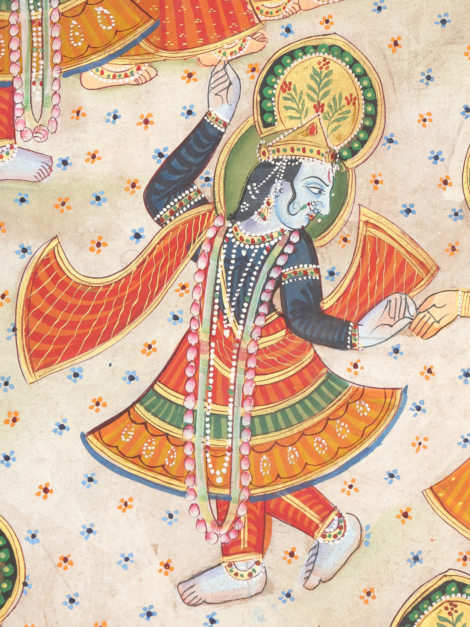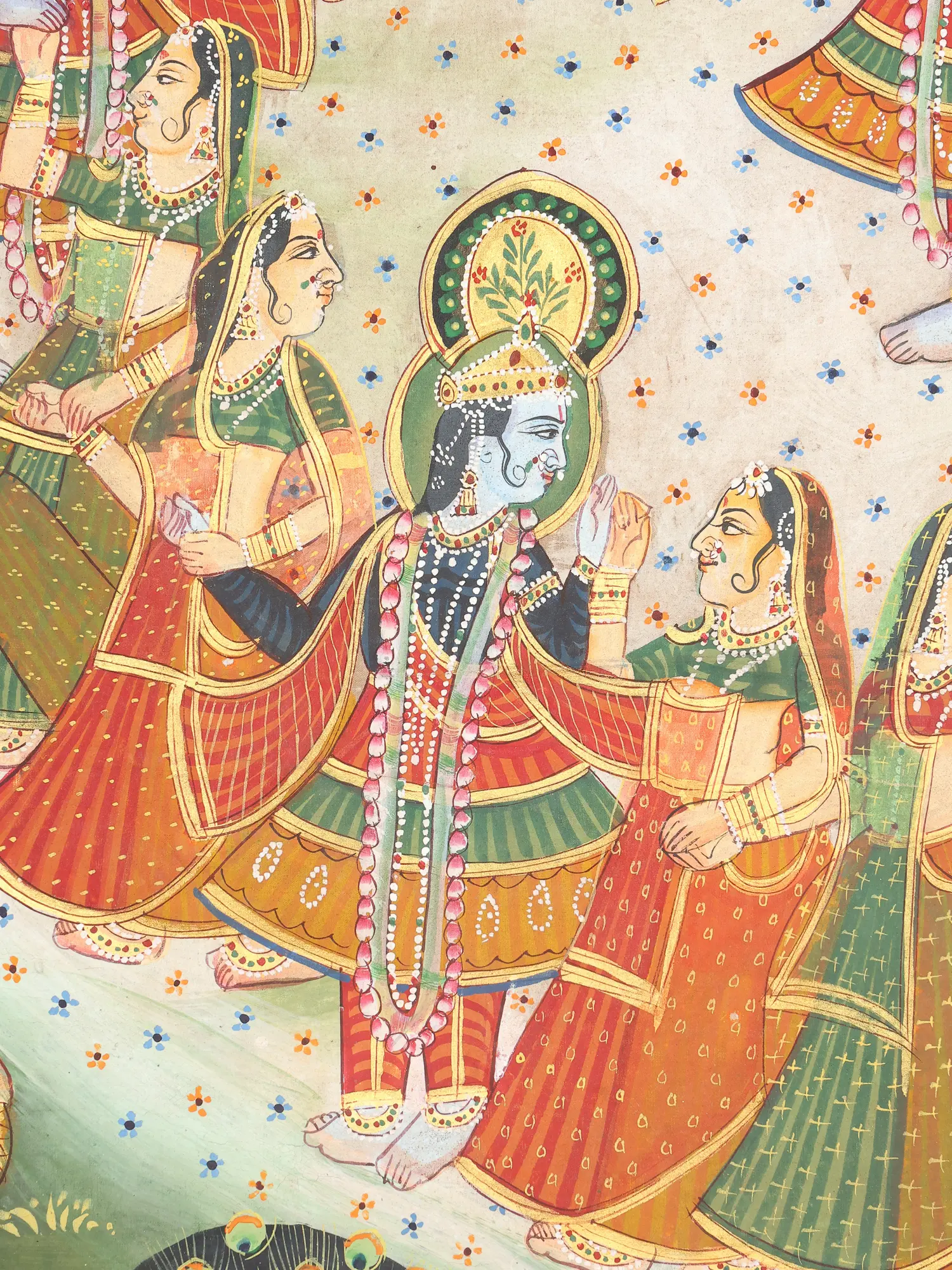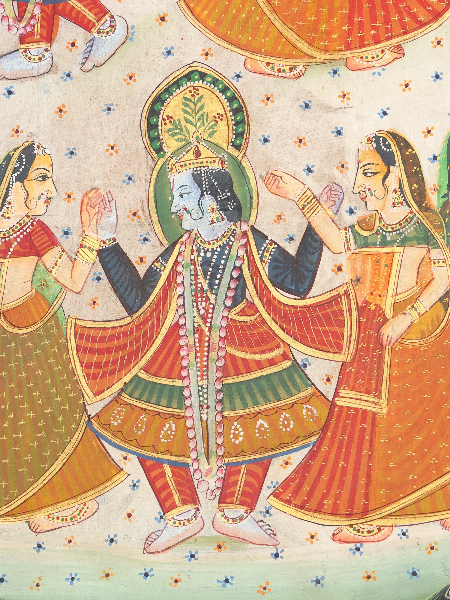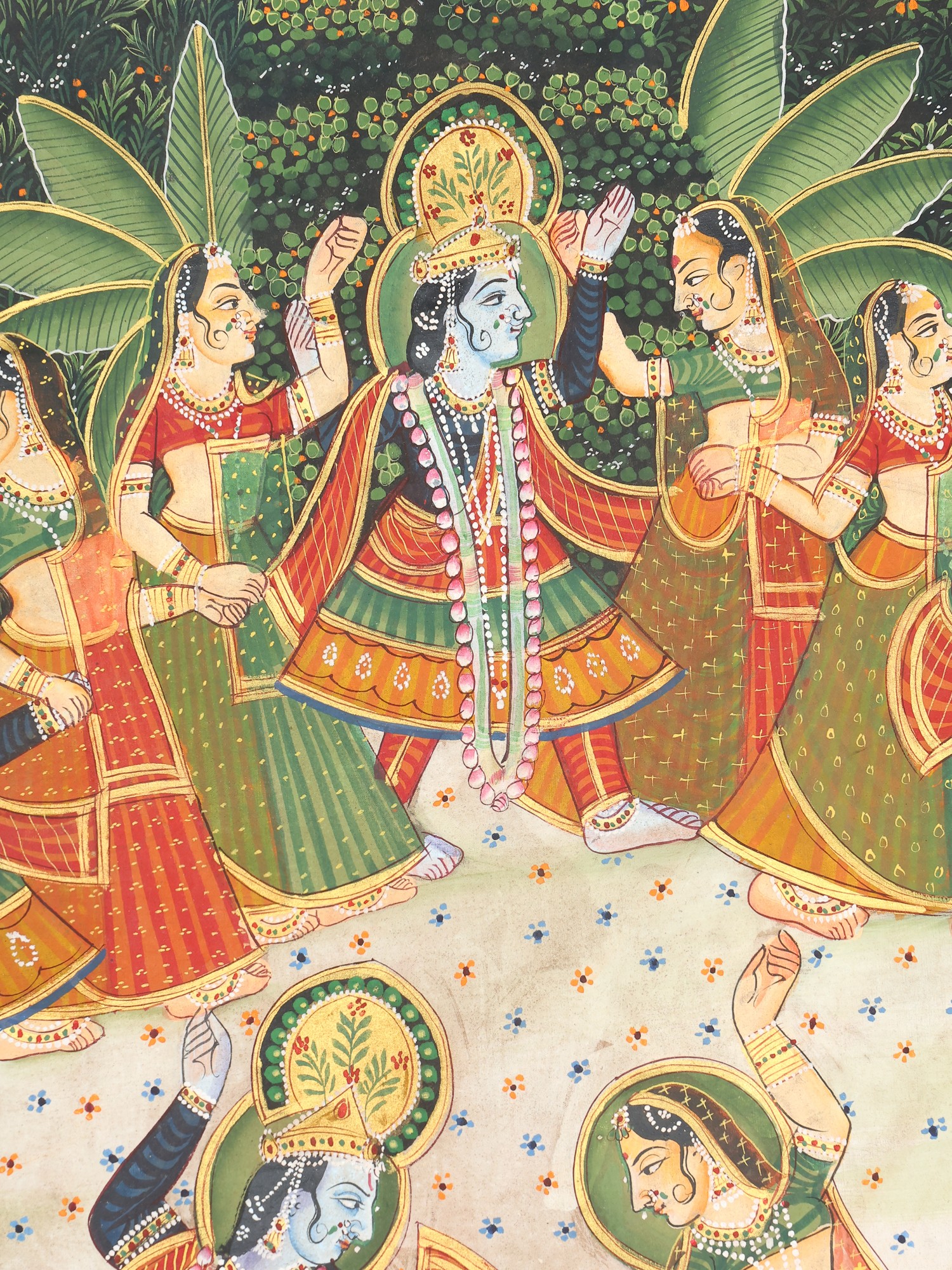 The Raas Leela is more than just a dance; it is a profound spiritual allegory, representing the soul's passionate yearning for the divine. In Hindu tradition, Krishna is revered as the Supreme Being, and the Gopis embody the devoted souls seeking ultimate union with God. This painting vibrantly illustrates the legend where Krishna, playing his enchanting flute, drew the Gopis away from their worldly duties and into a transcendental dance of love and spiritual bliss. Each figure is depicted with meticulous detail, their flowing garments and graceful poses conveying the rhythm and passion of the divine dance. The circular arrangement of the figures emphasizes unity and the interconnectedness of devotion. ––––––––––