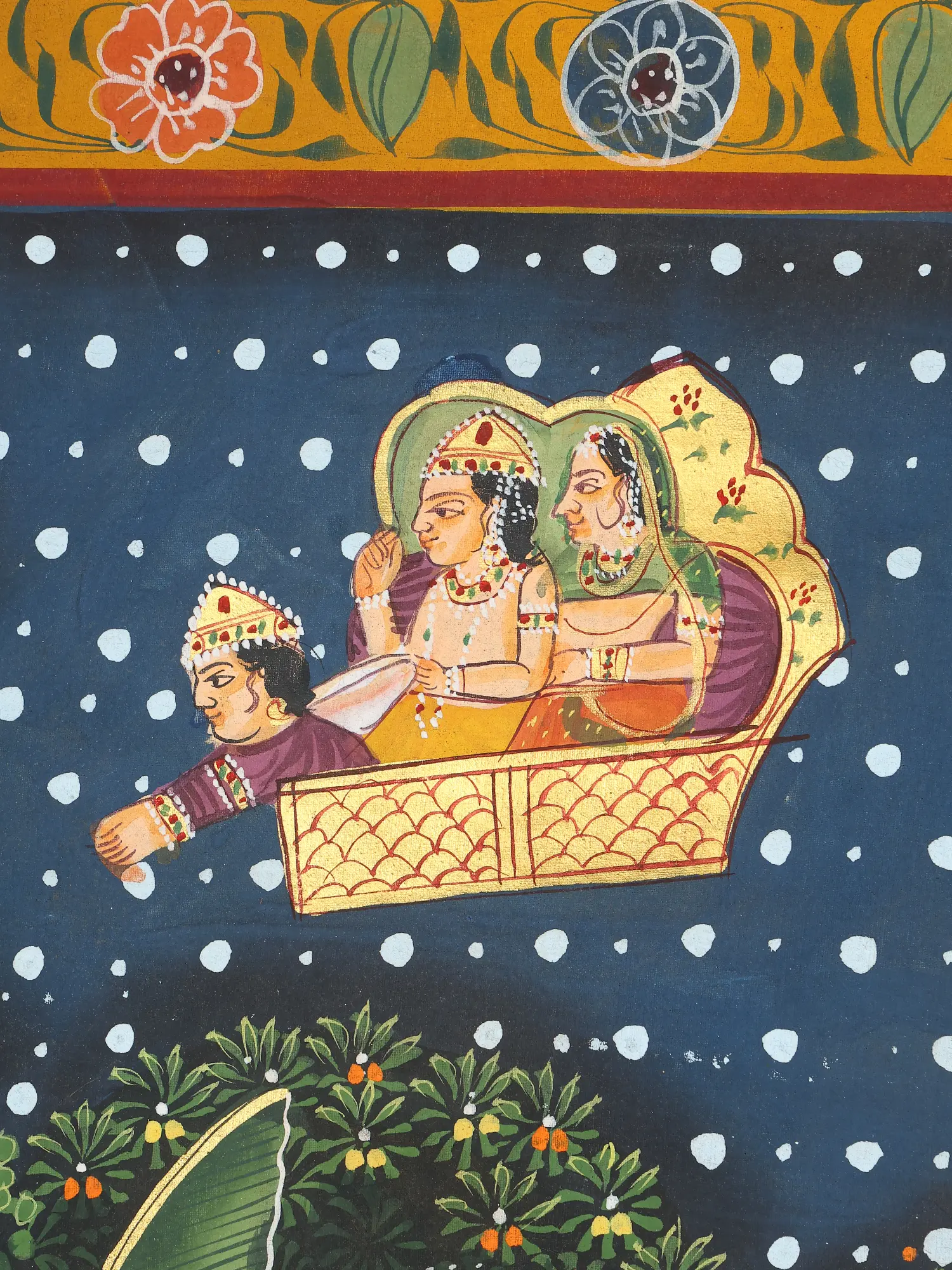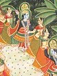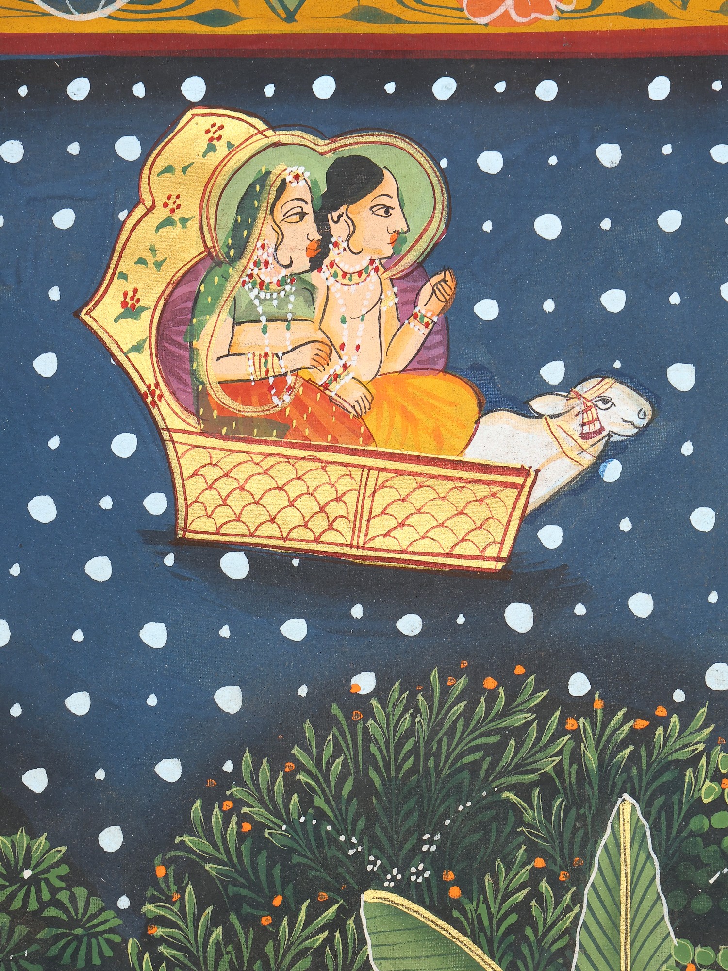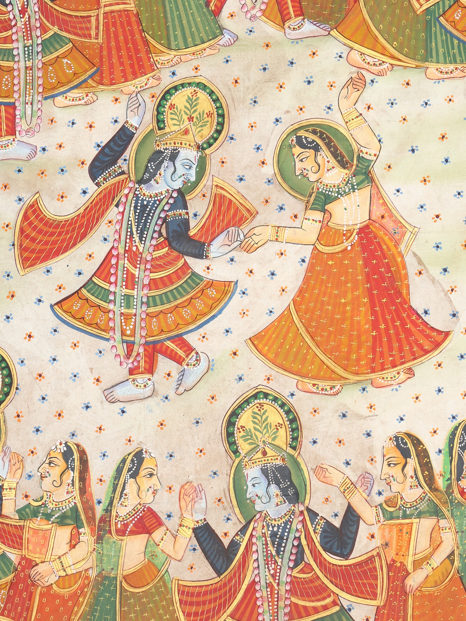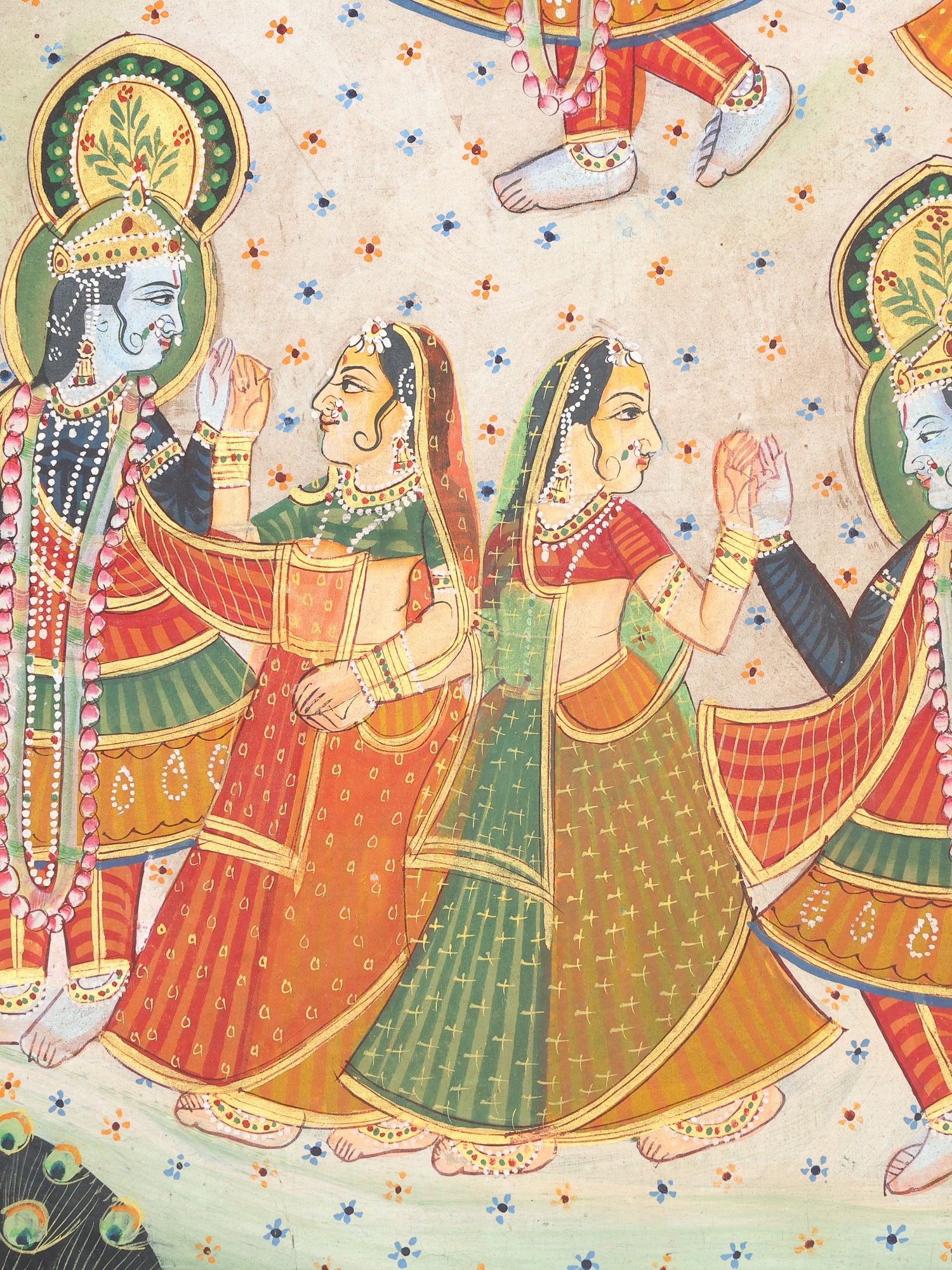 The Raas Leela is more than just a dance; it is a profound spiritual allegory, representing the soul's passionate yearning for the divine. In Hindu tradition, Krishna is revered as the Supreme Being, and the Gopis embody the devoted souls seeking ultimate union with God. This painting vibrantly illustrates the legend where Krishna, playing his enchanting flute, drew the Gopis away from their worldly duties and into a transcendental dance of love and spiritual bliss. Each figure is depicted with meticulous detail, their flowing garments and graceful poses conveying the rhythm and passion of the divine dance. The circular arrangement of the figures emphasizes unity and the interconnectedness of devotion. ––––––––––