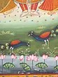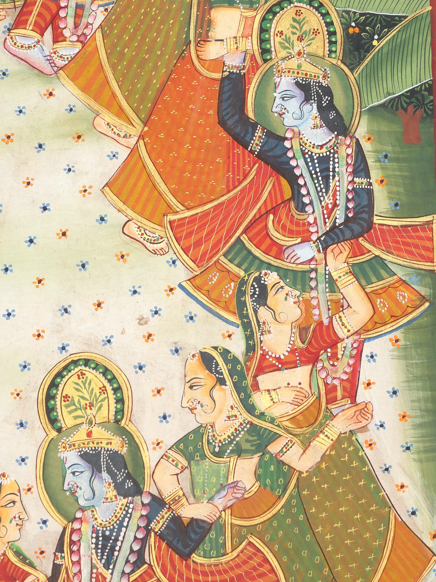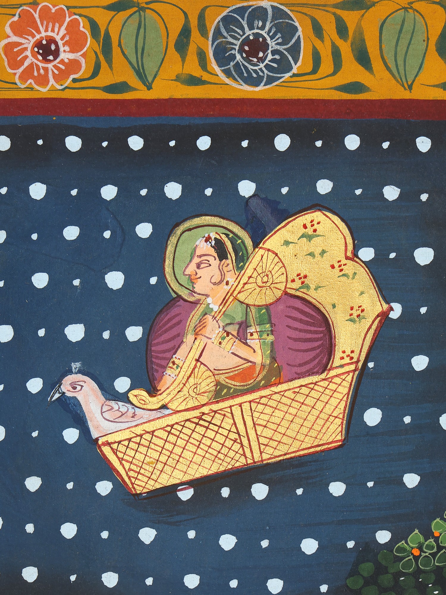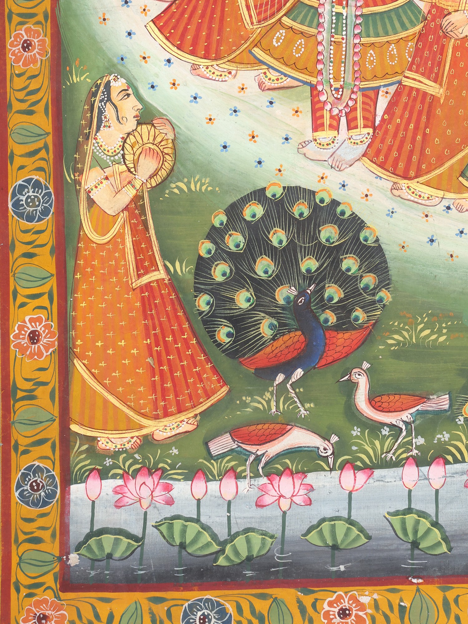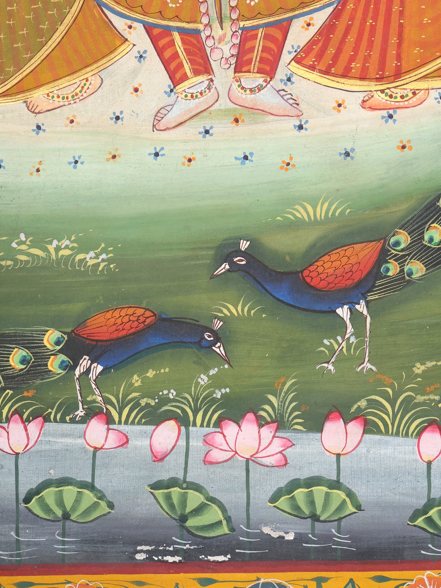 The backdrop of the painting is a lush depiction of Vrindavan, the sacred forest where these divine encounters are said to have occurred. Towering, verdant foliage frames the scene, evoking the mystical aura of the divine playground. At the bottom of the composition, a tranquil body of water adorned with blooming lotuses, a symbol of purity and spiritual awakening, adds a serene counterpoint to the energetic dance above. Peacocks, often associated with Krishna, strut proudly, their magnificent plumage mirroring the vibrancy and beauty of the scene. ––––––––––