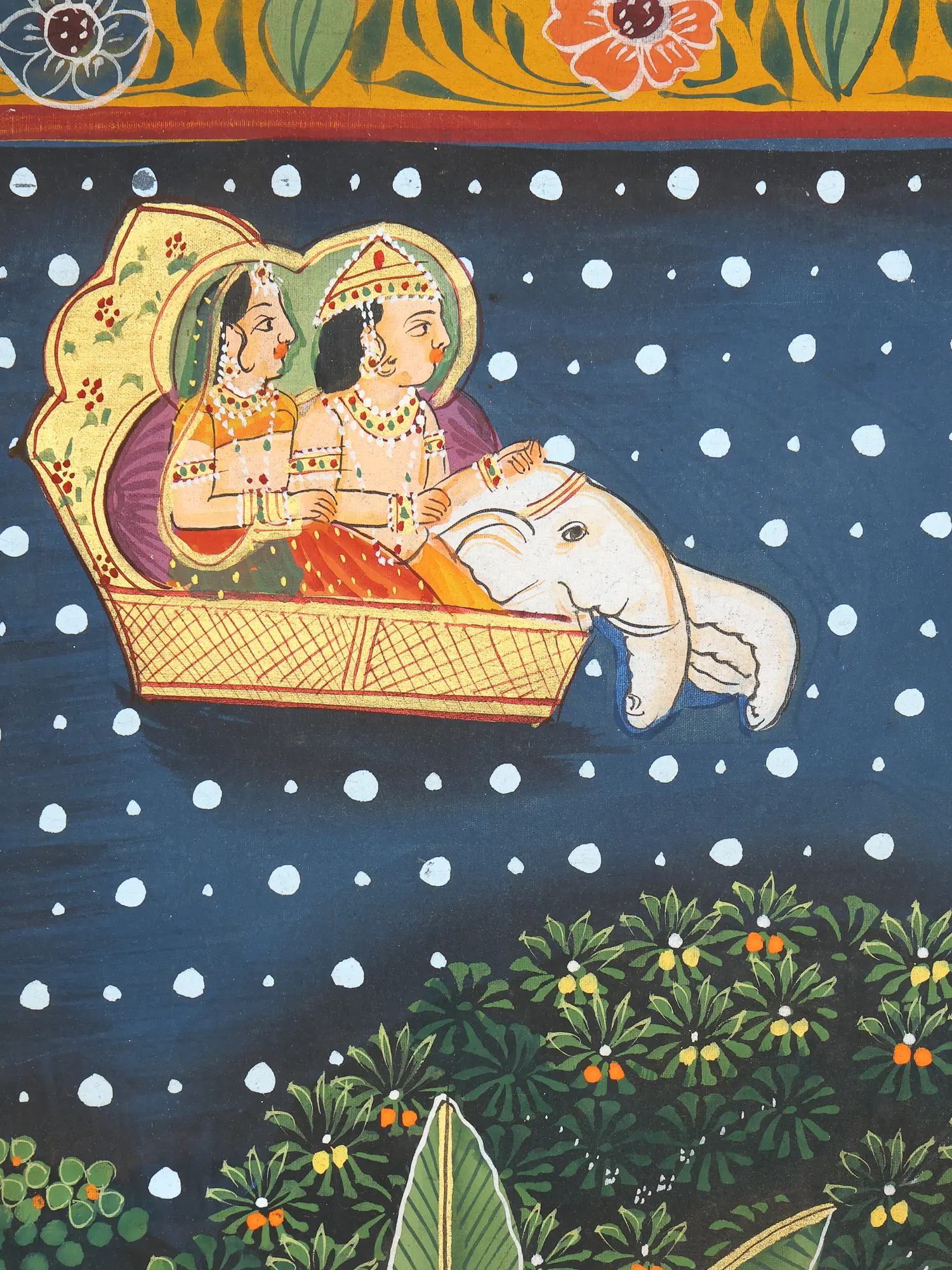 This artwork is a testament to the rich tradition of Pichwai painting, a centuries-old art form originating from Nathdwara in Rajasthan. Pichwai paintings are traditionally used to adorn the walls of temples, narrating stories from the life of Lord Krishna. The use of natural pigments, meticulously applied to cloth, gives these artworks a unique depth and luminosity. The intricate borders, adorned with floral motifs, further enhance the painting's aesthetic appeal, framing the divine narrative with exquisite craftsmanship. This grand piece, with its substantial size, is sure to become a breathtaking focal point in any space, inviting contemplation and spiritual reflection.