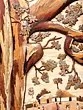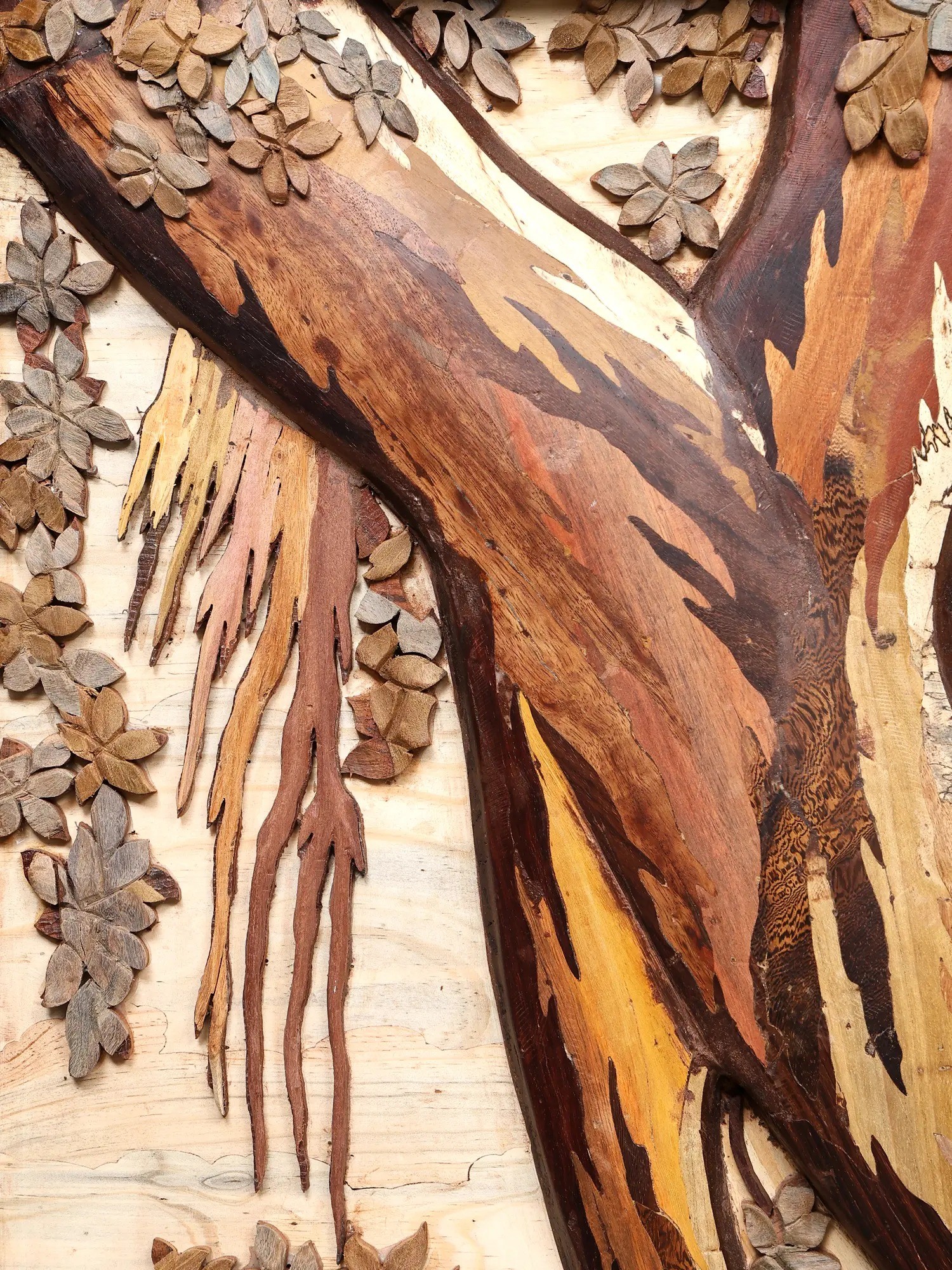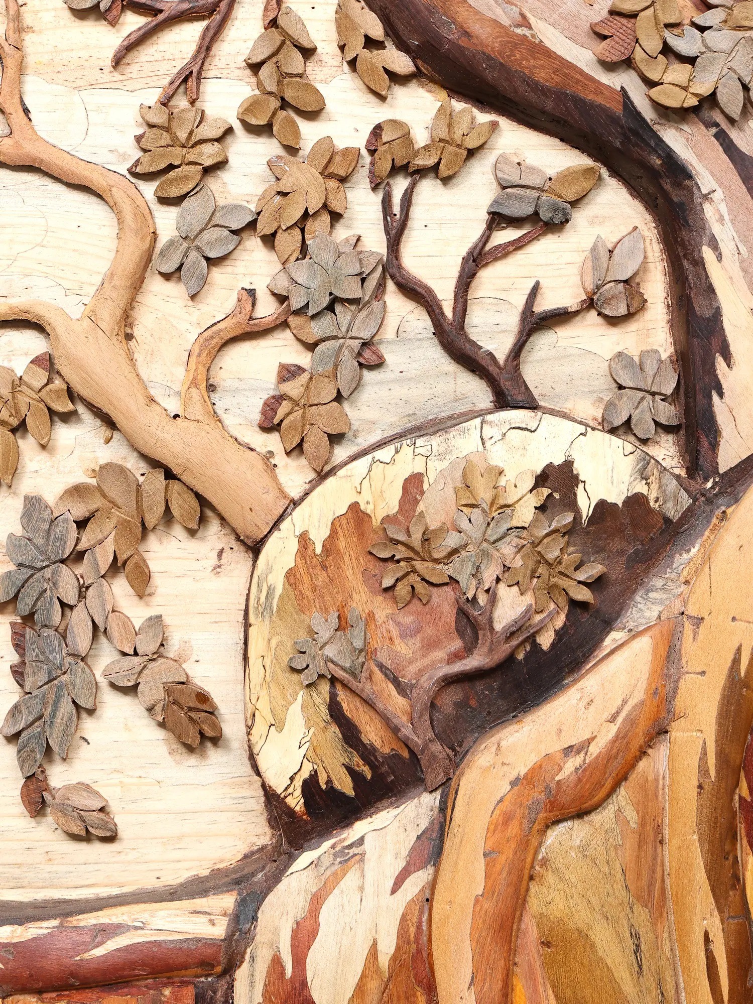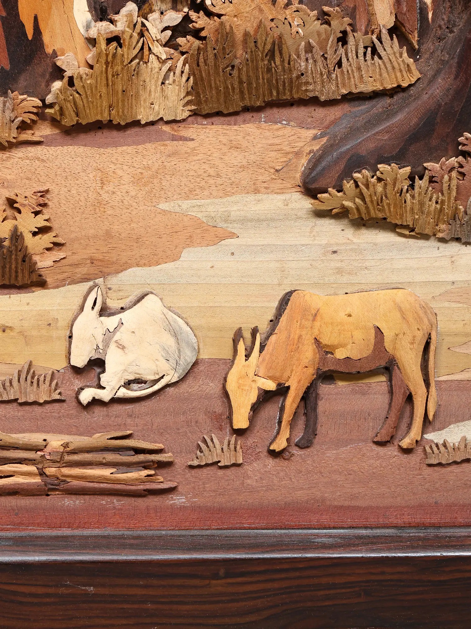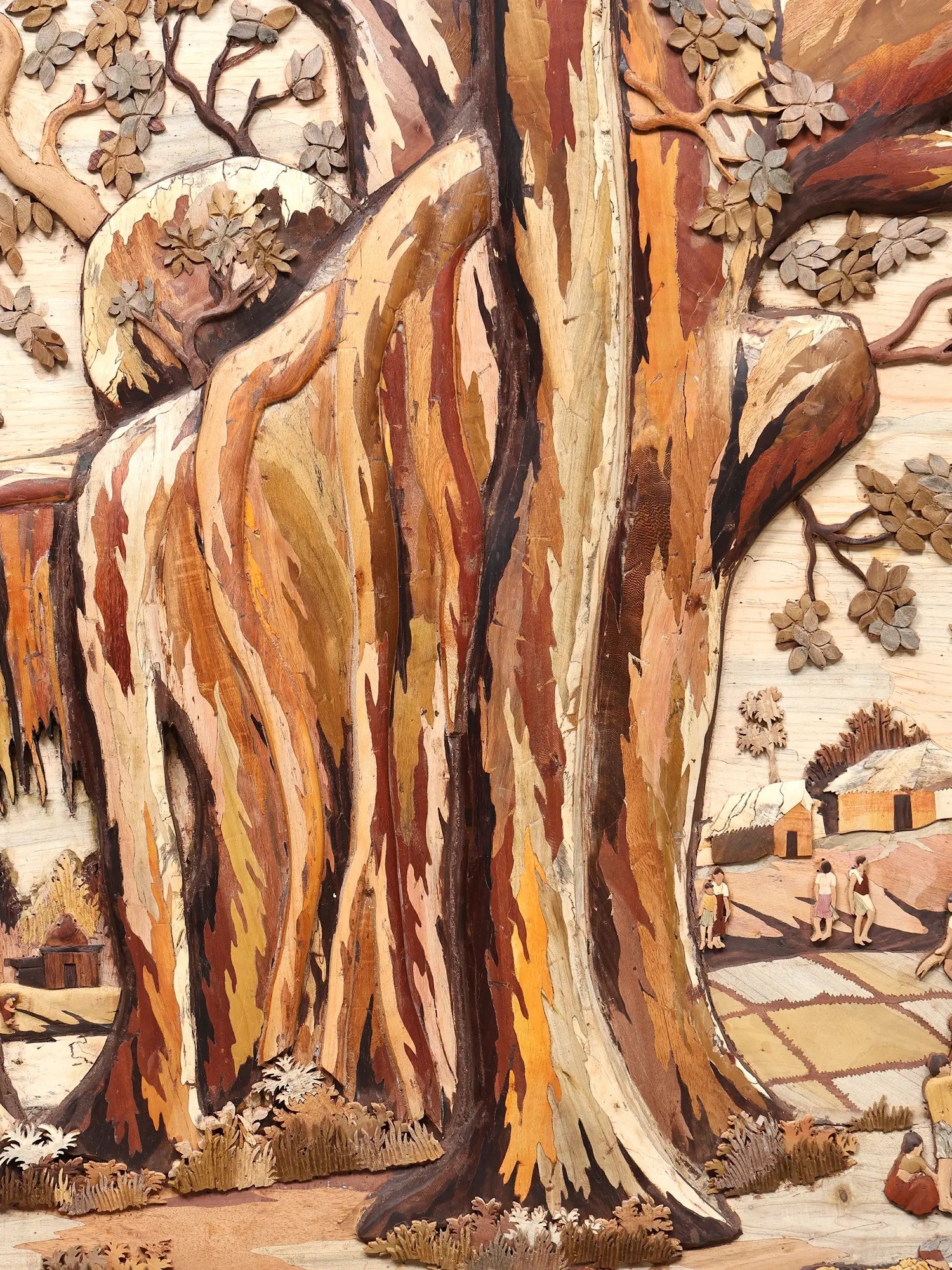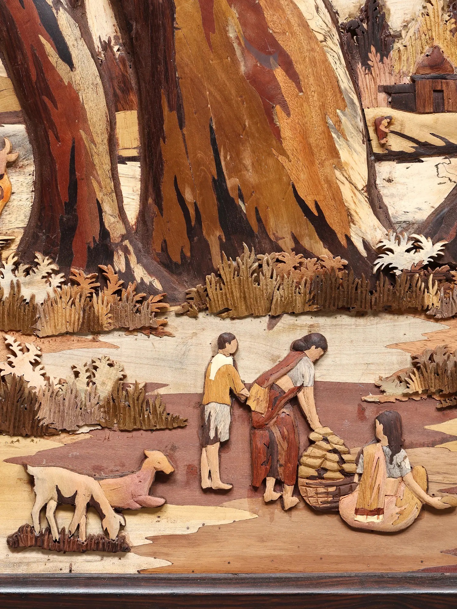 This exquisite wooden inlay panel transports the viewer to the heart of an Indian village, a vibrant tableau of everyday life unfolding beneath the majestic, sprawling branches of a banyan tree. More than just a decorative piece, this artwork is a narrative woven from meticulously inlaid wood, capturing the essence of community, labor, and the profound connection to nature that defines rural existence. The sheer scale of the panel, measuring 57 inches in width, allows for an immersive experience, drawing you into a world where time seems to move at a gentler pace. The banyan tree, a recurring motif in Indian mythology and folklore, stands as the silent, benevolent guardian of this scene. Revered as a symbol of immortality, resilience, and divine protection, the banyan often serves as a gathering place, a temple under the open sky, and a witness to generations of human stories. Its aerial roots, depicted with intricate detail, seem to descend like blessings, grounding the entire composition. The masterful use of different wood grains and subtle color variations breathes life into the gnarled bark and the delicate foliage, creating a sense of depth and organic texture. ––––––––––––––––––––