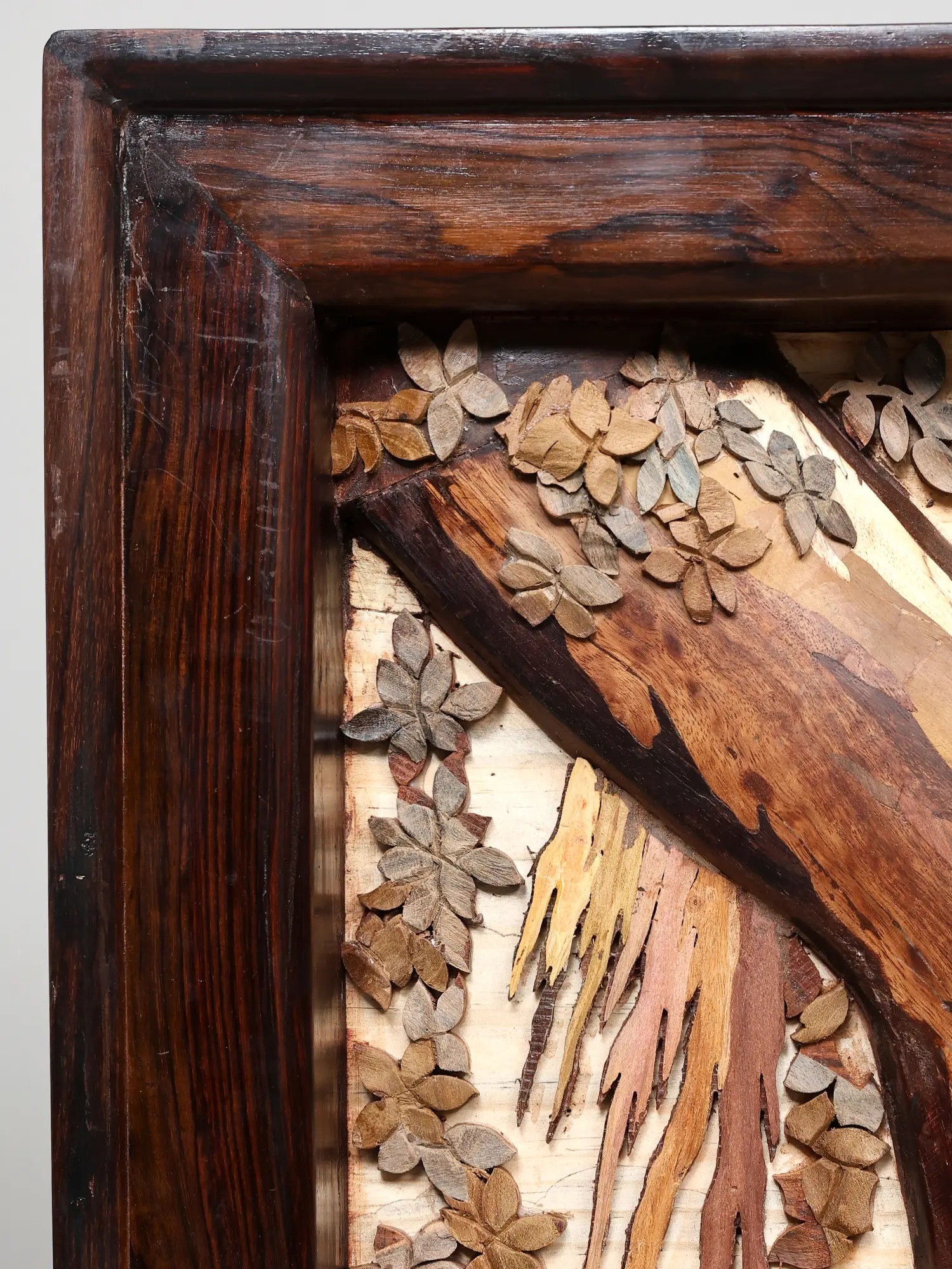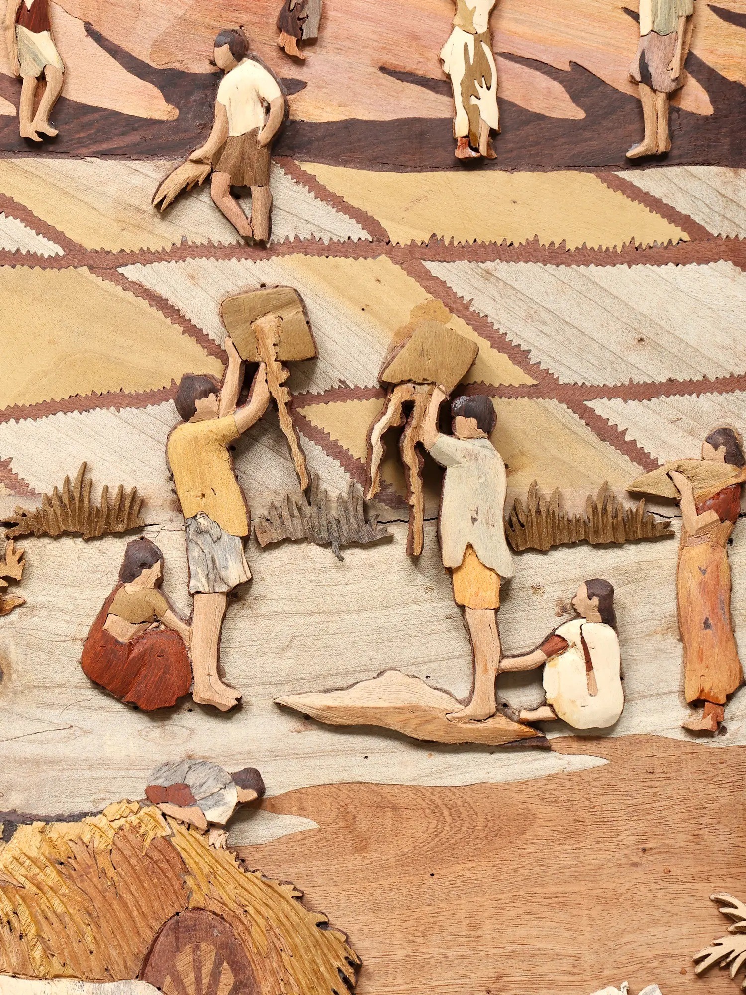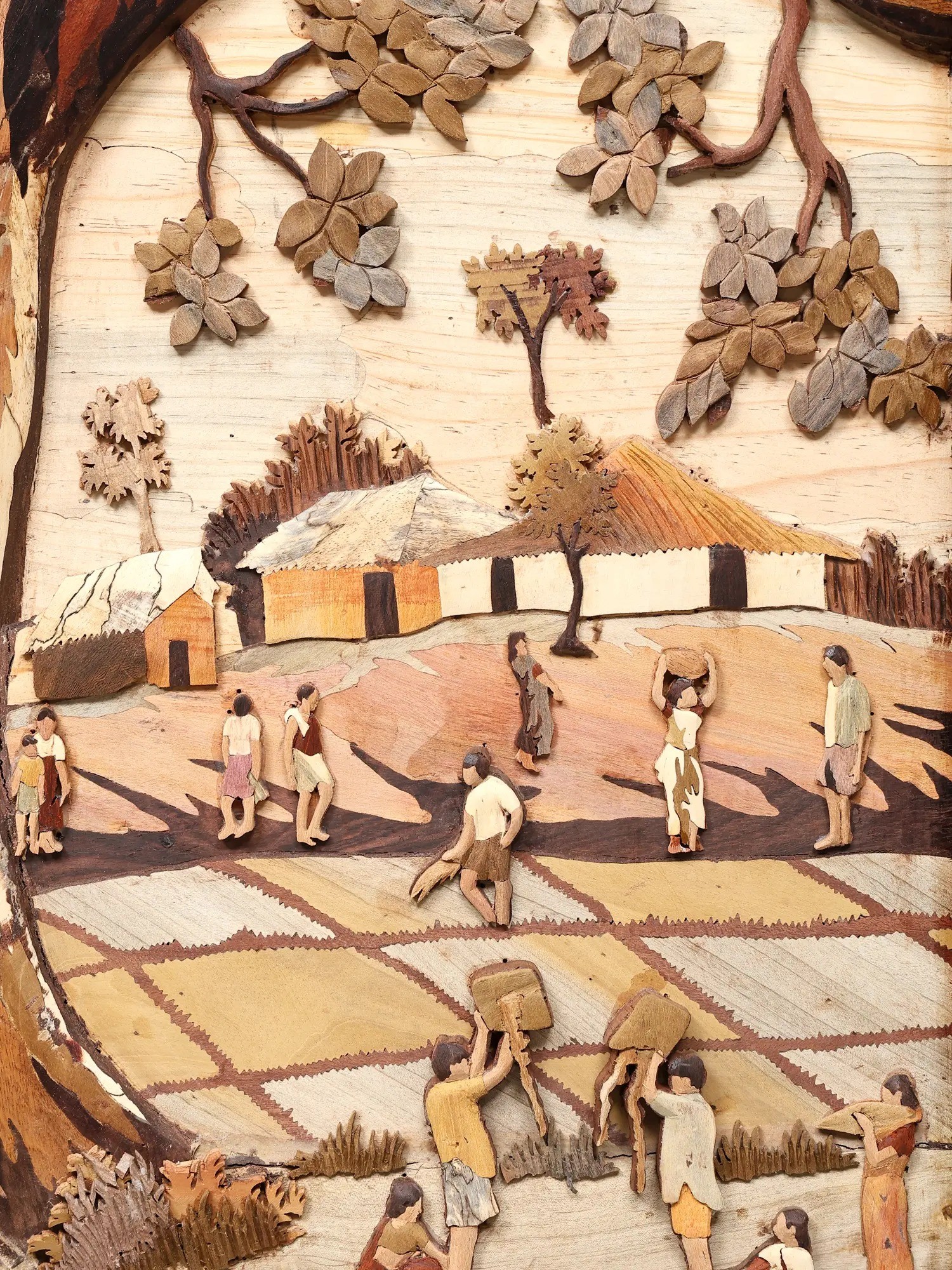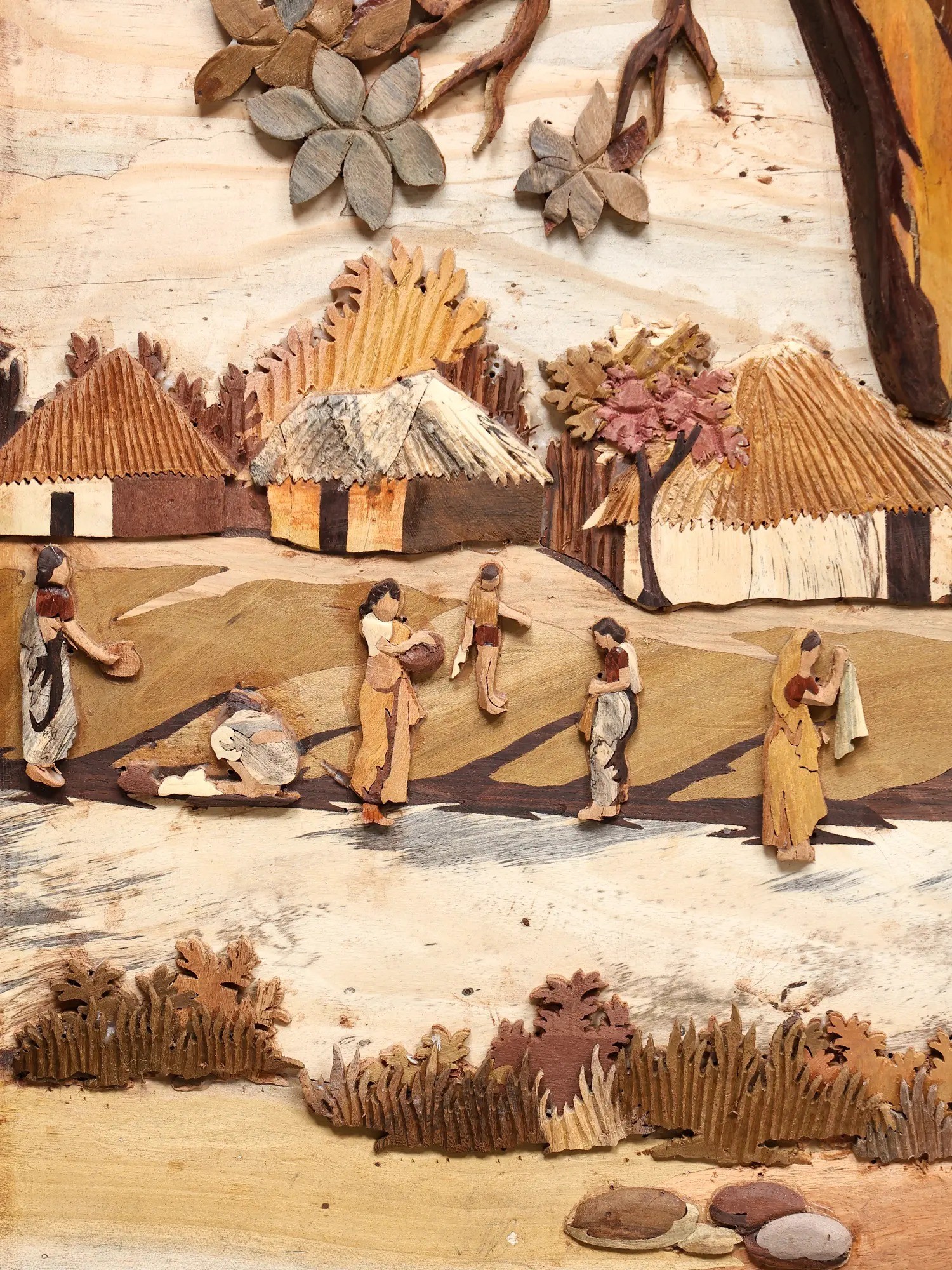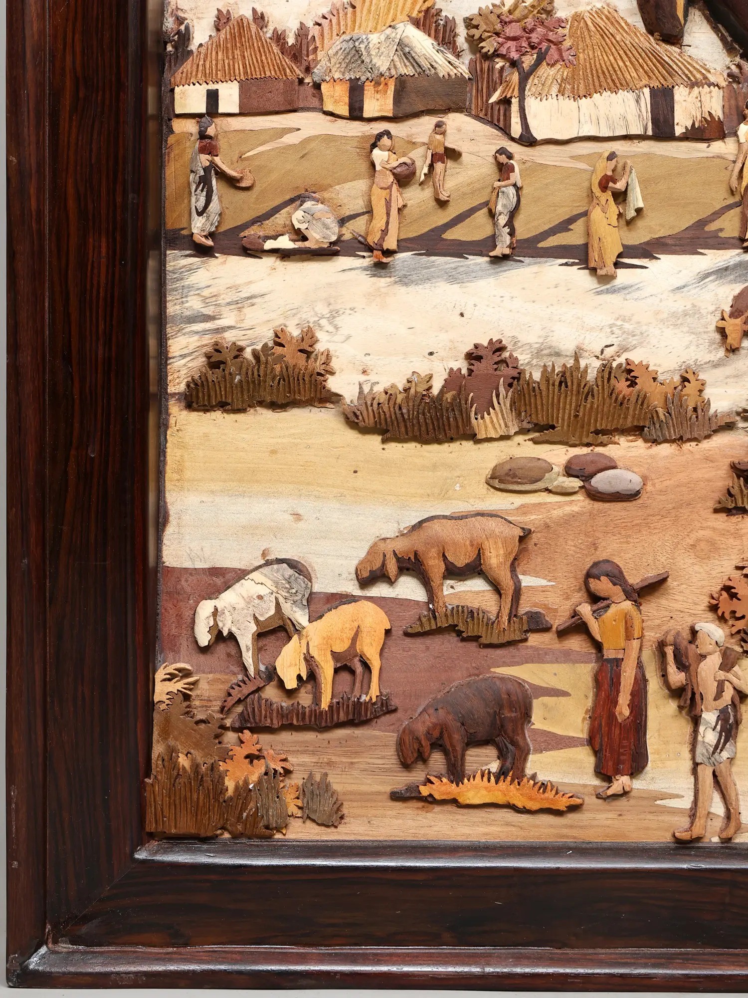 Beneath the arboreal canopy, a microcosm of rural activity unfolds. Figures, rendered with charming simplicity, are engaged in a variety of tasks that paint a picture of a self-sufficient and harmonious community. Farmers are seen tending to their fields, their silhouettes against the textured earth suggesting a deep understanding of the land. Animals – oxen, goats, and perhaps even a dog – mingle organically with the human inhabitants, highlighting the symbiotic relationship between man and beast in this agrarian setting. The artist has skillfully utilized the natural hues of various woods to delineate each element, from the straw-thatched roofs of humble dwellings to the subtle shades of the earth and the varying tones of the sky. The intricate detailing on the clothing of the villagers, the textures of the harvested crops, and the very ground beneath their feet all contribute to the lifelike quality of the piece. There is a sense of quiet industry, of collective effort, and of a life lived in tune with the rhythms of the seasons. This panel is not merely a depiction of a scene; it is an evocation of a feeling, a memory, and a timeless way of life that continues to resonate deeply within the cultural fabric of India. It is a piece that invites contemplation and appreciation for the enduring beauty of the simple, yet profound, human experience.