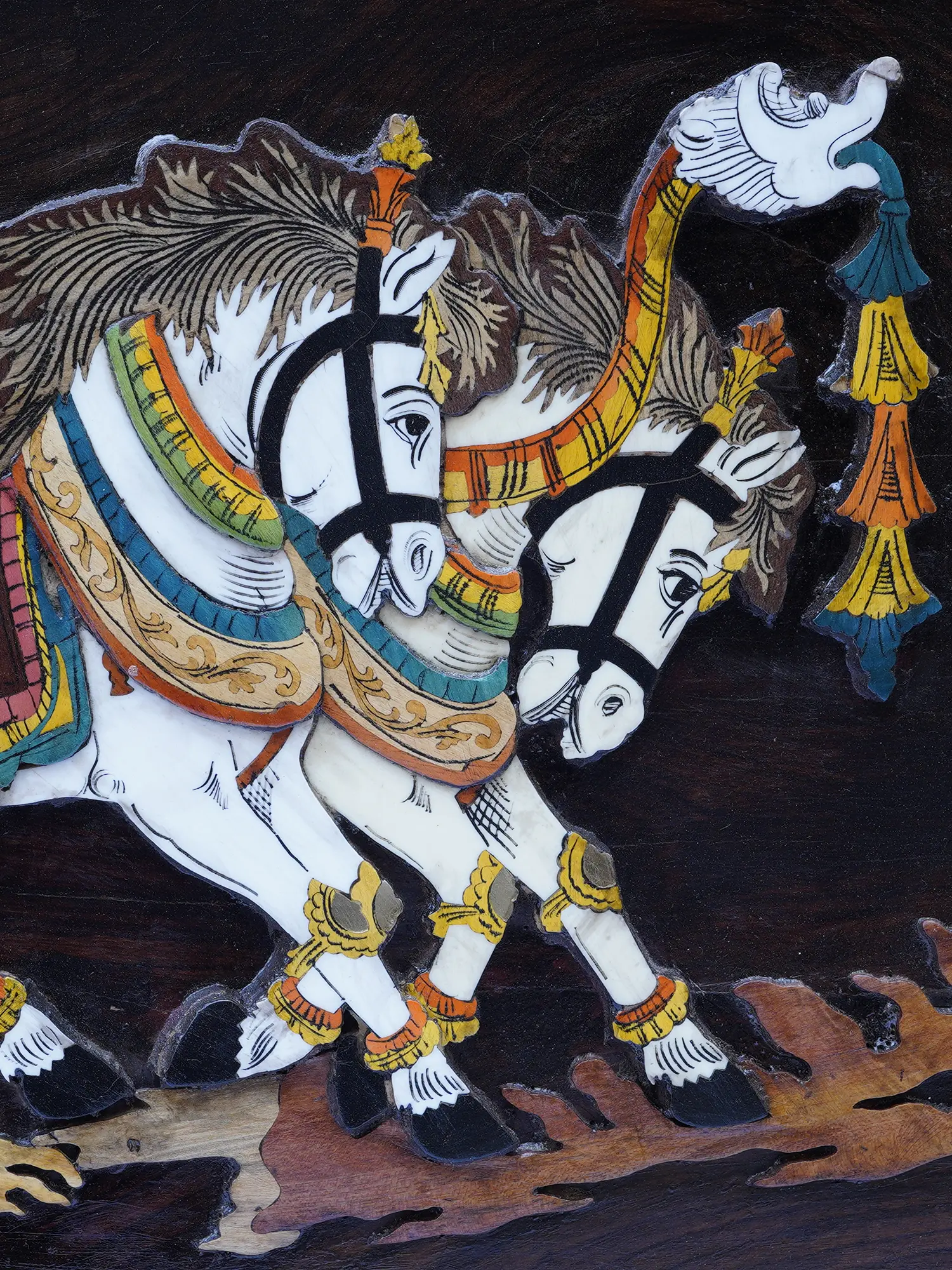 Experience the pinnacle of artisanal tradition with this meticulously crafted rosewood panel, a testament to the renowned inlay techniques of Mysore. Each element is expertly carved and inlaid with exceptional precision, creating a vibrant, tactile tableau that showcases the depth and richness of the materials. The use of premium rosewood provides a deep, lustrous backdrop, allowing the intricate details of the inlay work to truly command attention.