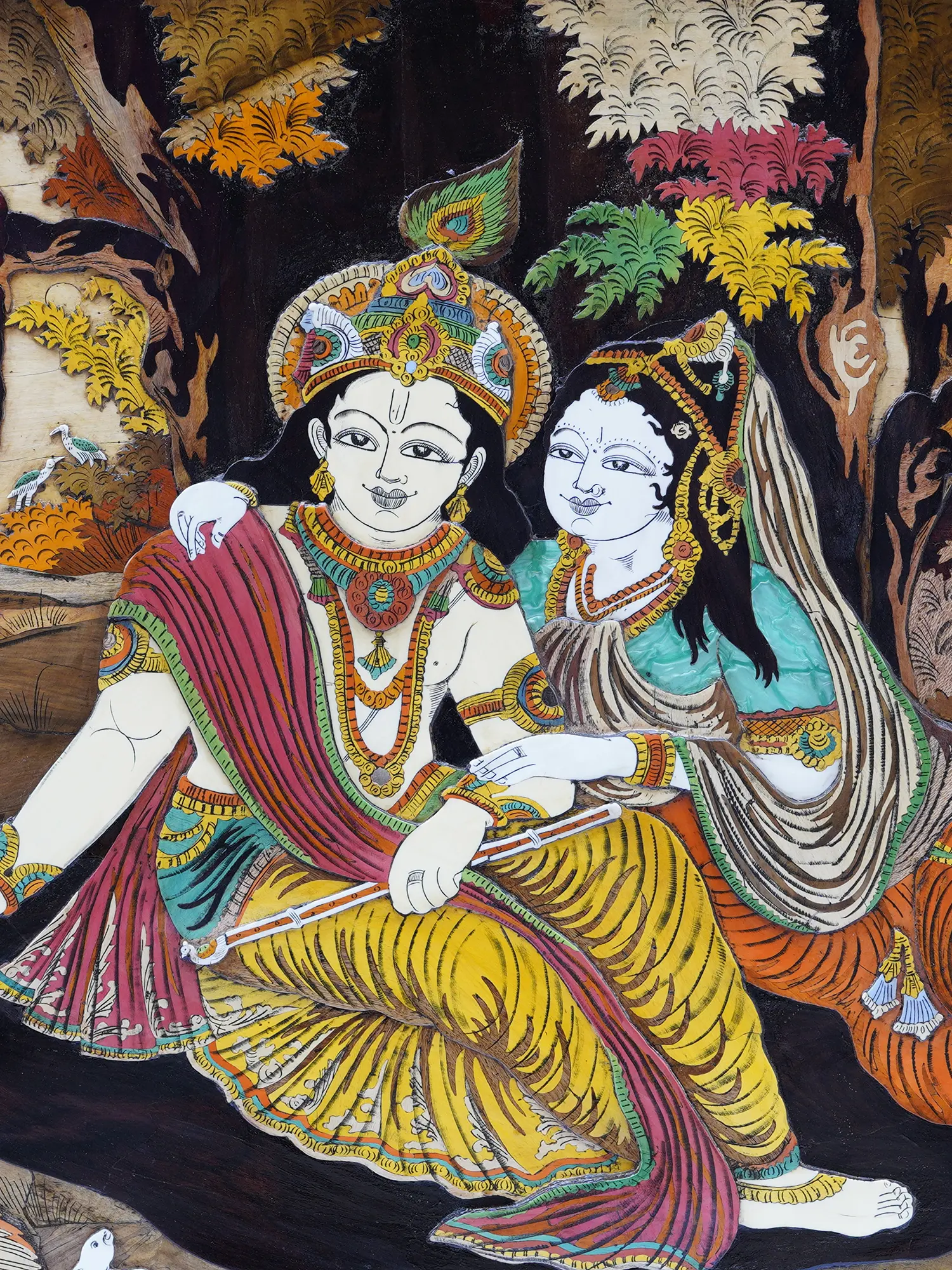 96" Large Superfine Radha Krishna Seated Under the Tree | Colorful 3D Panel in Rosewood with Inlay Work