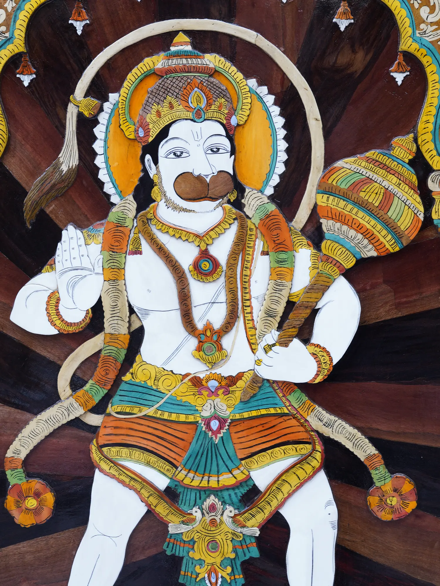 31" Standing Veer Hanuman | Natural Color On 3D Wood Painting With Inlay Work
