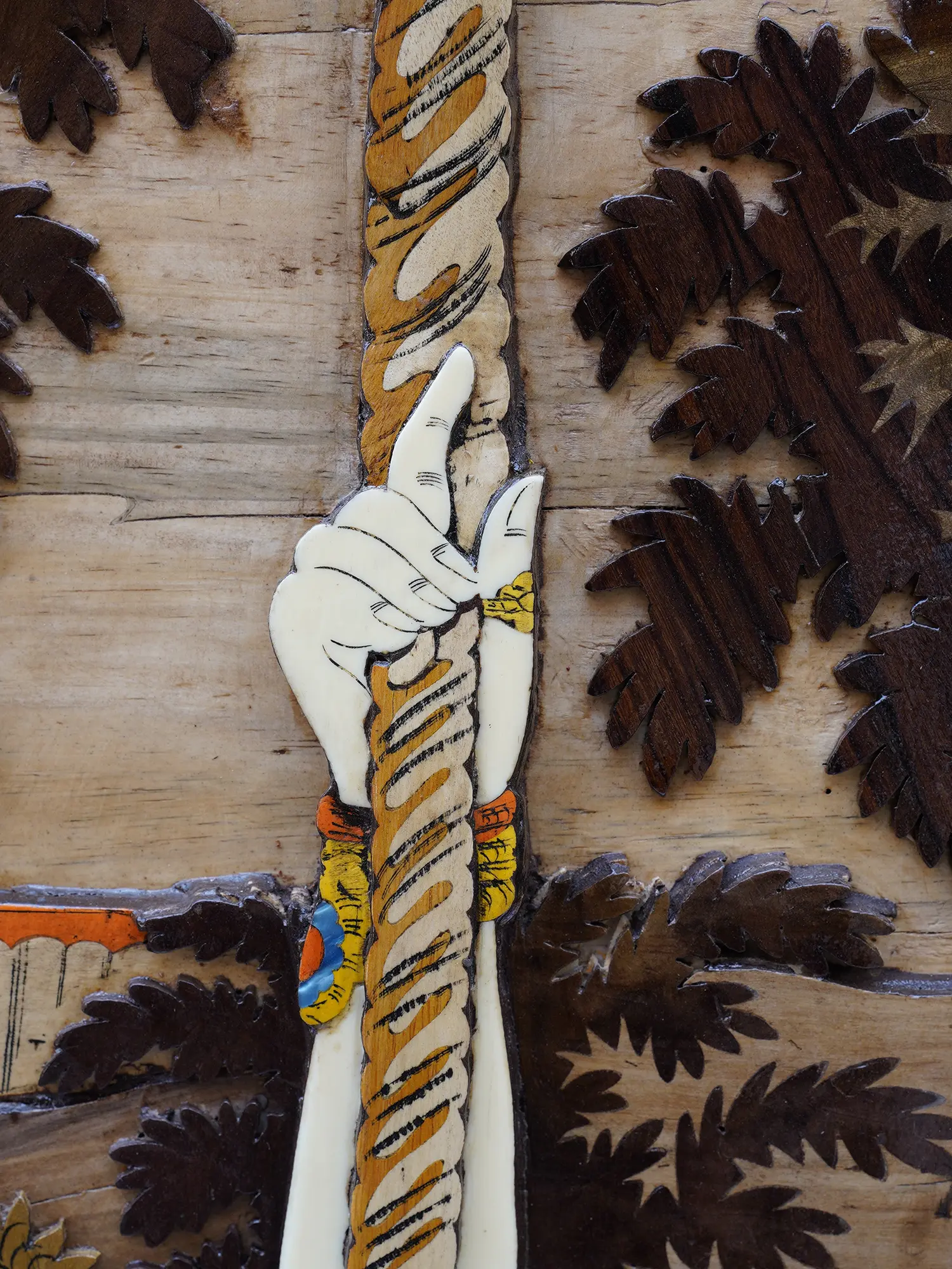 Crafted from the finest rosewood, this panel is a masterpiece of traditional Indian inlay work. Each element, from the graceful figures to the lush foliage, is meticulously carved and meticulously inlaid using a symphony of complementary woods and materials. The artisans have breathed life into the dense rosewood, demonstrating unparalleled precision and a deep understanding of their medium.