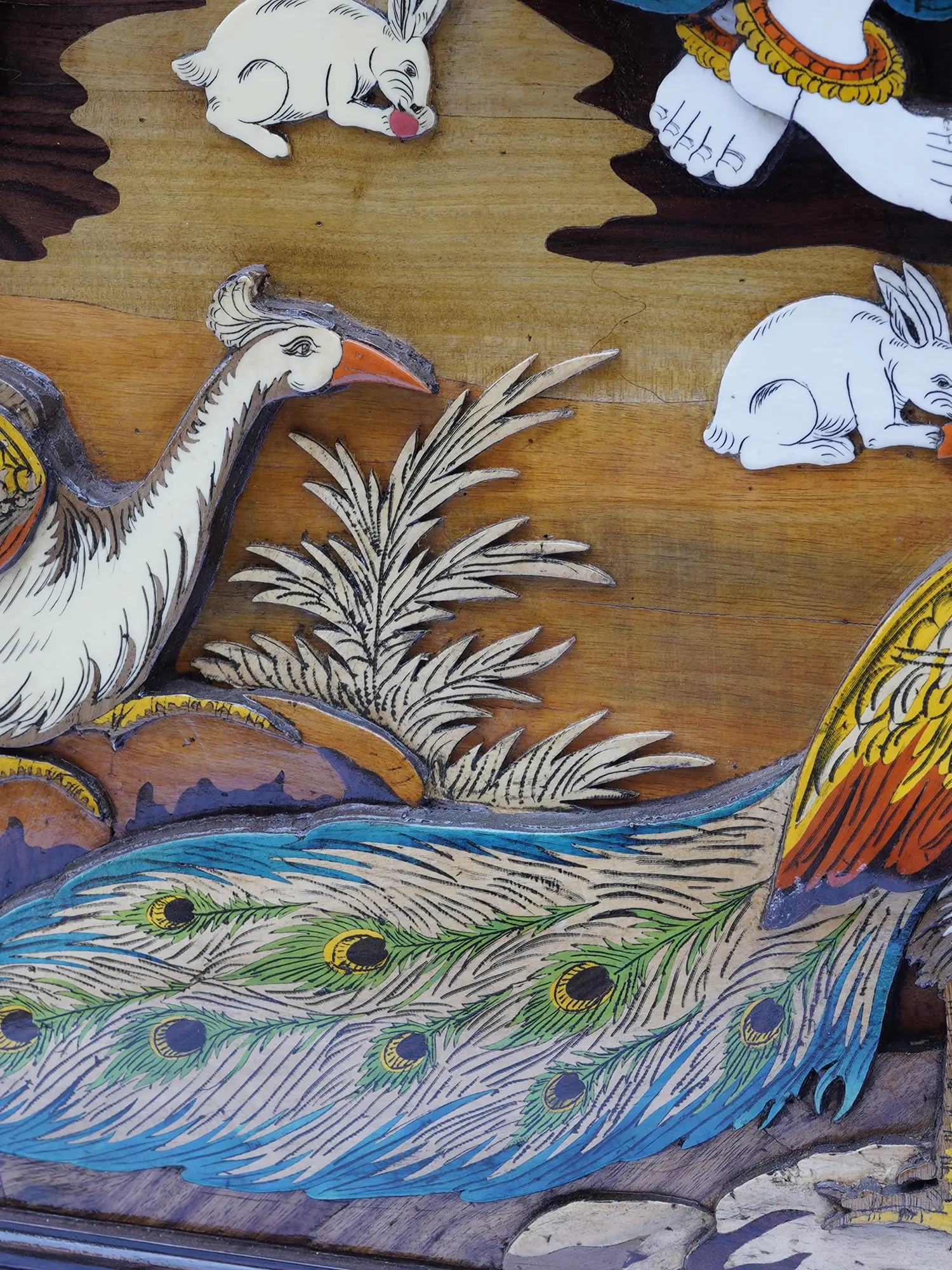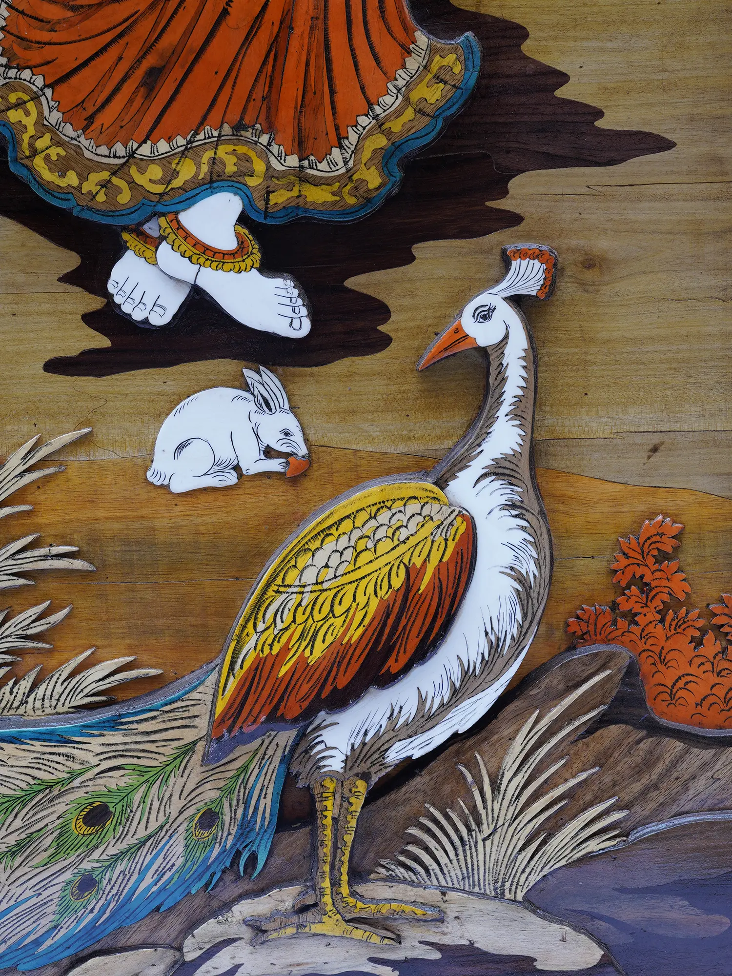 The scene unfolds with breathtaking clarity and vibrancy, measuring sixty-one inches in width and thirty-seven inches in height. You will appreciate the exquisite detailing of Radha and Krishna, adorned in their divine attire, their expressions serene and loving. The surrounding natural elements—the gnarled branches, the vibrant leaves, and the graceful peacocks—are rendered with such lifelike texture and color that they seem to emanate from the wood itself. The subtle hues and varied grains of the inlaid woods create a stunning three-dimensional effect, drawing you into the heart of the pastoral scene.