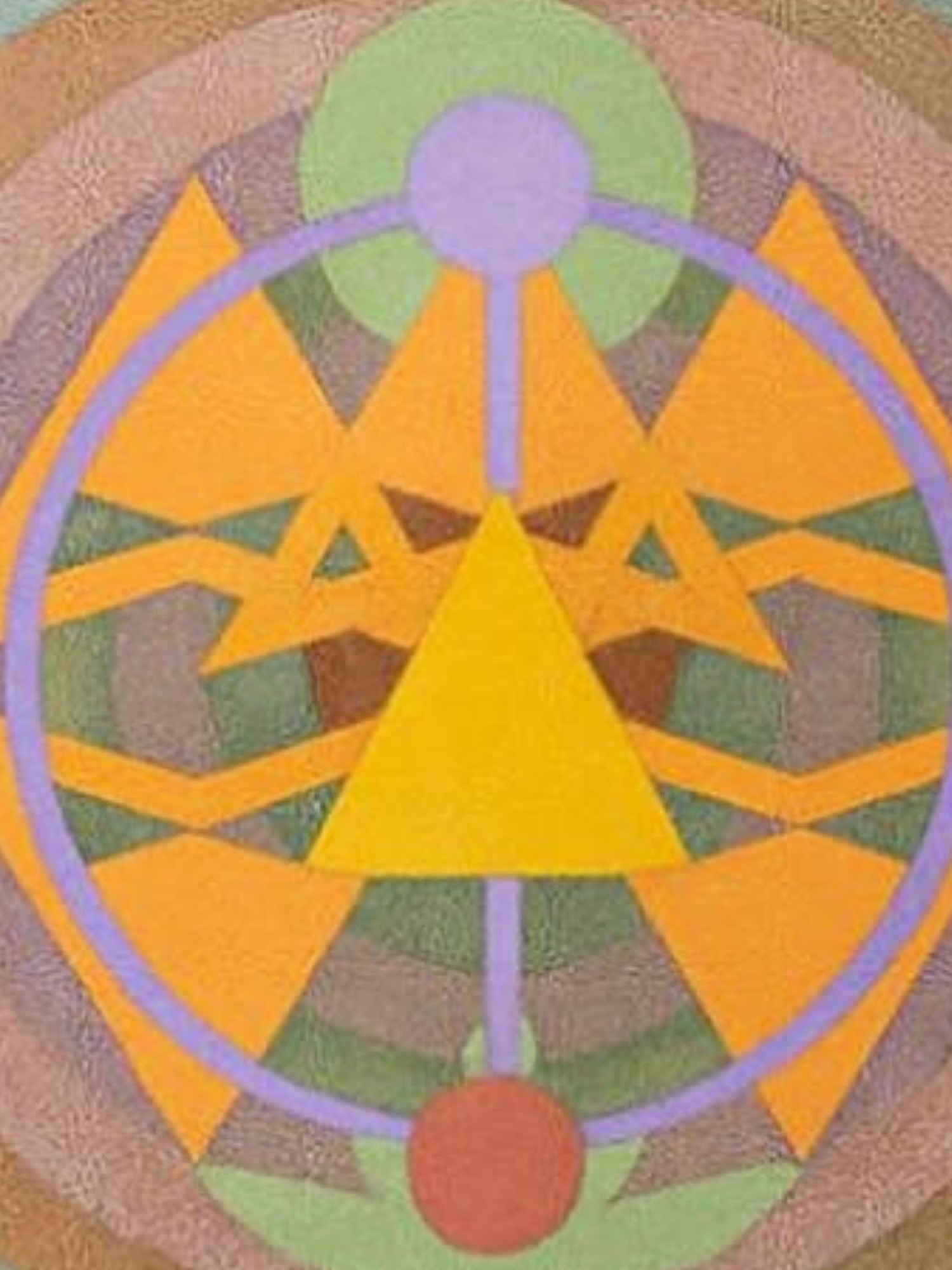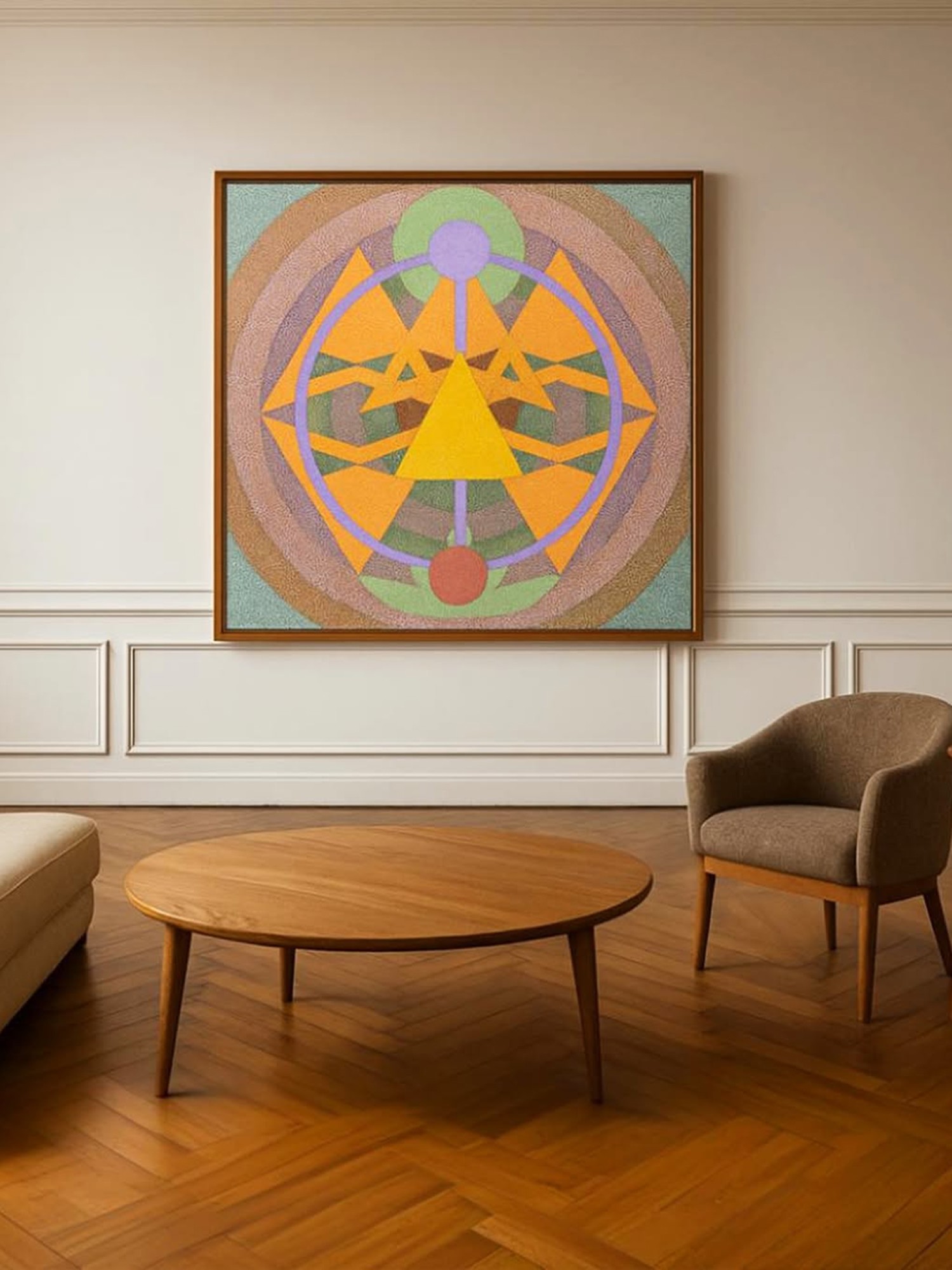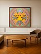 Dominated by bold geometric shapes and a captivating color palette, this creation offers a feast for the eyes. The interplay of triangles, circles, and concentric arcs creates a dynamic yet balanced composition. Its expansive 42-inch square format ensures it commands attention, becoming a focal point in any sophisticated space. The careful layering of hues contributes to its depth and visual appeal.