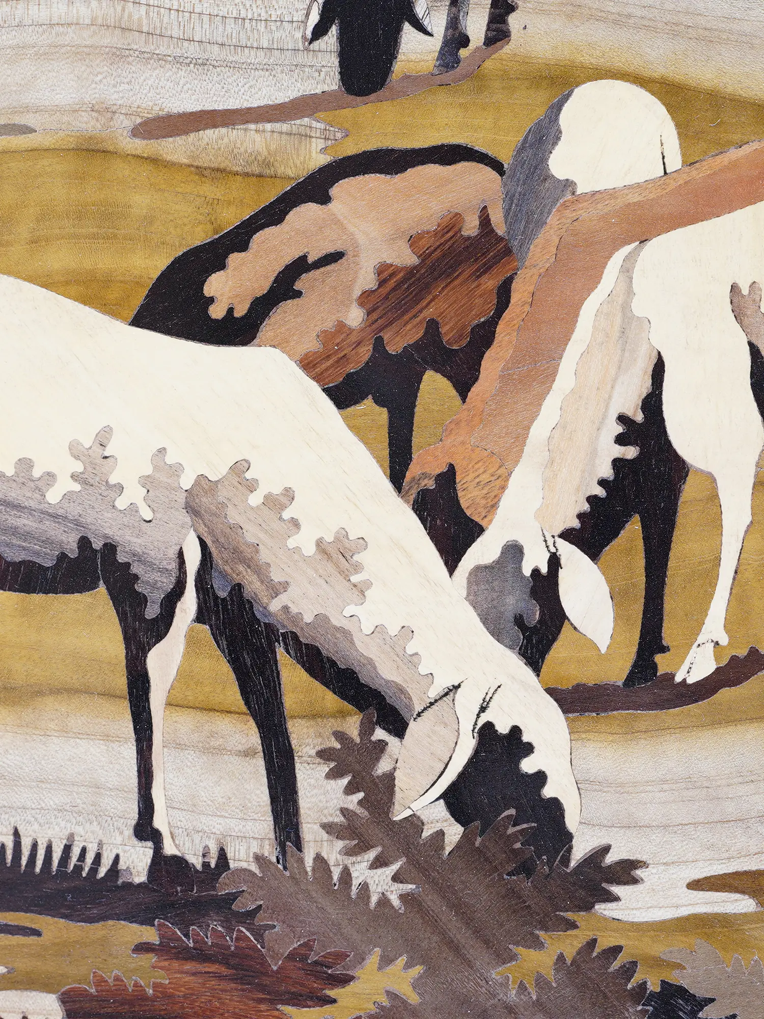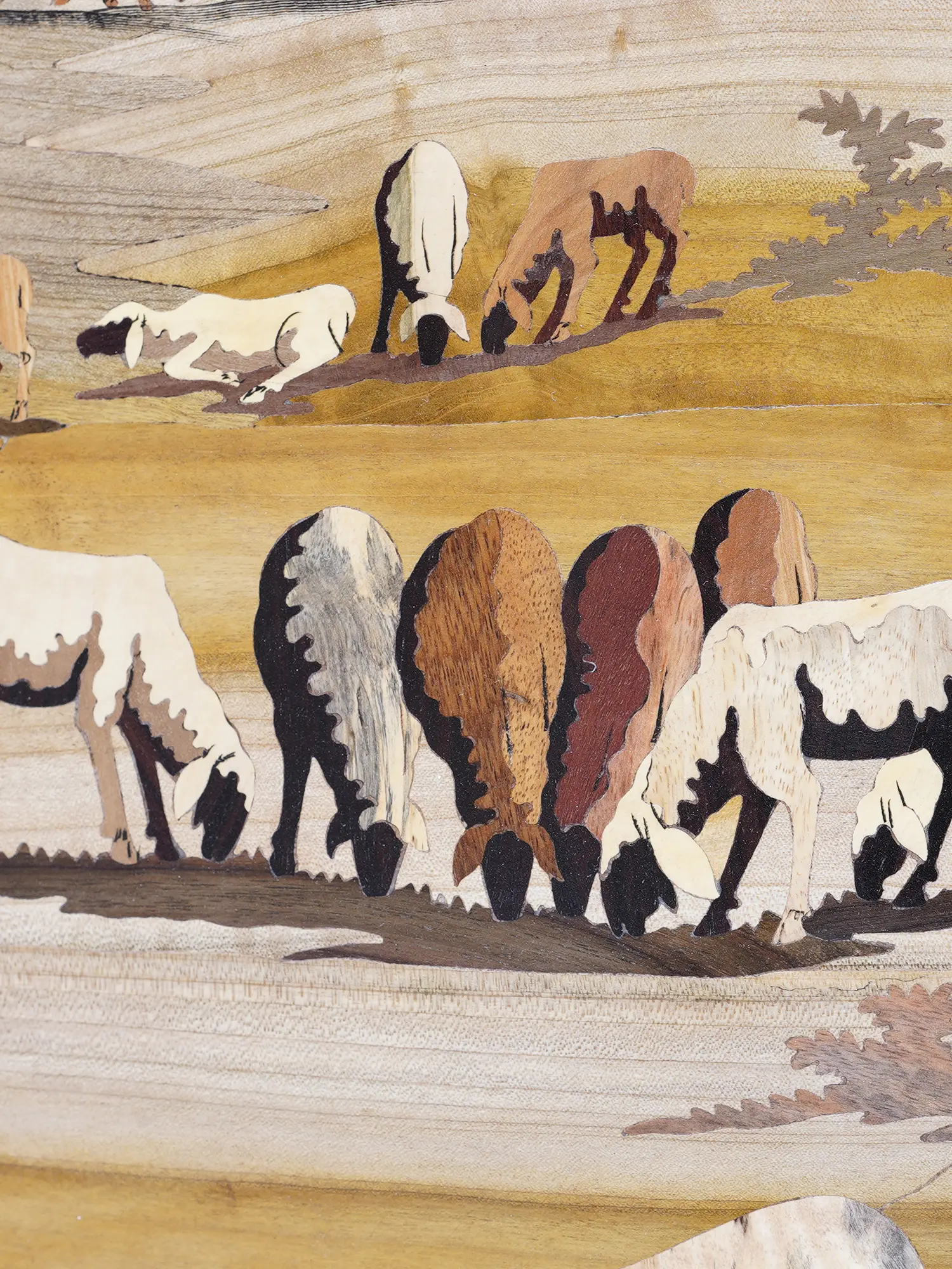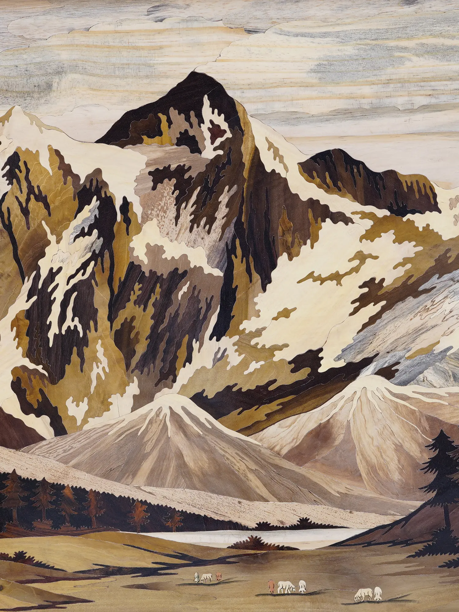 Observe how diverse wood grains and natural tones are expertly combined to depict snow-capped peaks, verdant valleys, and a meandering river. The delicate rendering of the flock, the shepherd's sturdy form, and the rustic charm of distant dwellings are all brought to life through this masterful inlay. This large-scale work, measuring an impressive 72 inches in width and 48 inches in height, commands attention, drawing viewers into its world with remarkable depth and realism. The subtle textures and subtle variations in color create a dynamic visual experience that unfolds with each gaze.