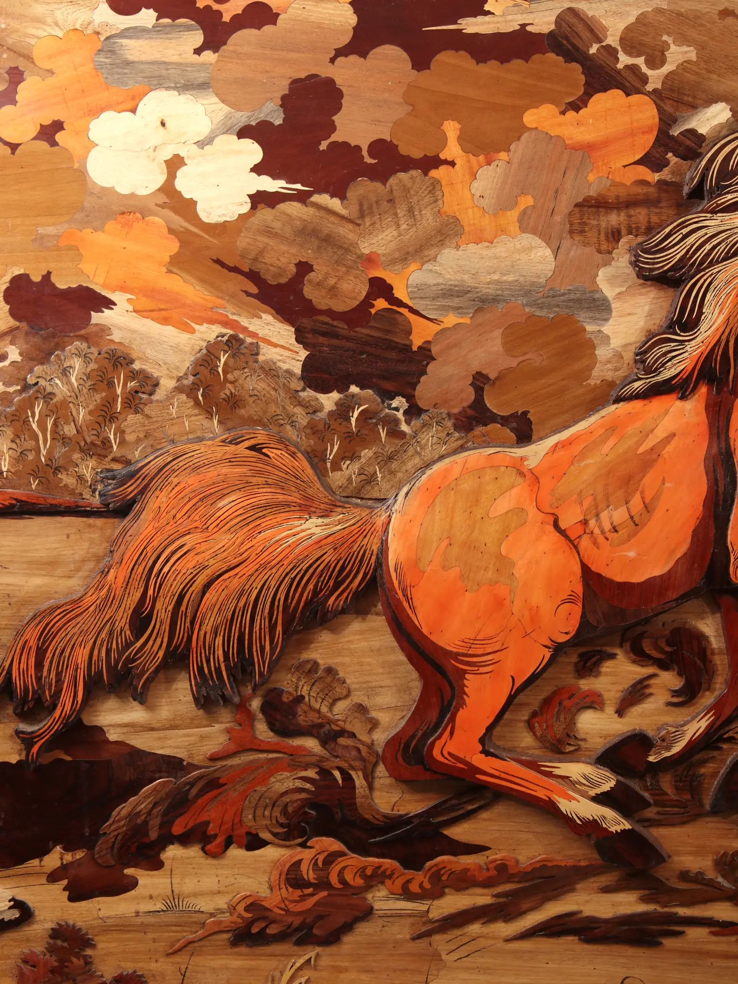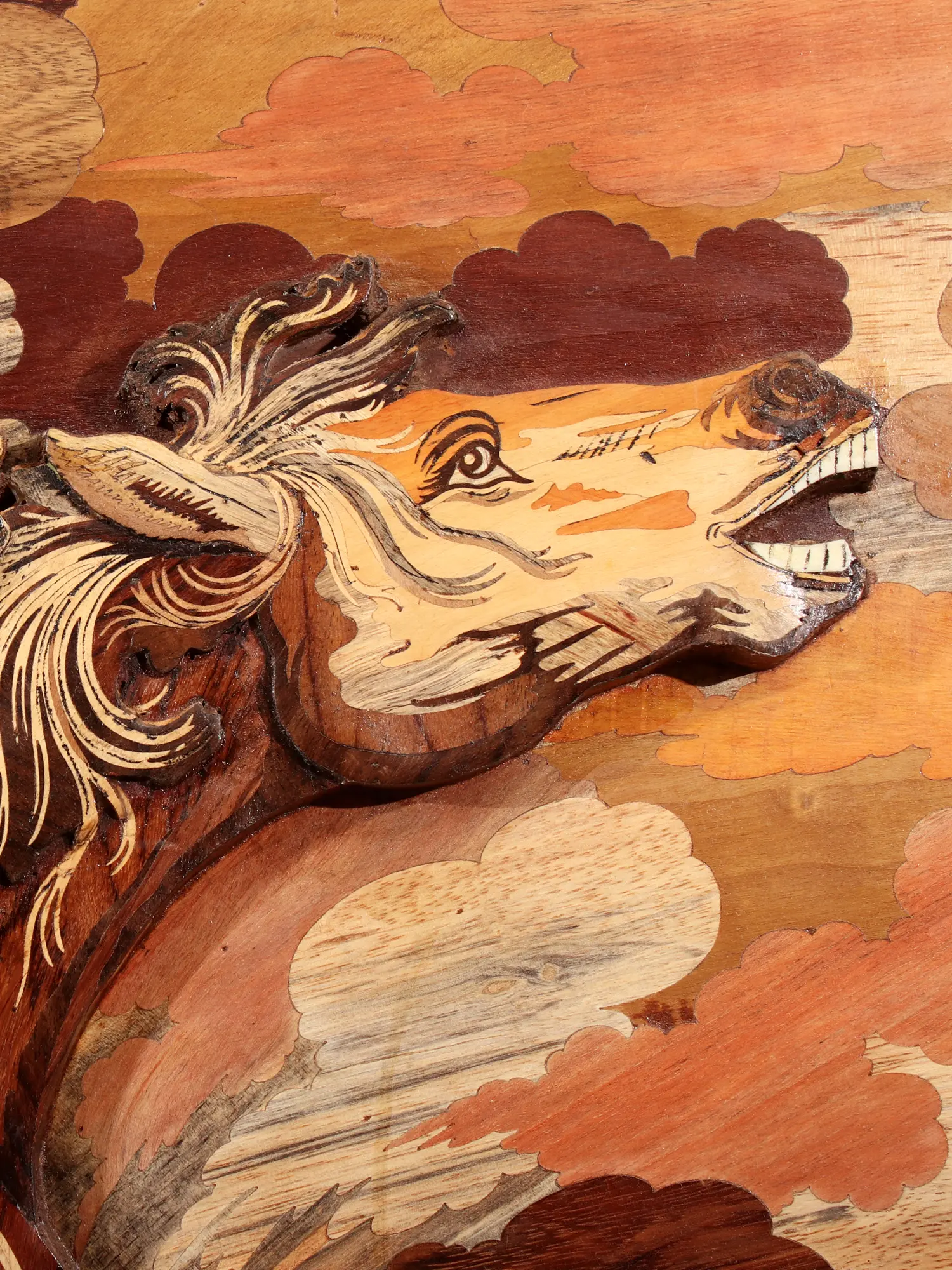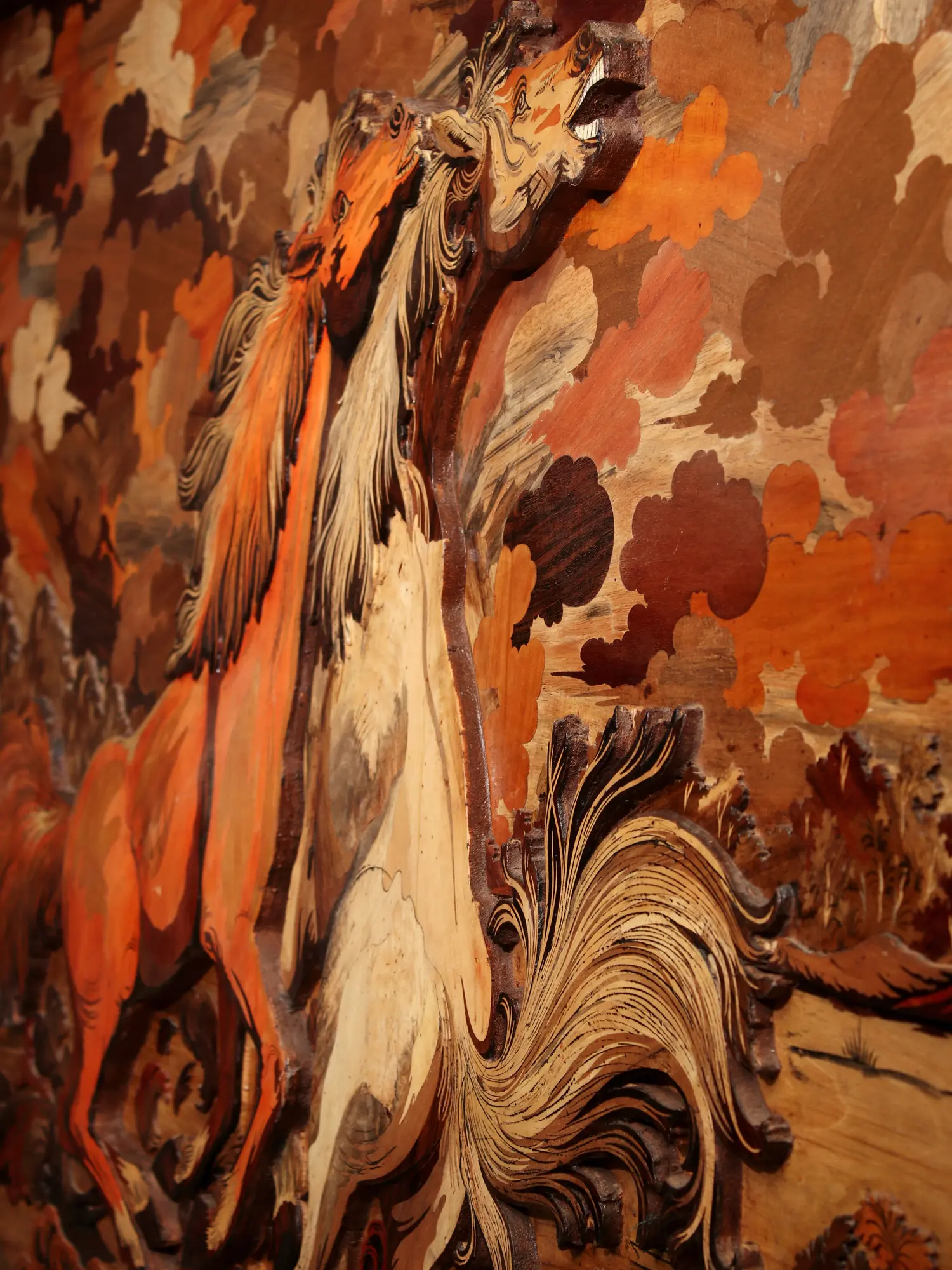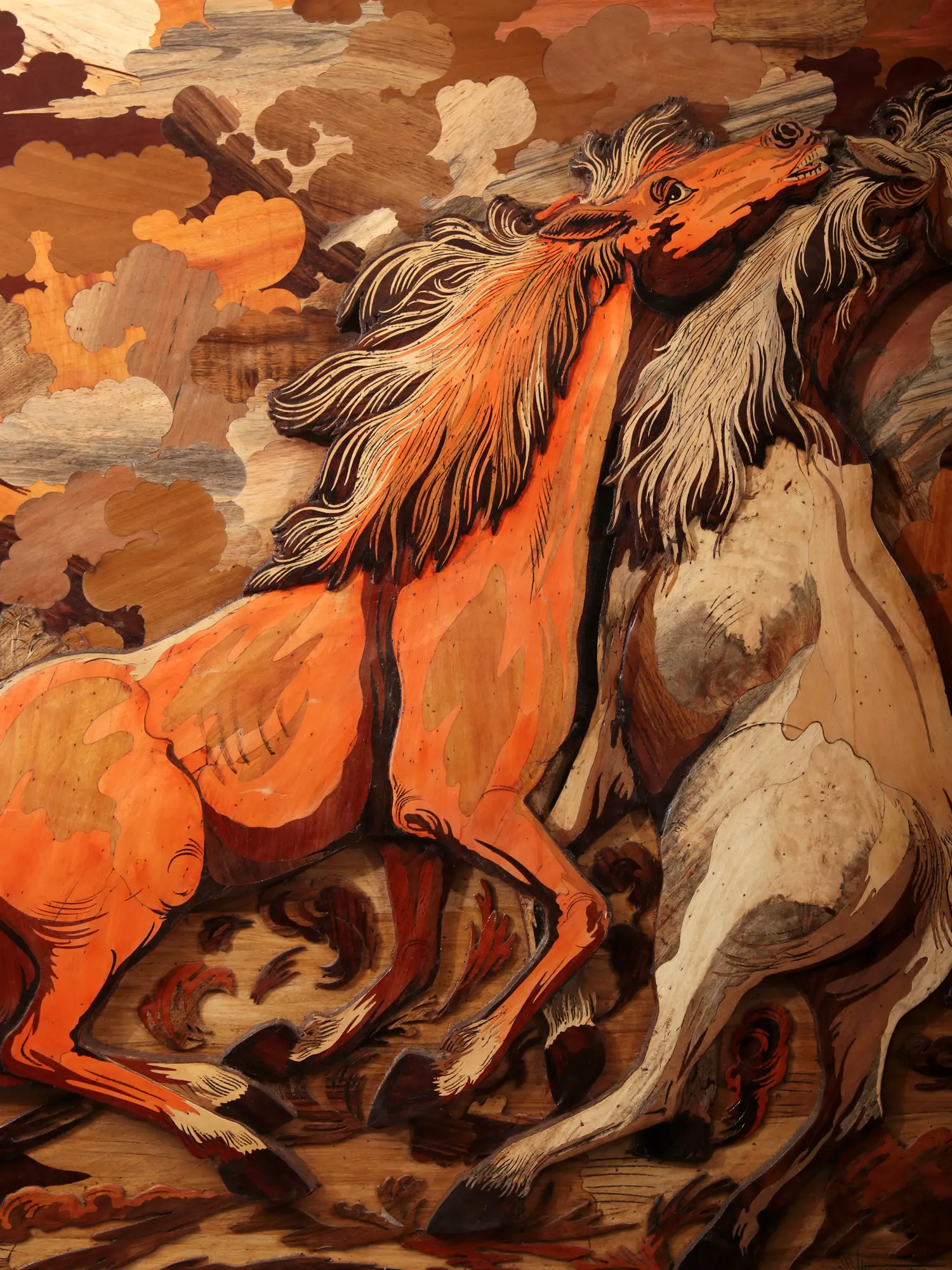 This Large Pair of Two Horses is a 3D Panel made in Rosewood and beautified with Inlay work of natural colors. The use of different shades of brown color gives the art piece a balanced tone that is not too bright yet expressive. The use of off-white color for one horse and some clouds again helps balance the color palate. The image of two horses playing carries symbolic significance across cultures, representing various aspects such as freedom, power, and unity. In many traditions, horses embody strength, grace, and untamed spirit.