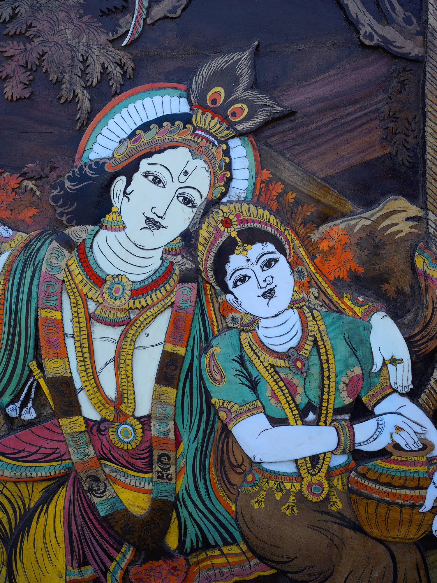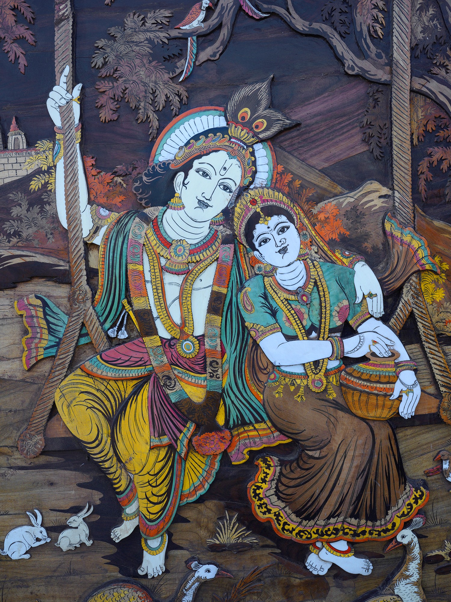 72" Large River Side Seated Radha Krishna | 3D Art Wood Panel with Inlay Work