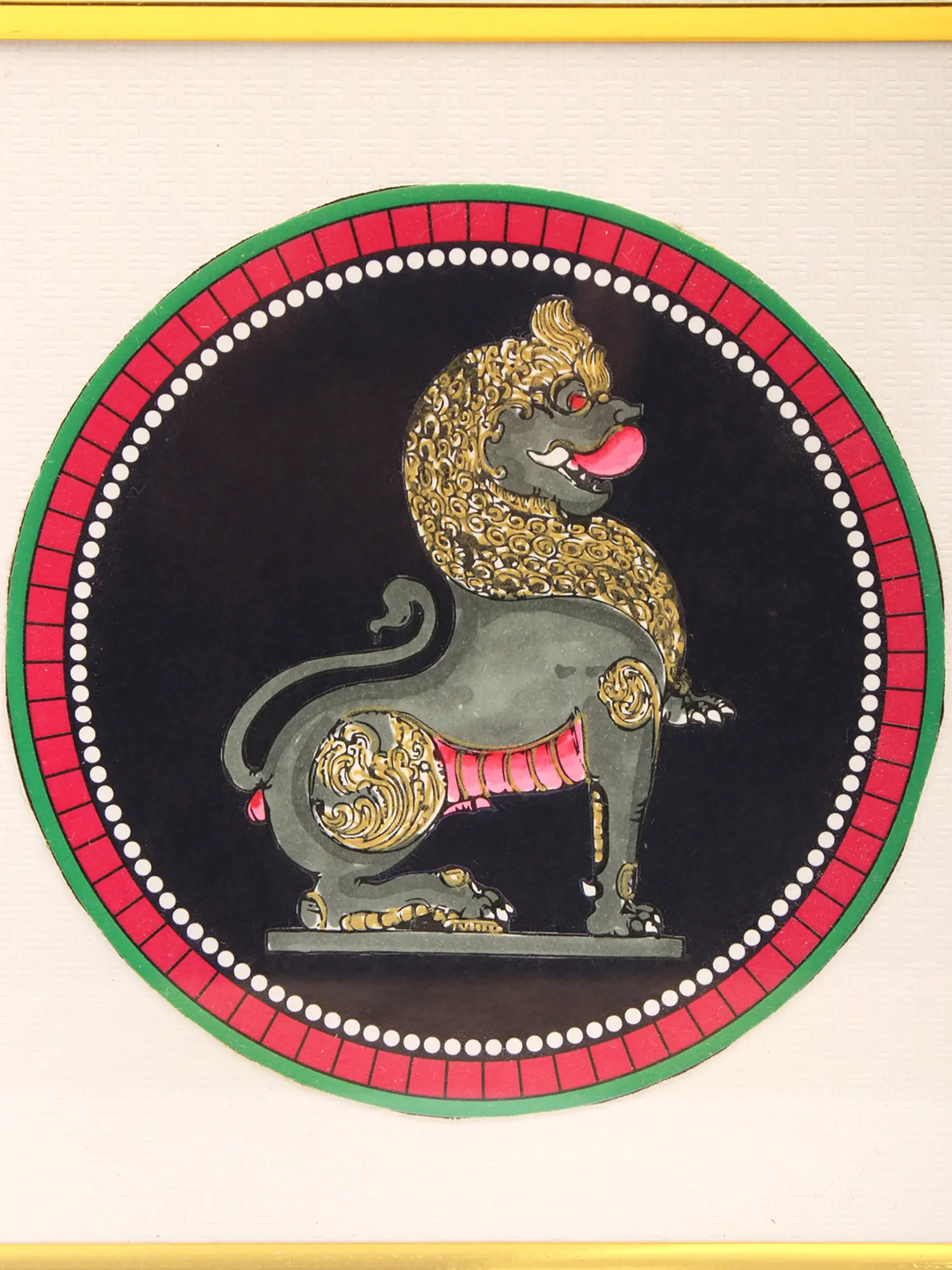 This Framed Ganjifa painting (watercolor on paper) emerges as a regal masterpiece, featuring a Yali or Vyala in resplendent hues and a graceful pose. The intricate details of the creature are brought to life with vibrant colors, capturing its majestic essence. The ornate frame complements the painting's grandeur, adding a touch of regality to the entire piece.