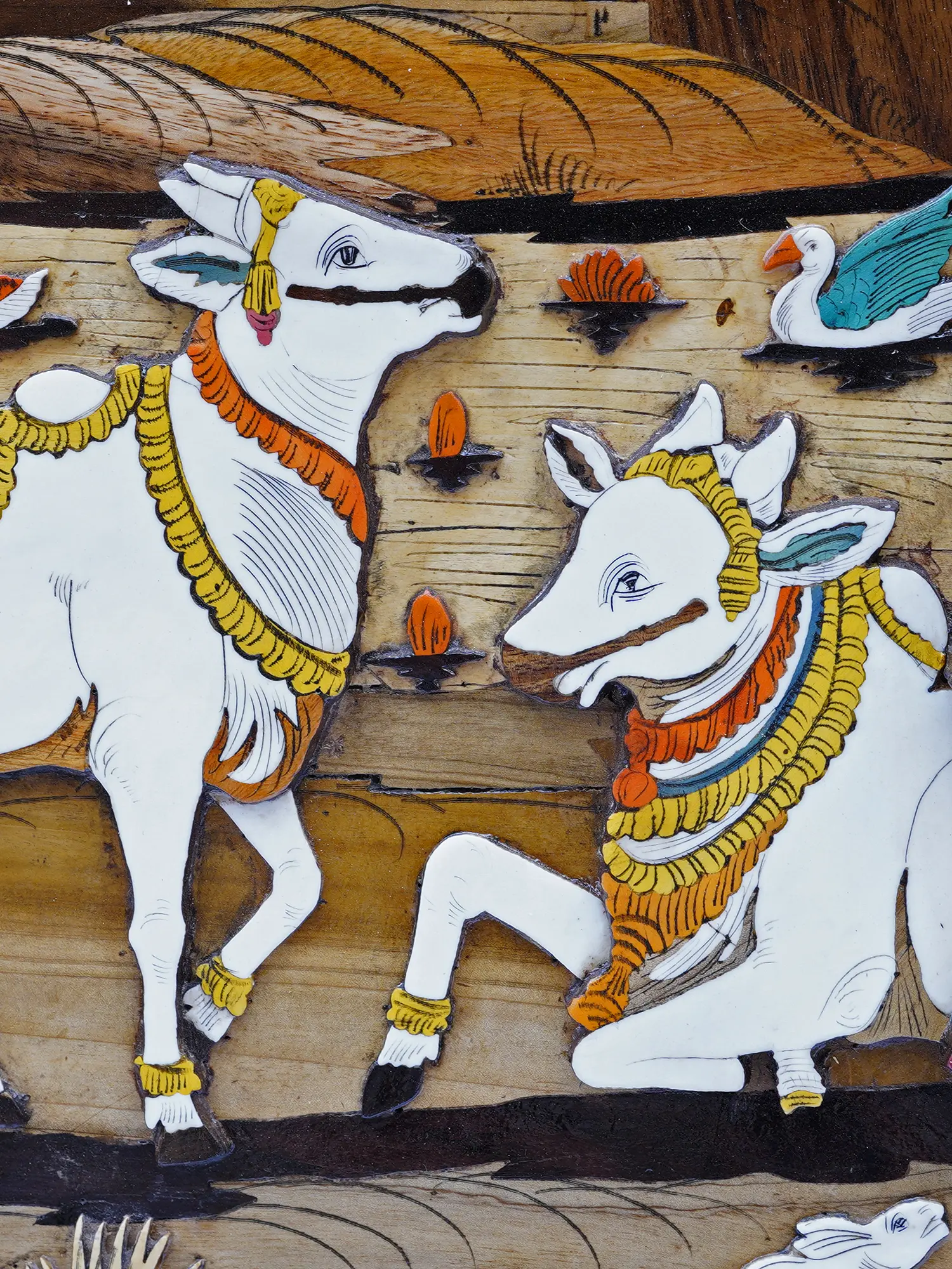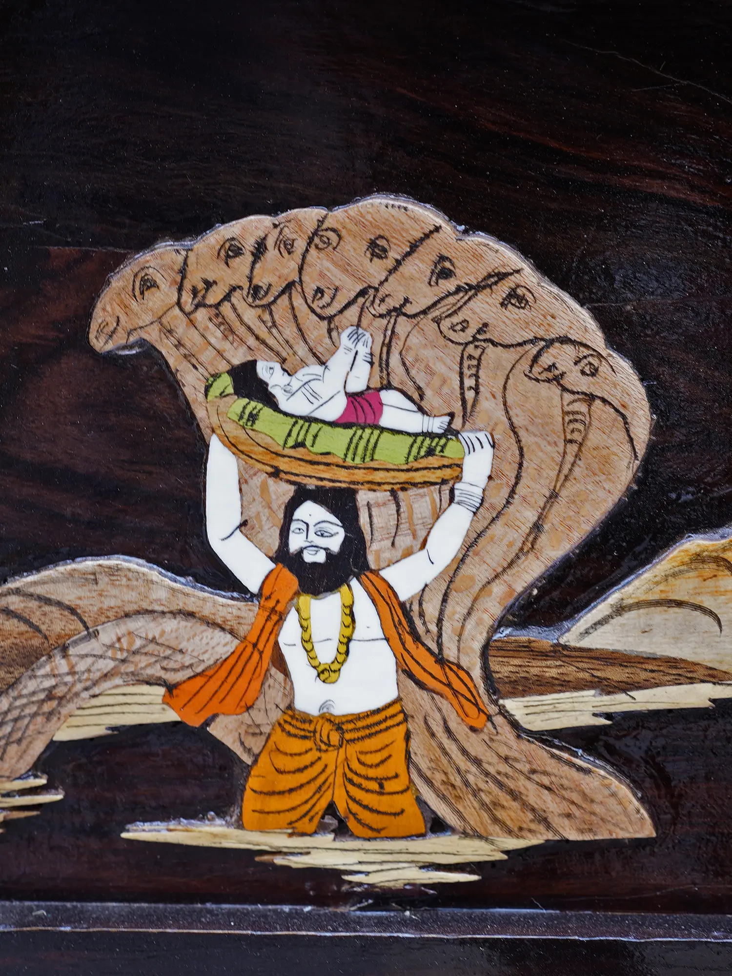 This artwork draws inspiration from the beloved tales of Radha and Krishna, central figures in Hindu mythology, representing the purest form of divine love and devotion. The surrounding vignettes meticulously illustrate key episodes from their spiritual journey, offering a comprehensive glimpse into their legendary romance and divine exploits. Its creation echoes the traditional Mysore inlay artistry, a cultural heritage celebrated for its exquisite craftsmanship and spiritual resonance.