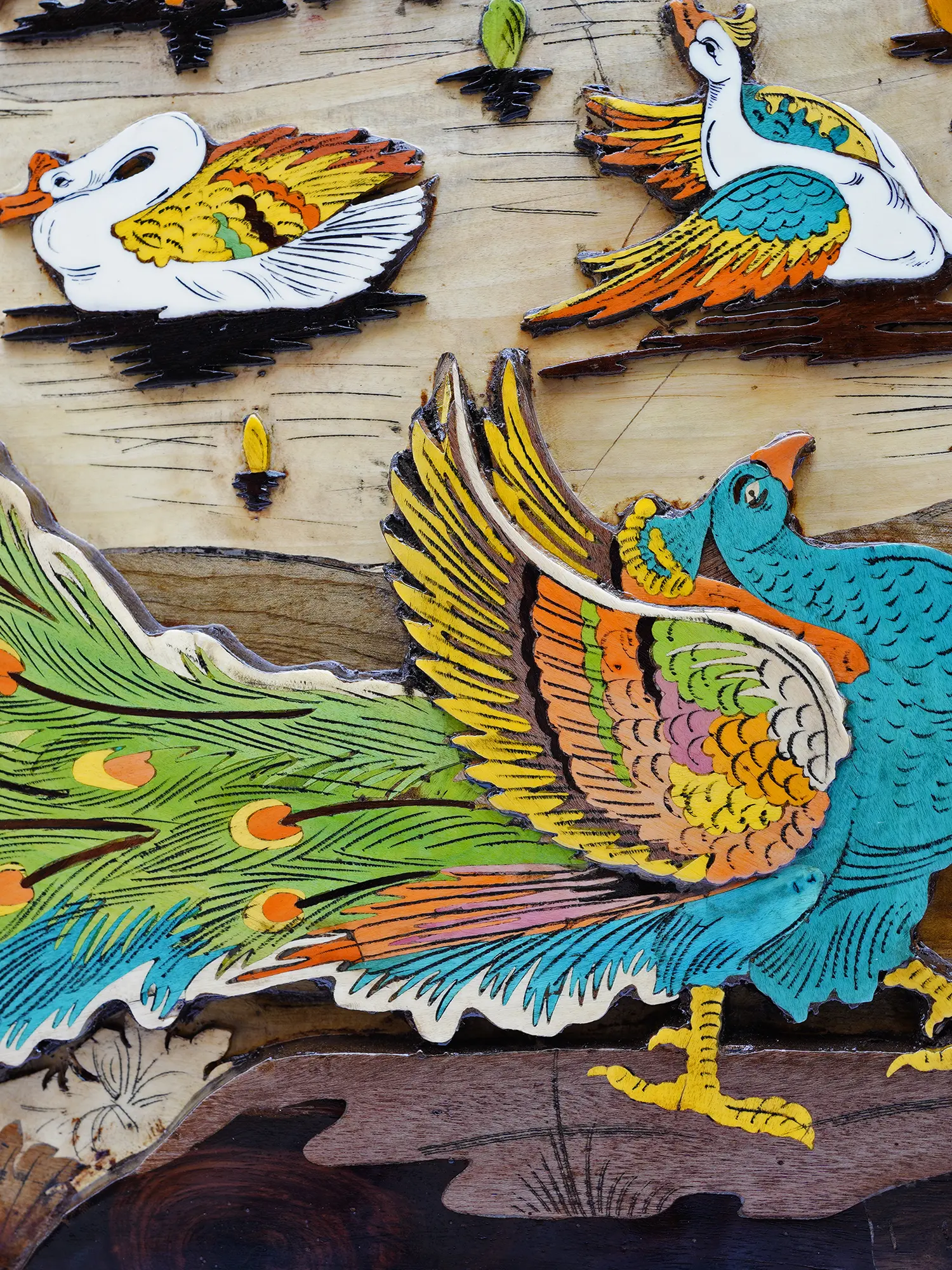 Crafted with meticulous dedication by master artisans, this piece is a testament to the enduring beauty of traditional inlay techniques. Each element is painstakingly carved from rich rosewood, a material prized for its deep, lustrous grain and inherent durability. The intricate inlay work, a symphony of contrasting woods and subtle colorations, is executed with breathtaking precision, revealing a depth and texture that only hands guided by generations of skill can achieve. The three-dimensional aspect of the carving adds a captivating realism, making the figures and their surroundings leap to life.