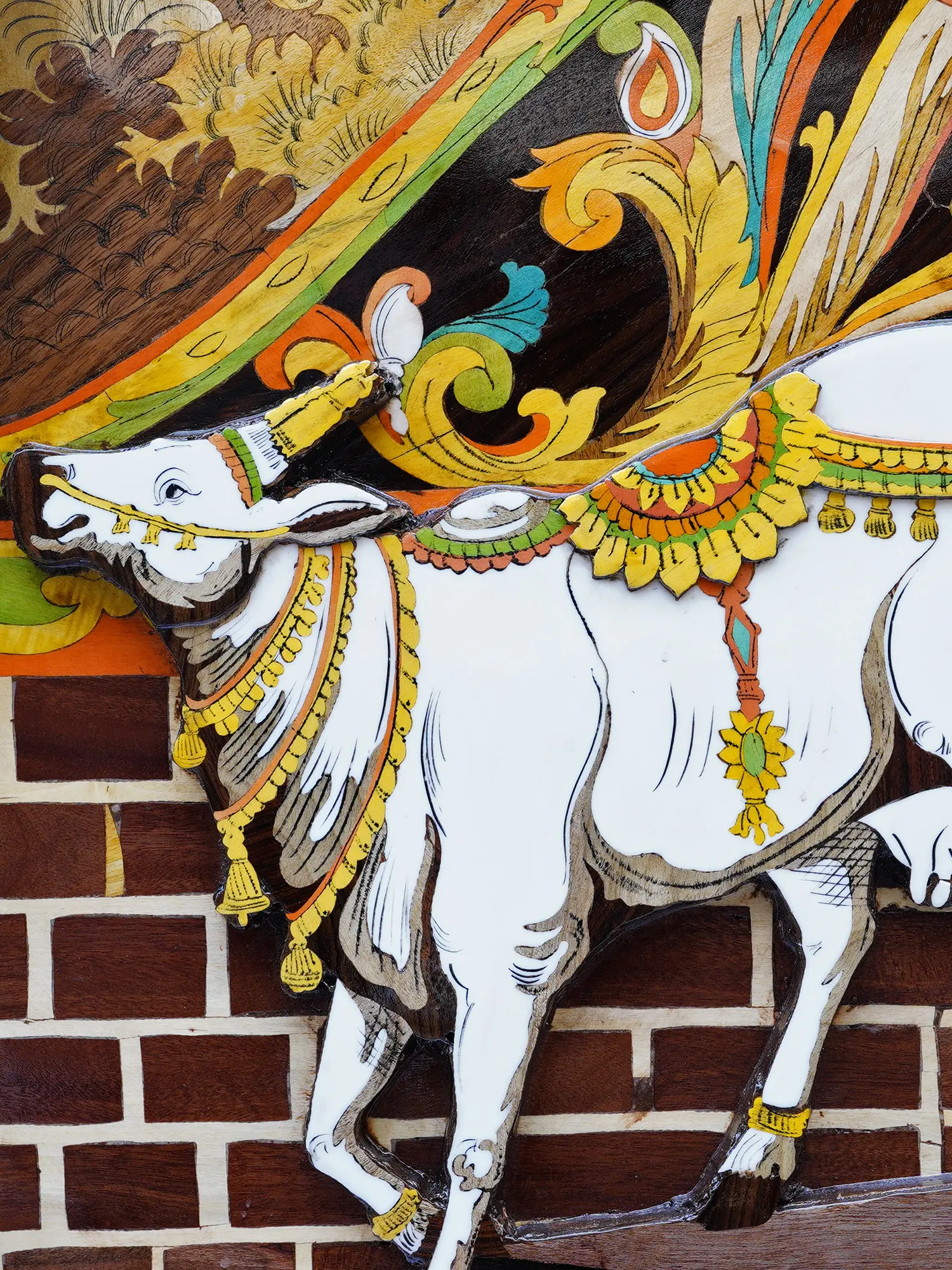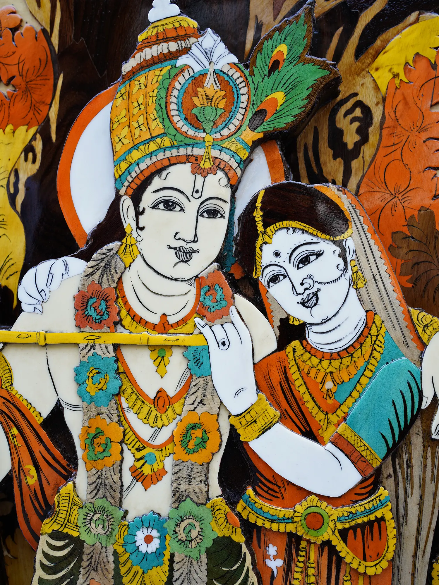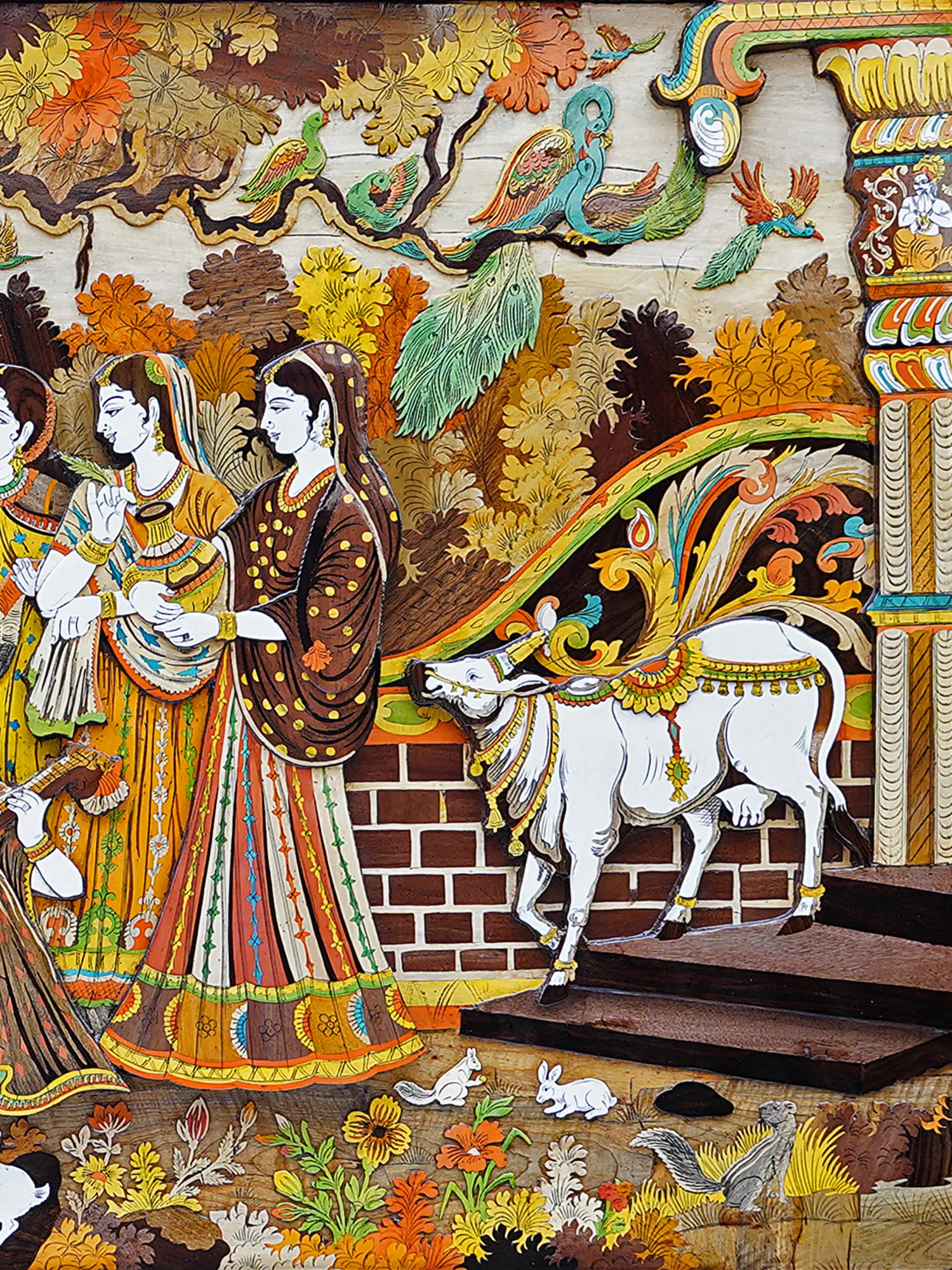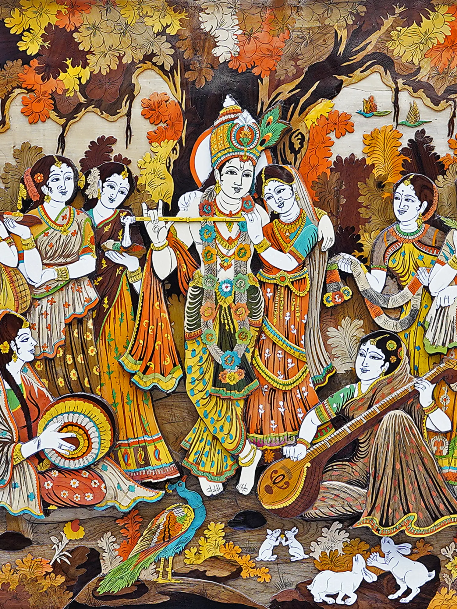 This artwork draws inspiration from the ancient traditions of Mysore inlay, a craft renowned for its exquisite detail and spiritual resonance. It vividly illustrates the enchanting tales of Lord Krishna's divine pastimes in Vrindavan, moments often depicted in classical Indian literature and devotional art. The scene evokes a sense of transcendental bliss, capturing the deep spiritual connection between the divine and his devotees, a timeless theme that continues to inspire awe and contemplation.