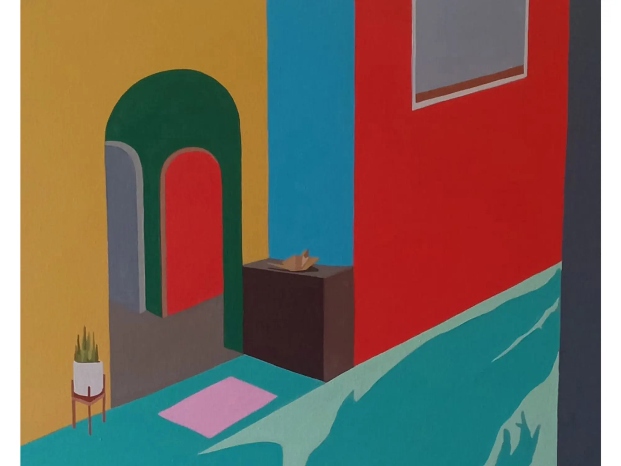The artwork presents a striking architectural interior, rendered with a modern sensibility. Its generous 30 by 24-inch dimensions allow for a commanding presence, while the carefully chosen palette—from warm ochre and vibrant red to serene blues and greens—creates an immersive visual experience. Notice how the sharp lines and geometric forms contrast with the soft, ephemeral silhouette cast upon the floor, a dynamic interplay that defines the scene. The subtle inclusion of domestic elements grounds the composition, adding layers of intrigue.