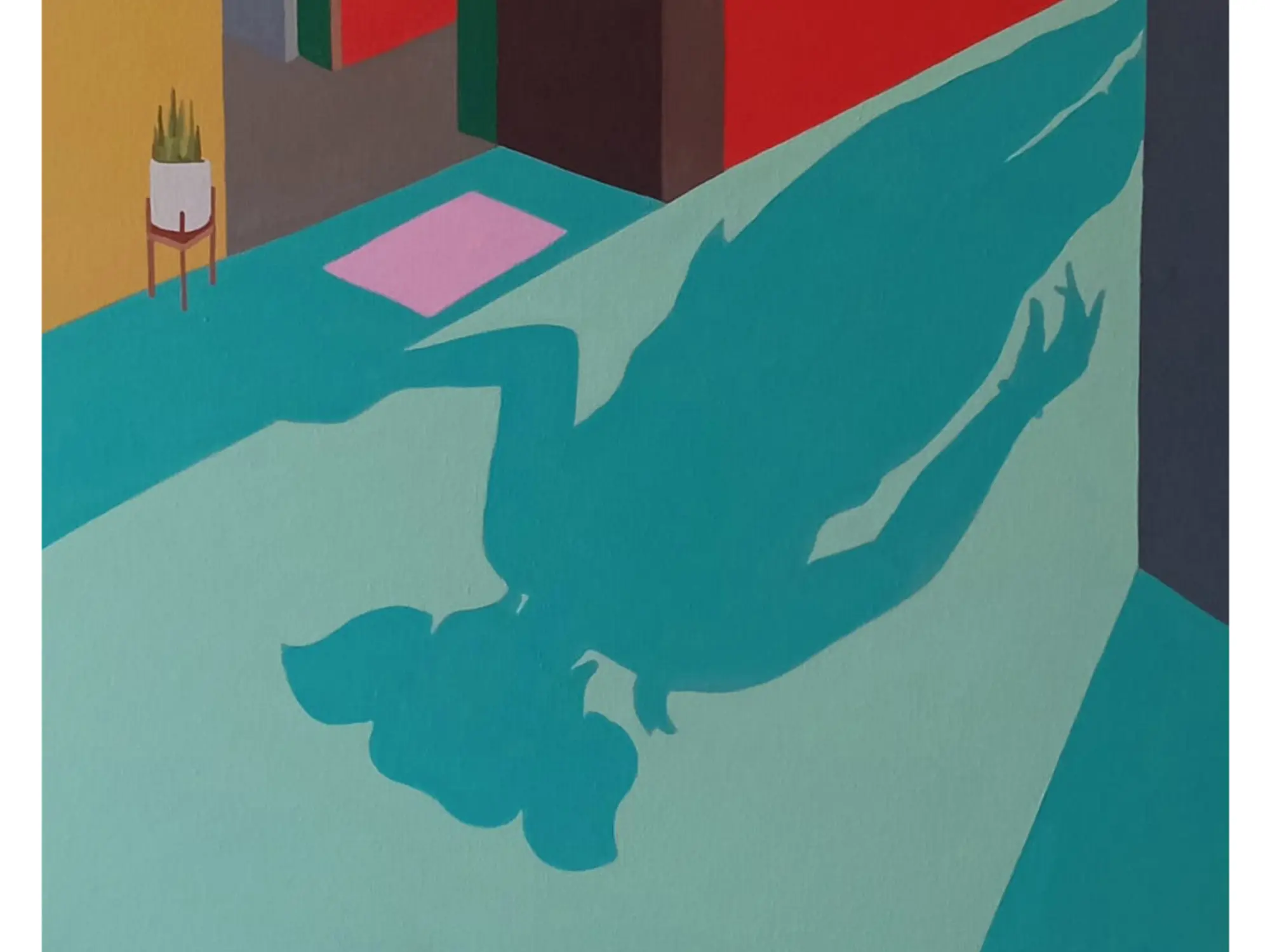 This piece can be seen as an exploration of the internal world, where shadows represent unspoken thoughts, hidden emotions, or the spectral presence of oneself within a given environment. It resonates with themes of introspection and the self, inviting viewers to project their own narratives onto its evocative landscape. The artistic style, with its flat planes of color and simplified forms, evokes a sense of distilled reality, akin to memories or dreams made tangible.